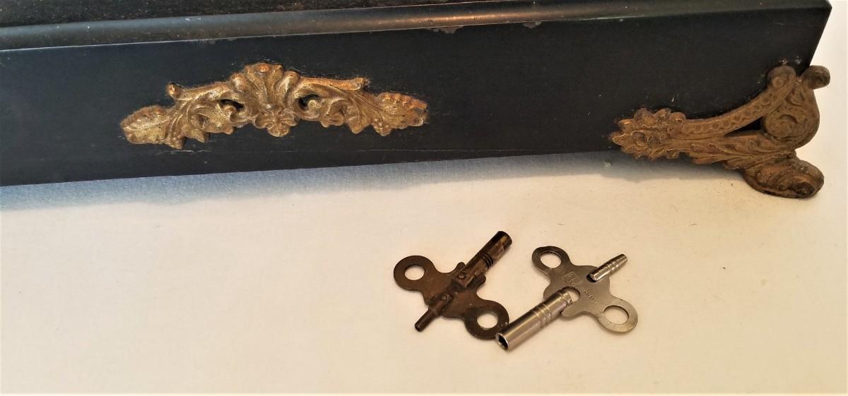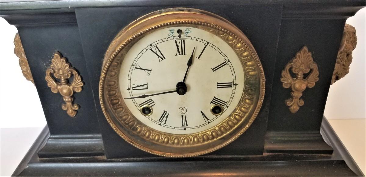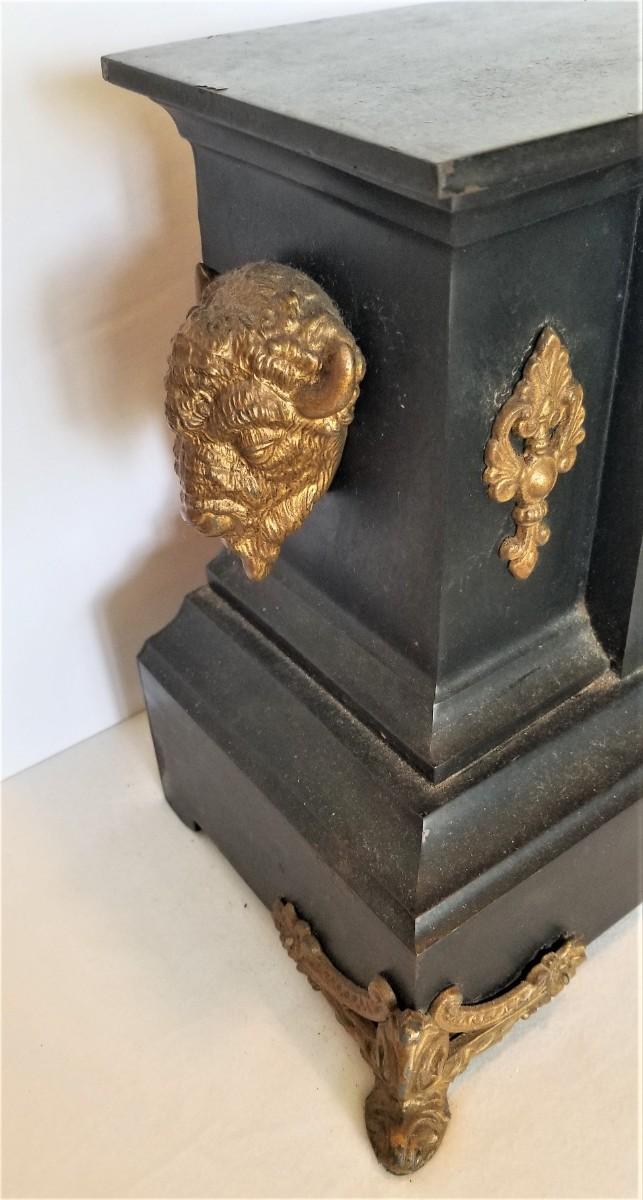 This late 19th century mantle clock is a project piece. Chimes the hour and the half - has the pendulum - complete, but is a victim of overwinding. Heavy. Interesting Buffalo head motif on the sides. The case is in good antique condition. With a little work this piece could be brought back to life.