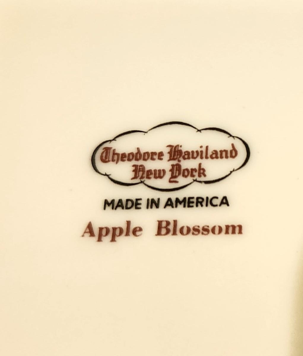 Lovely antique set of Theodore Havilland china in the Apple Blossom pattern. You get all you see here: 8 10" lunch plates, 1 meat platter (16.25"), 8 soup bowls, 2 dinner plates (10.5"), 11 cups/saucers, 8 bread/butter plates, vegetable dish, covered vegetable dish, Handled serving bowl, 9 salad plates. All in nice condition.