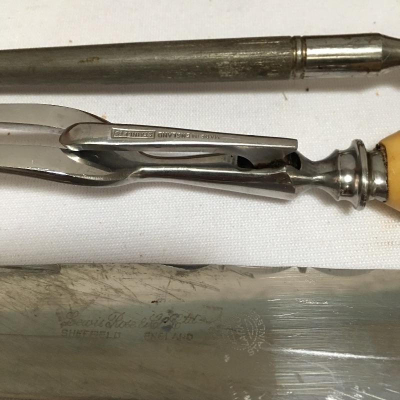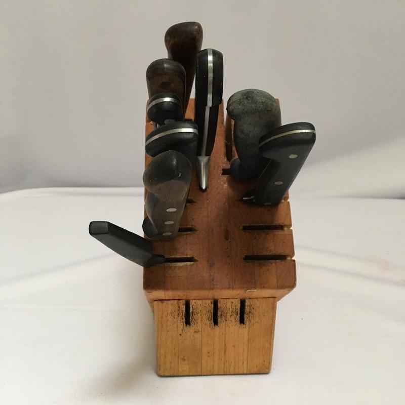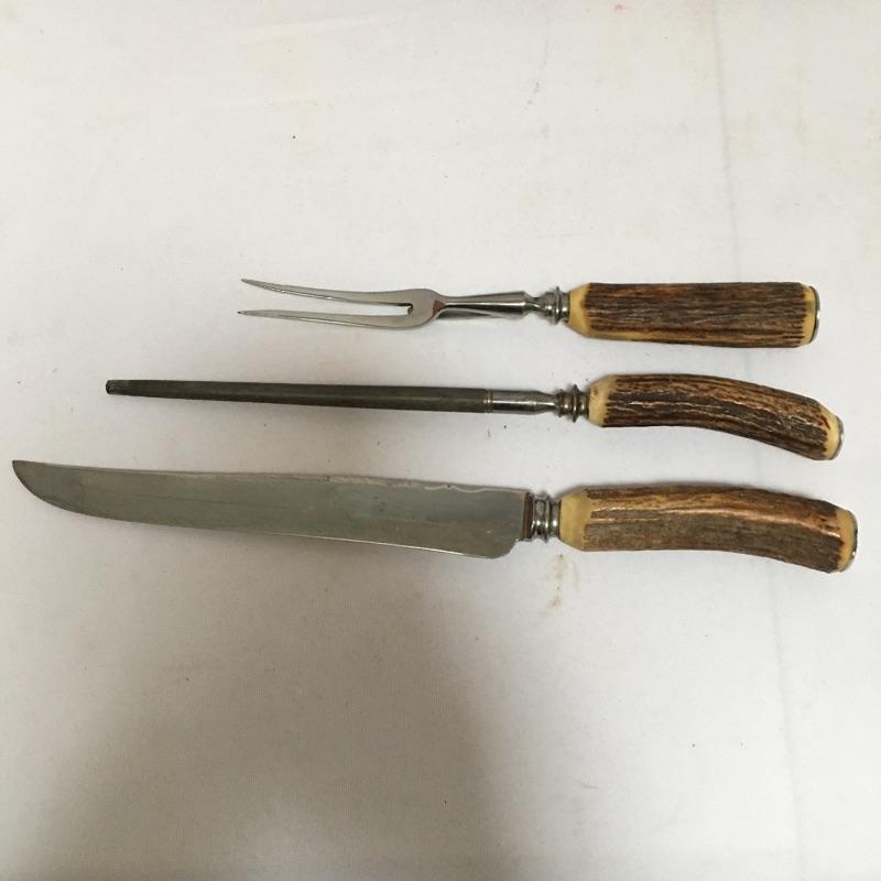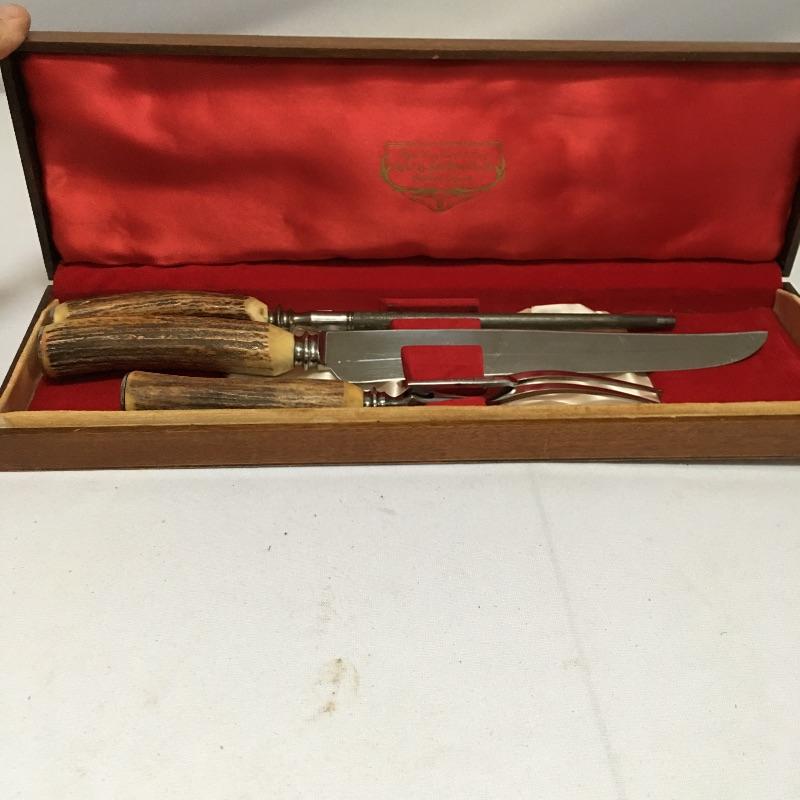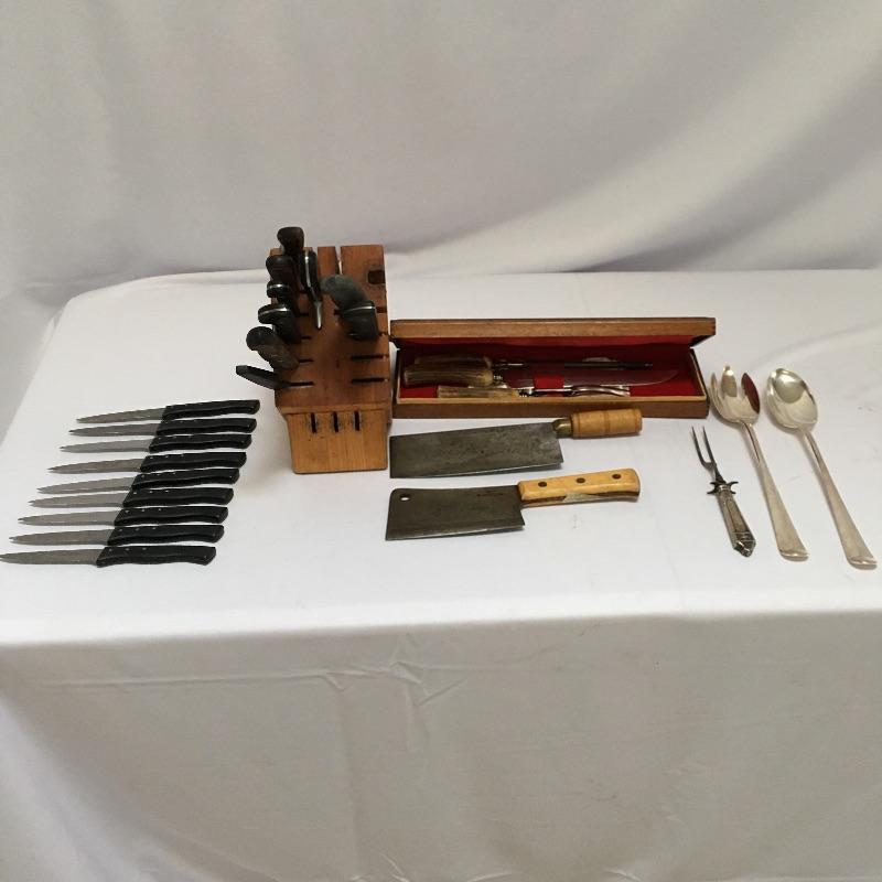 Array of knives and serving utensils includes knife block with nine knives, JA Henckel and Hoffritz butcher knives, nine Nogent Tichet steak knives Gerity silver plated spoon and fork and carving set Lewis Rose & Co. with stag horn handles. Carving set case measures 4.75” x 15.75” x 1.75”.