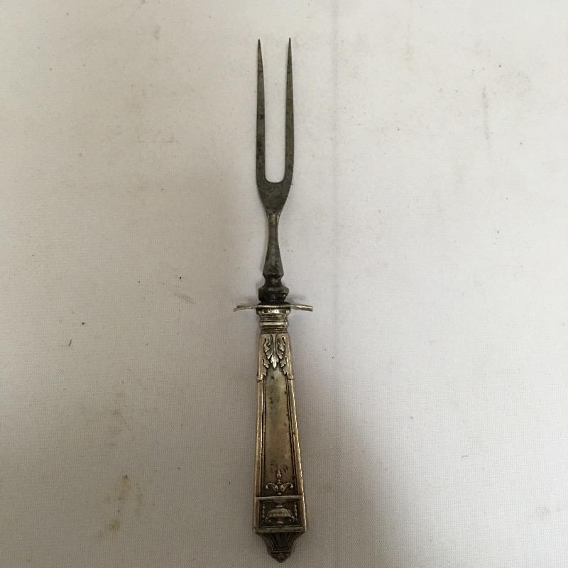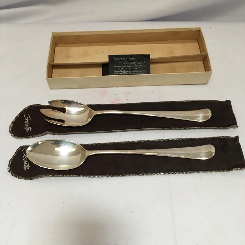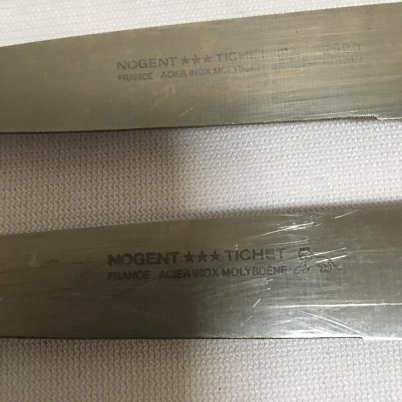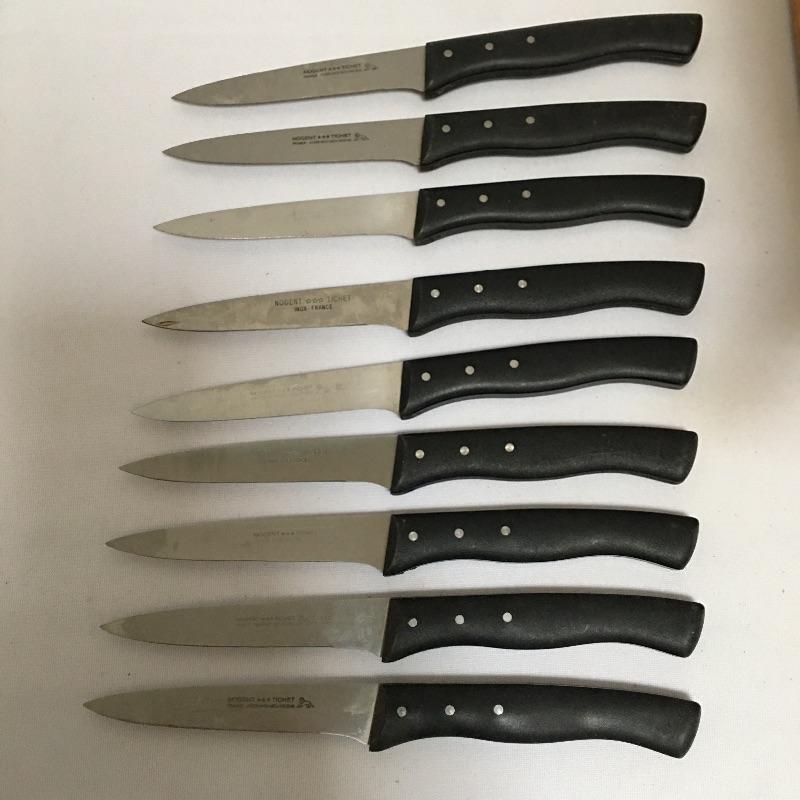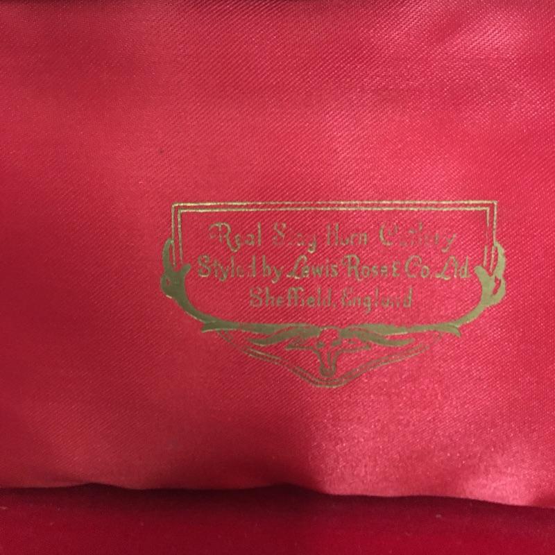 Array of knives and serving utensils includes knife block with nine knives, JA Henckel and Hoffritz butcher knives, nine Nogent Tichet steak knives Gerity silver plated spoon and fork and carving set Lewis Rose & Co. with stag horn handles. Carving set case measures 4.75” x 15.75” x 1.75”.