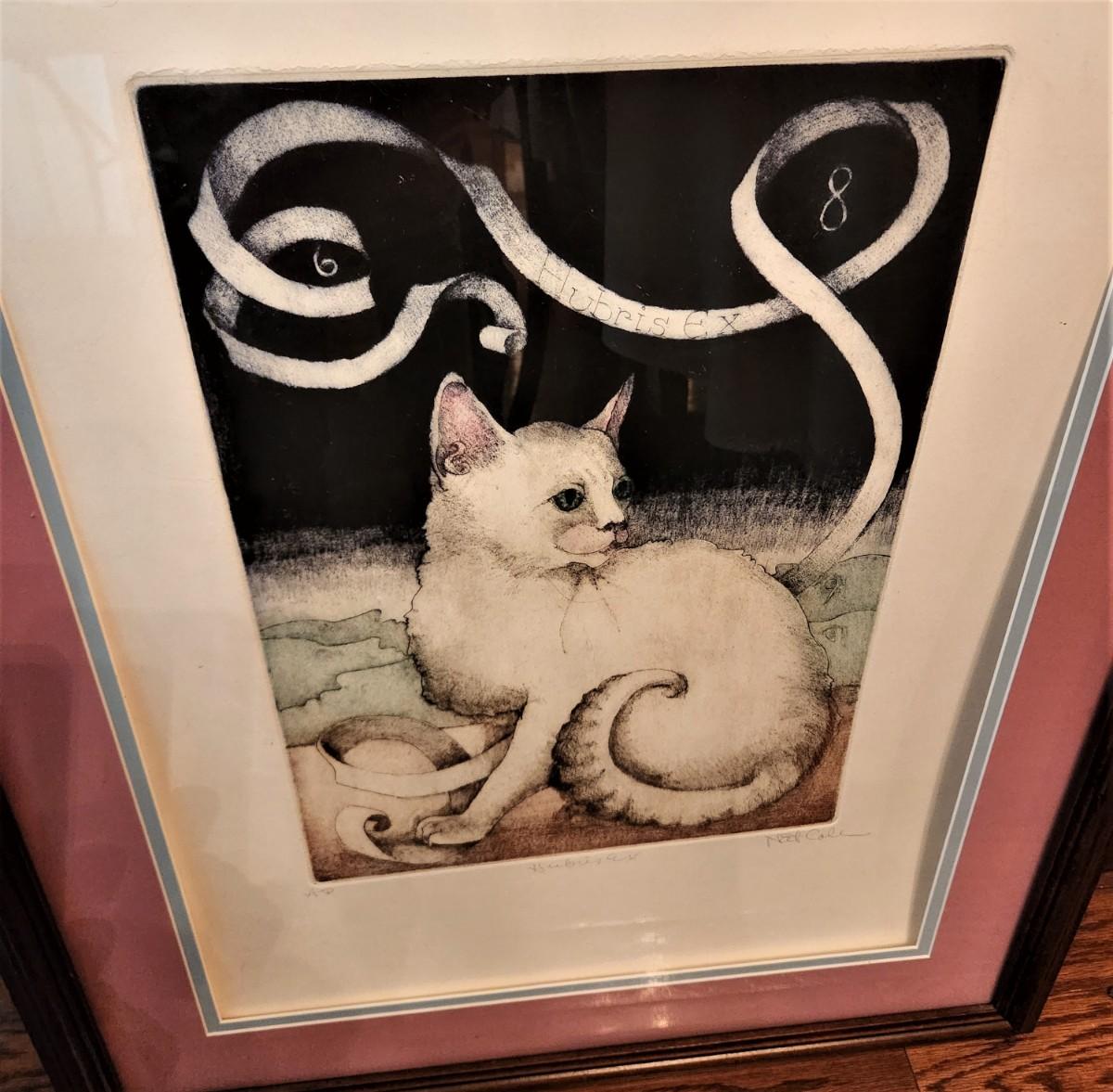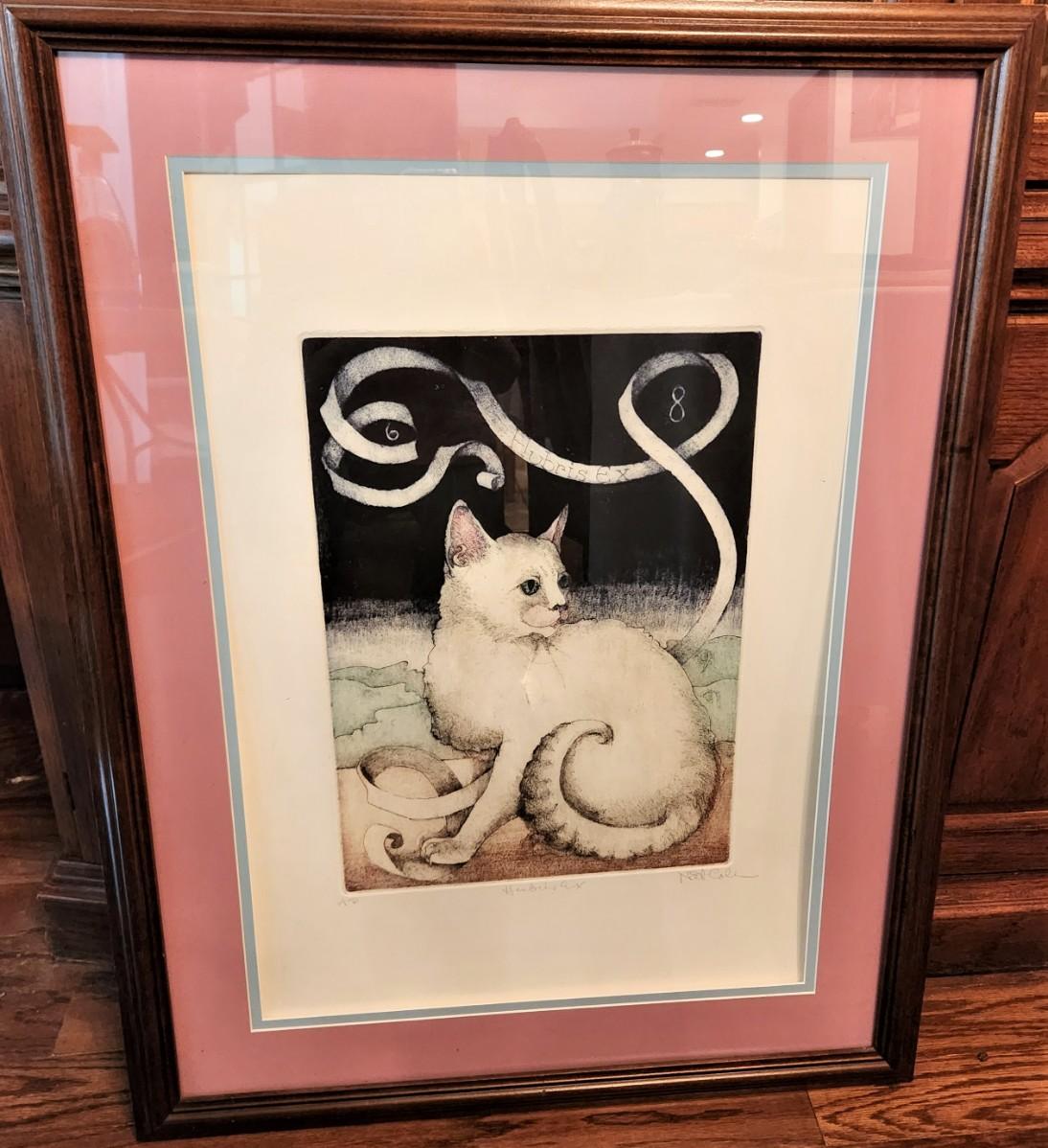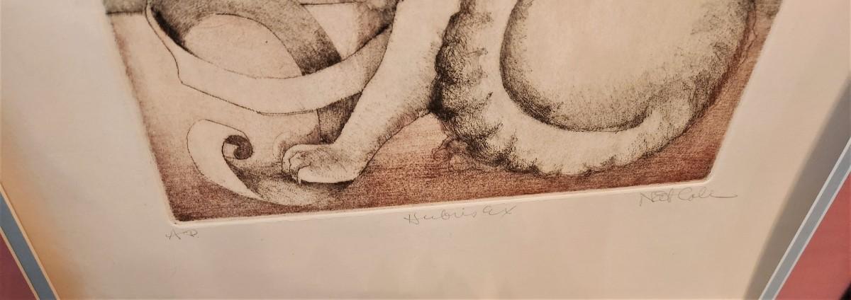 The name of the work is pencil written across the bottom along with the Artist Proof mark and Ned Cole's signature, but we couldn't make it out. Metaphysical looking cat surrounded by mystical symbols - can you tell my client had a thing for cats? Double matted - good condition. 26" across, 35" tall.