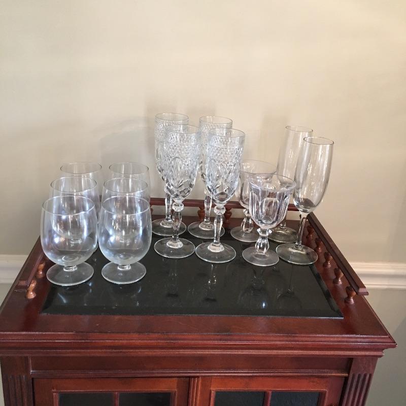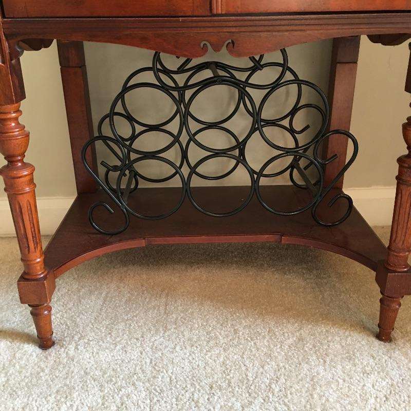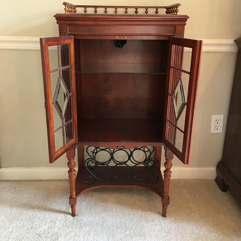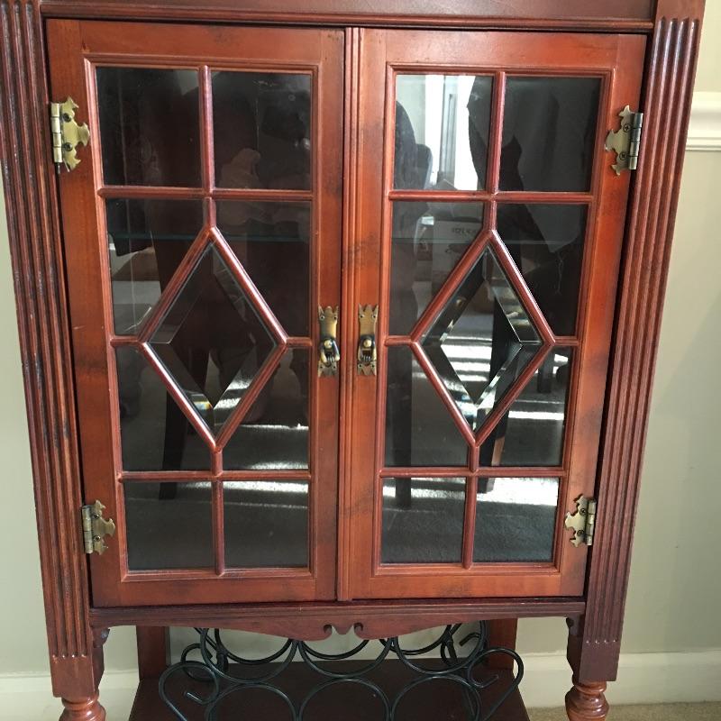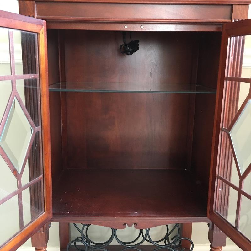 Beautiful bar cabinet has beveled glass and wooden doors with a adjustable glass shelf and what appears to be a stone top and a shelf underneath. Also includes metal wine rack and a assortment of glasses.