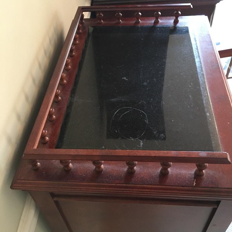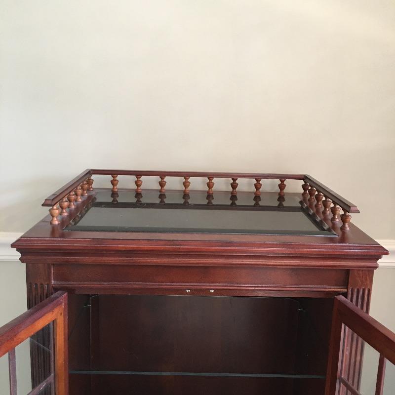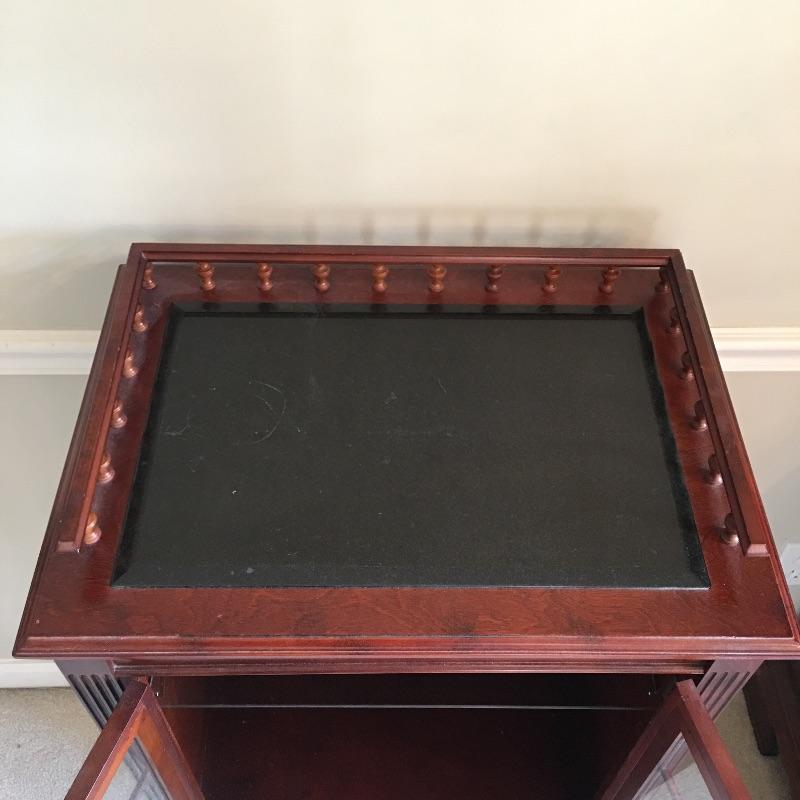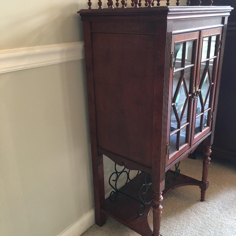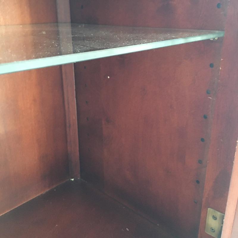 Beautiful bar cabinet has beveled glass and wooden doors with a adjustable glass shelf and what appears to be a stone top and a shelf underneath. Also includes metal wine rack and a assortment of glasses.