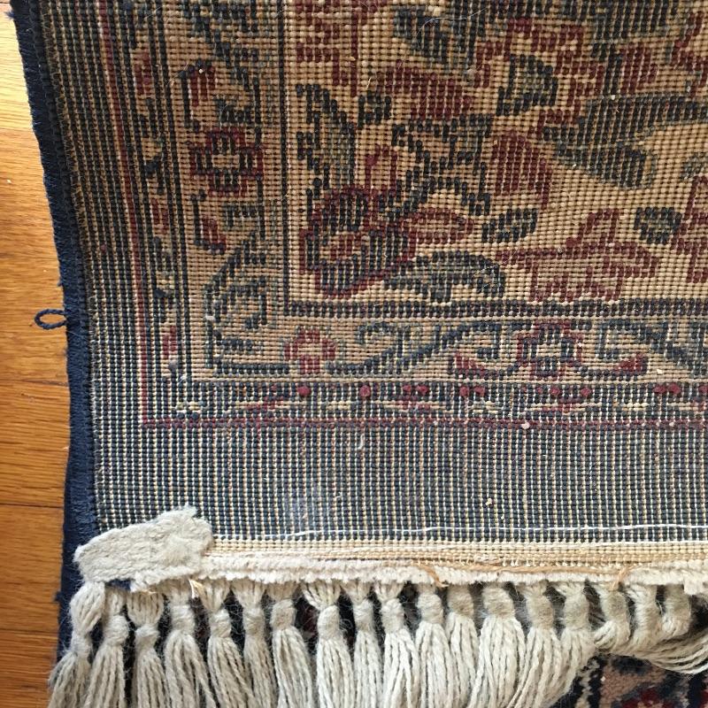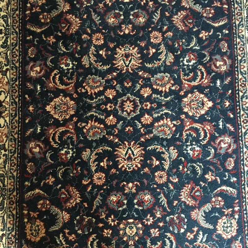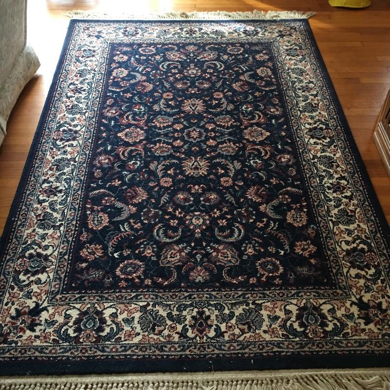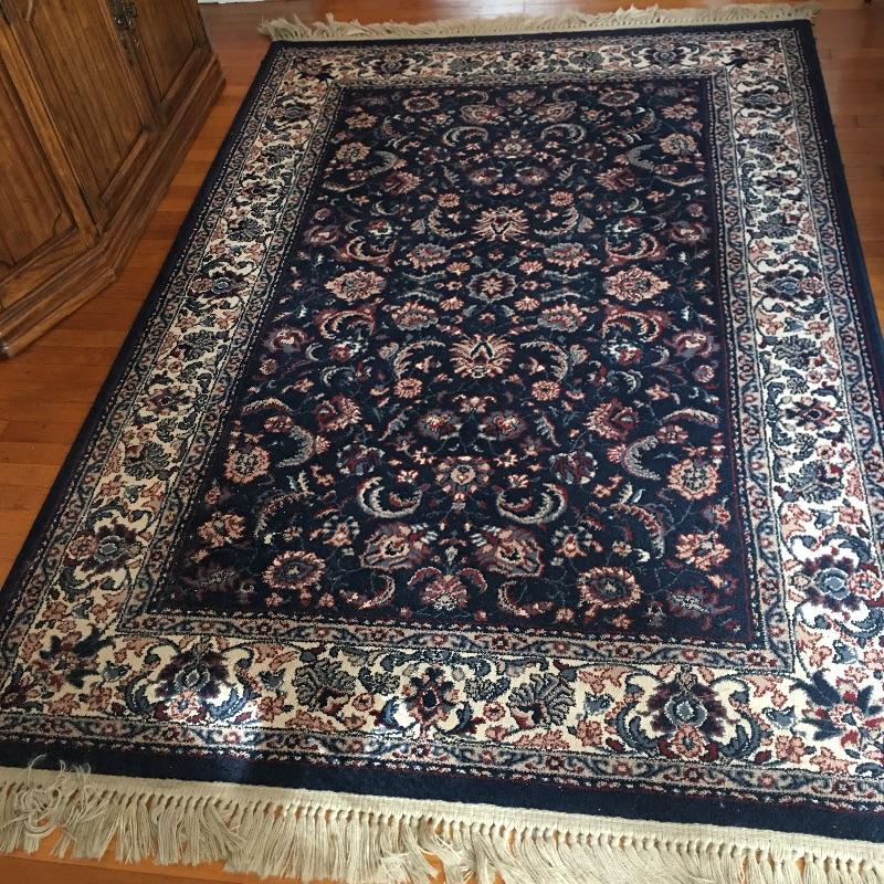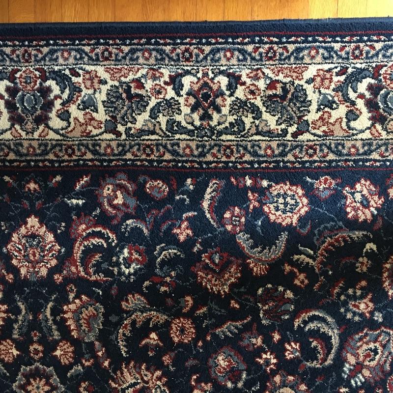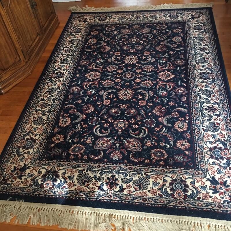 Blue area rug in a nice dark color to hide dirt!. Protect your floors with this nice area rug in a classic look. Rug measures 63.5” x 102.5”. No stains found, but could use a cleaning.