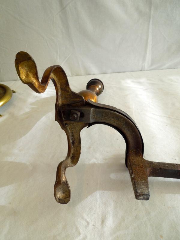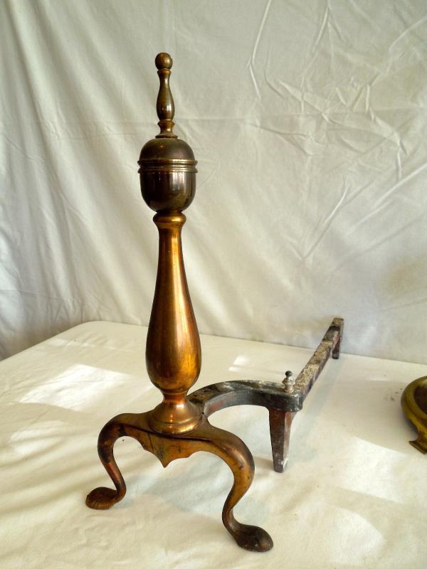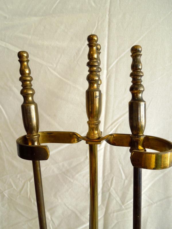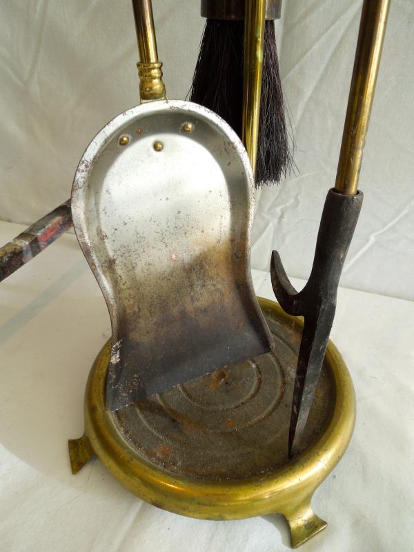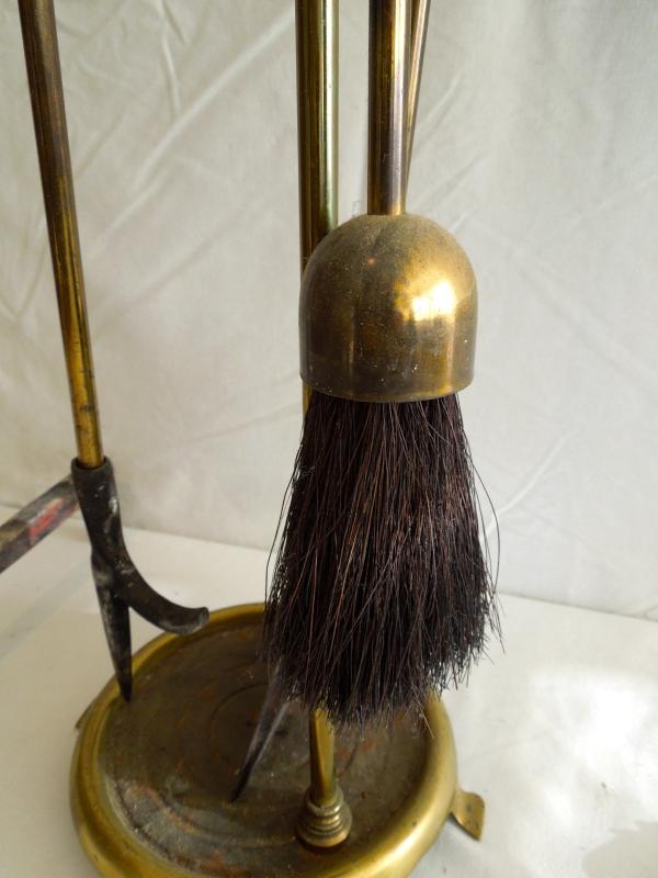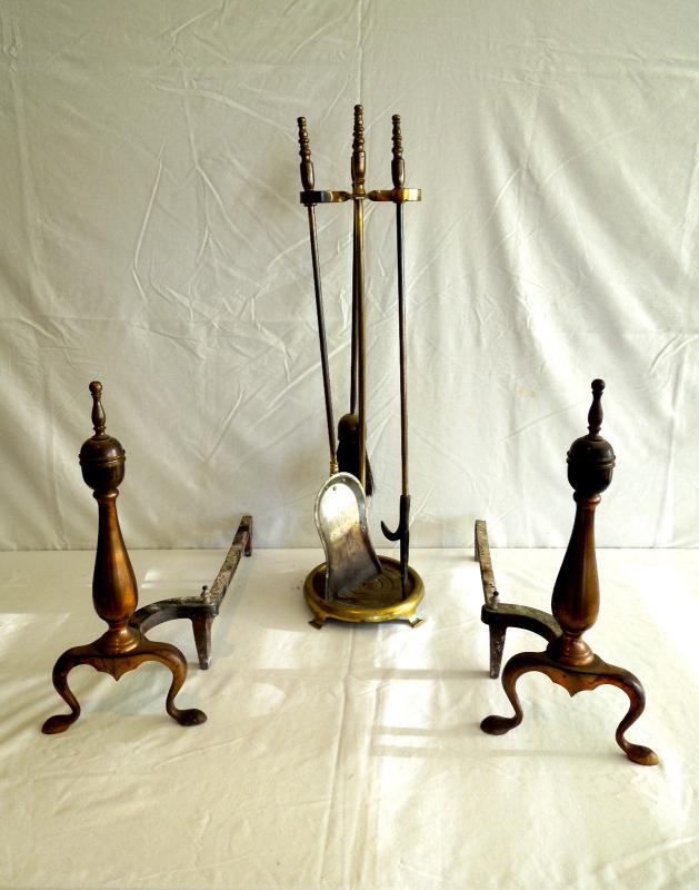 all pieces are brass. In good used condition. Soiled. No damage noted. Tool set is 30" H x 8" W. Andirons measure 19" L x 17" H x 8" W