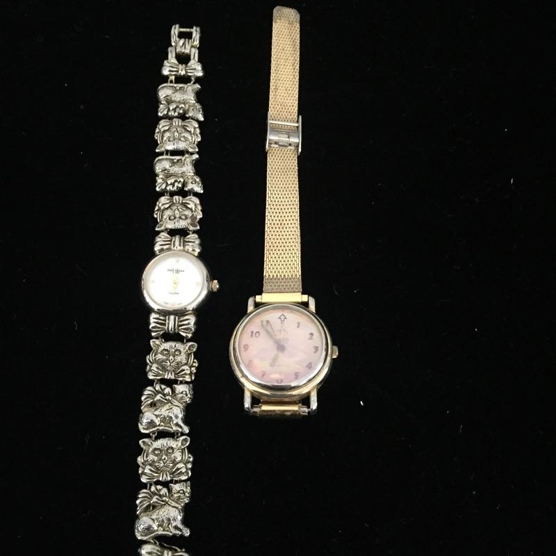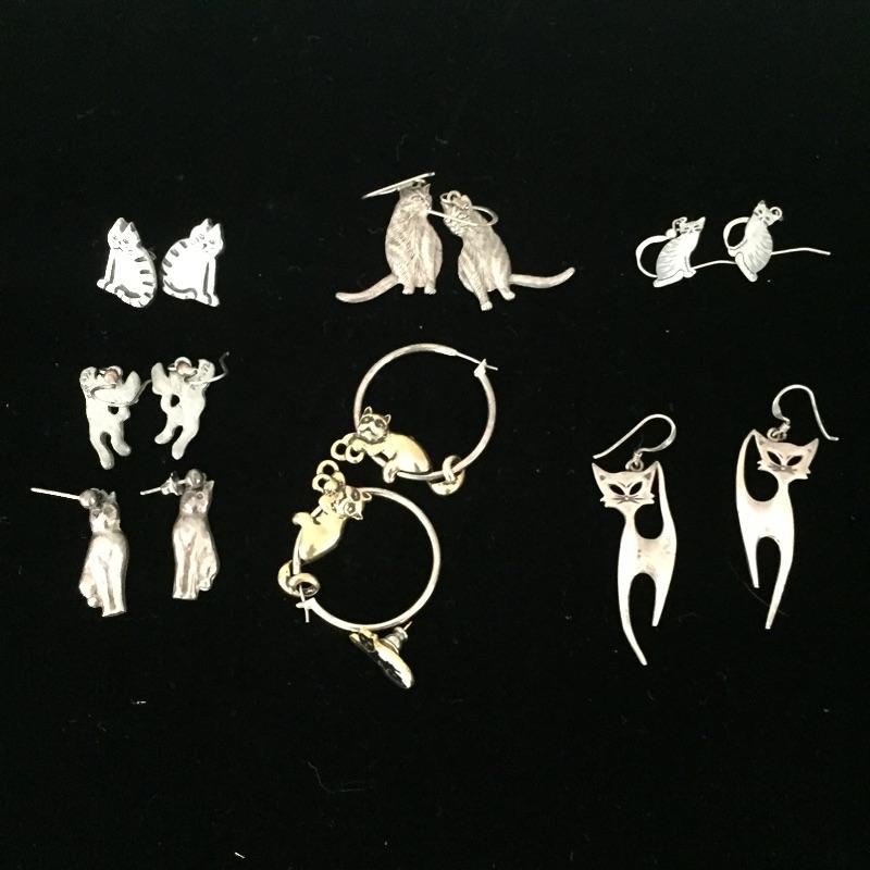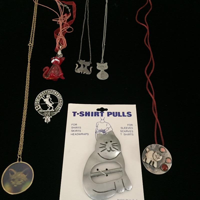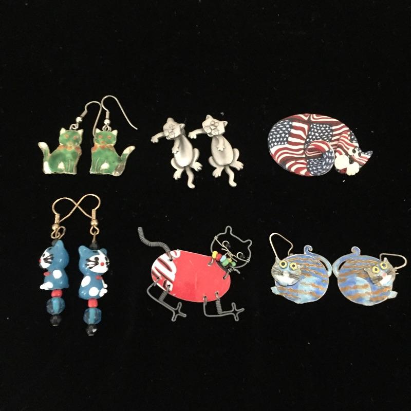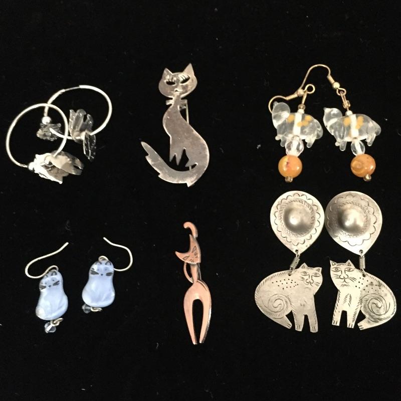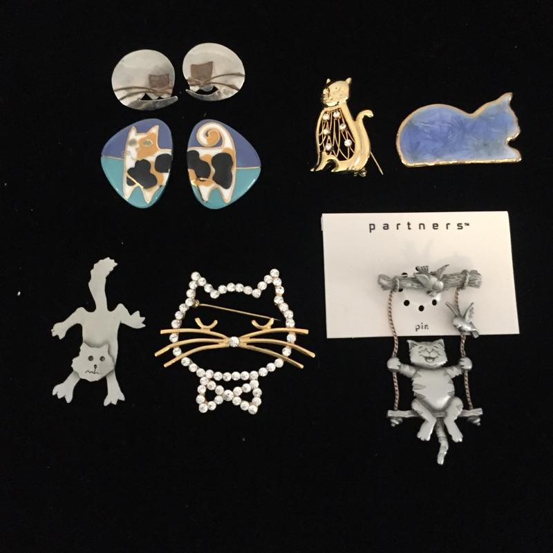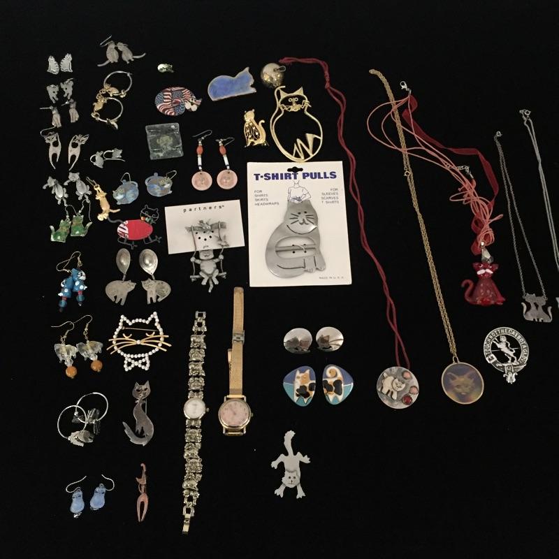 Mélange of cat jewelry includes pins, earrings, watches, cat bell and more.