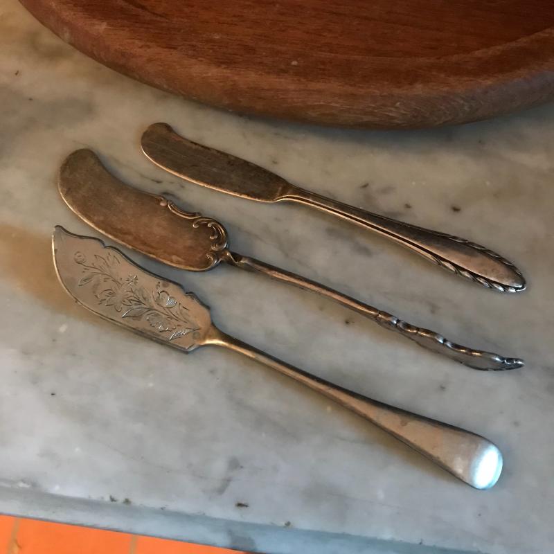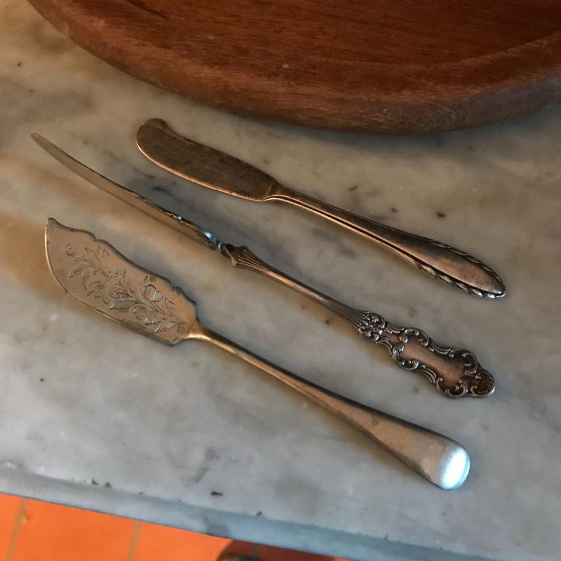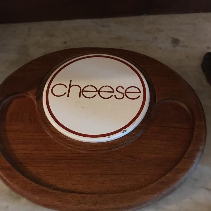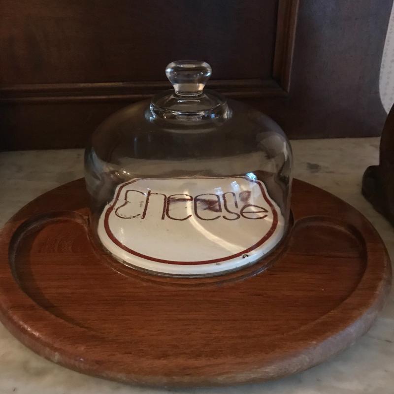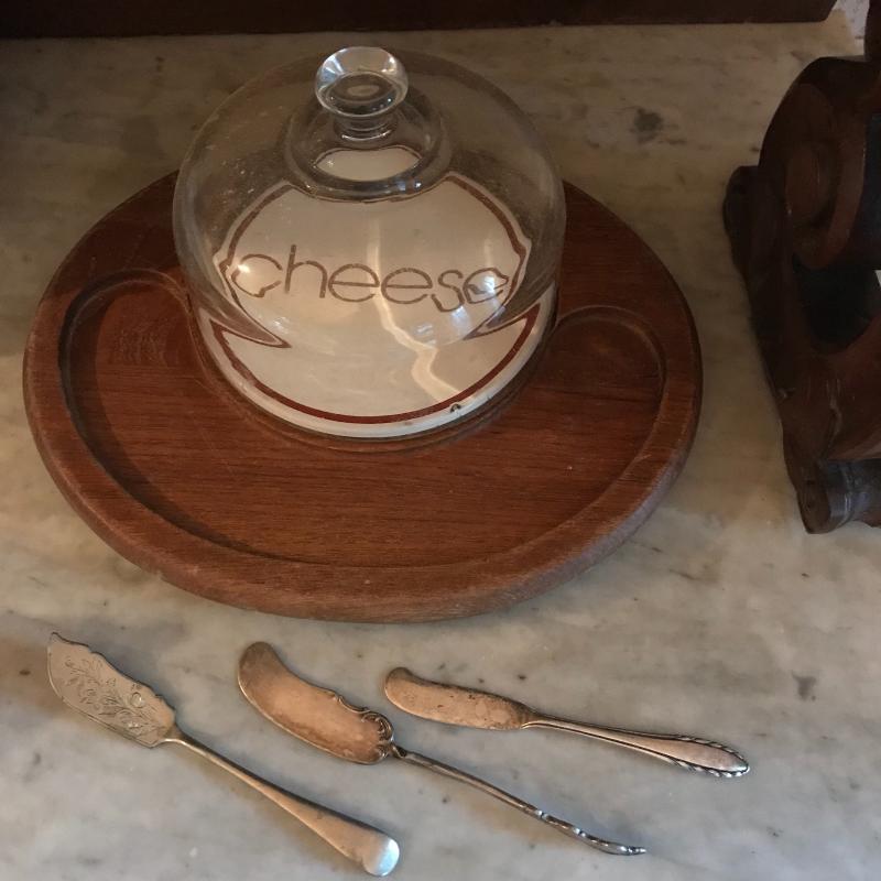 Wood platter with ceramic tile and glass dome to keep your cheese display fresh. 3 Decorative Silverplate knives. Lot is available for shipping or local pick up in a Flat Rock, NC.