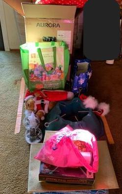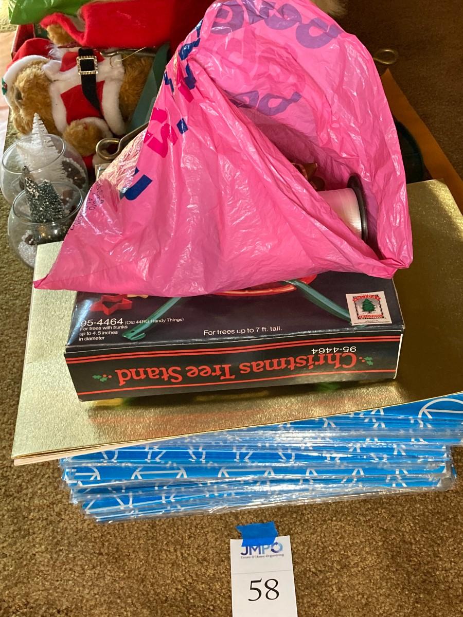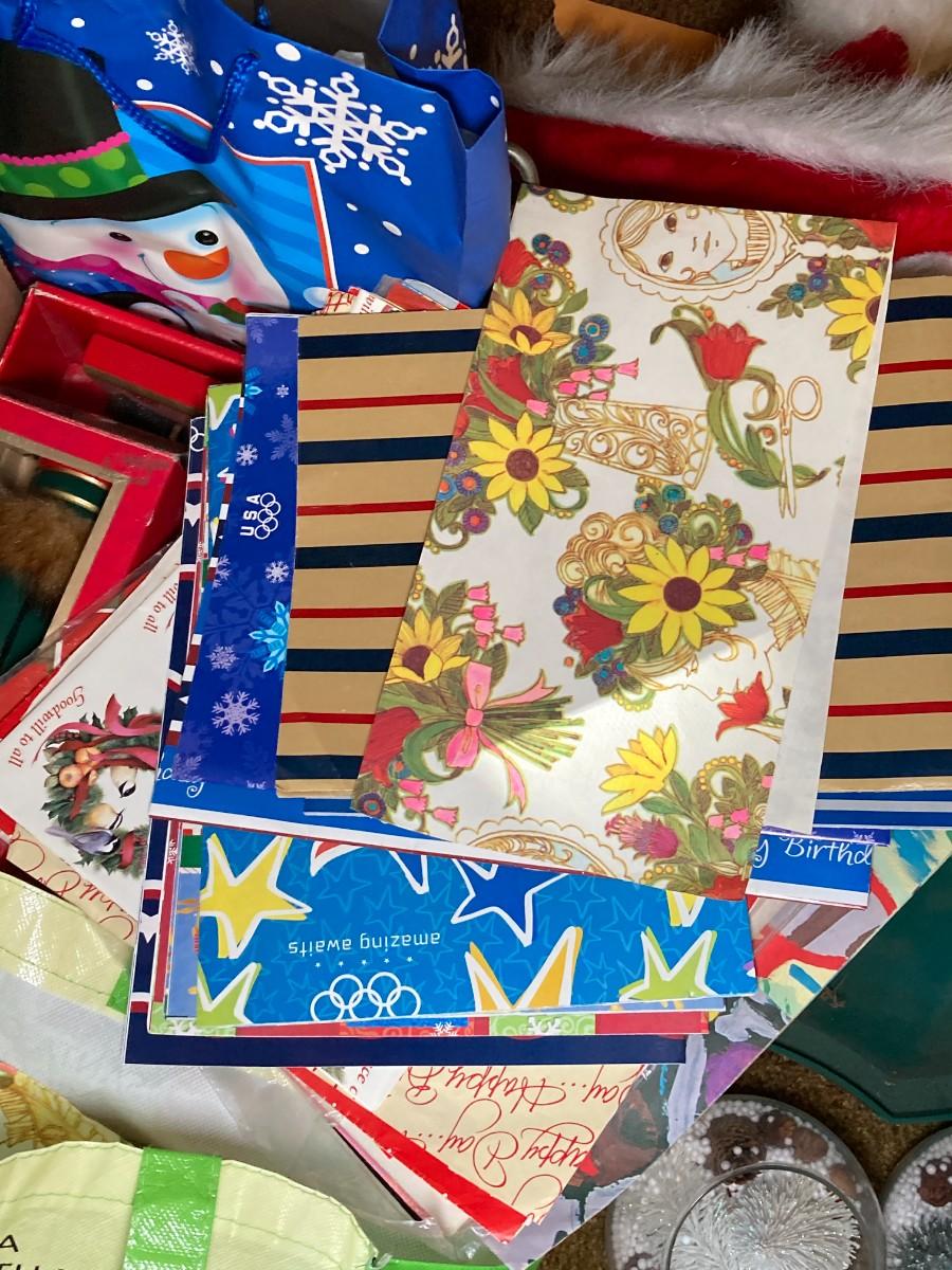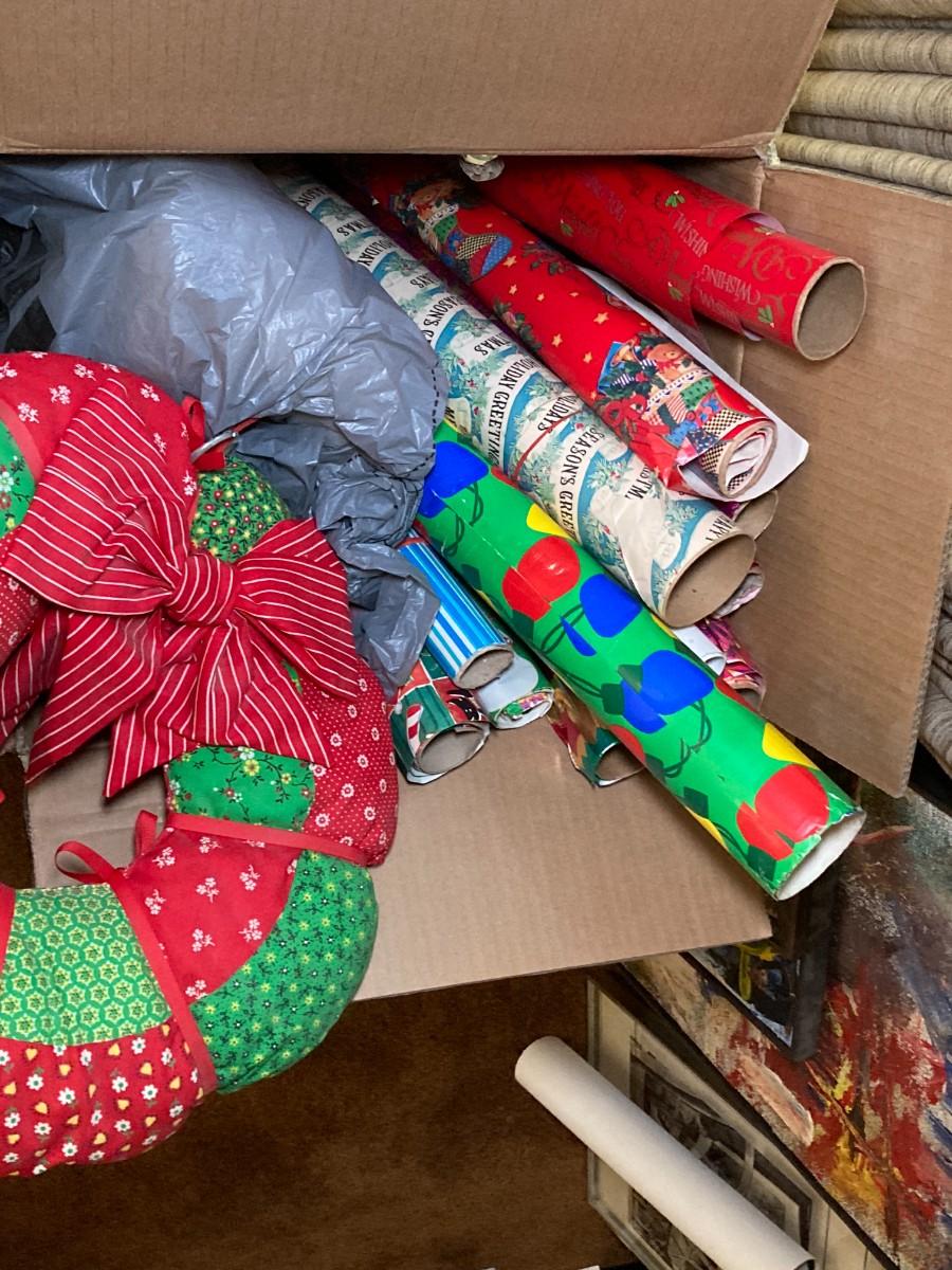 Christmas and gift wrap for all seasons. Includes stack of new, folded blue and white gift wrap.