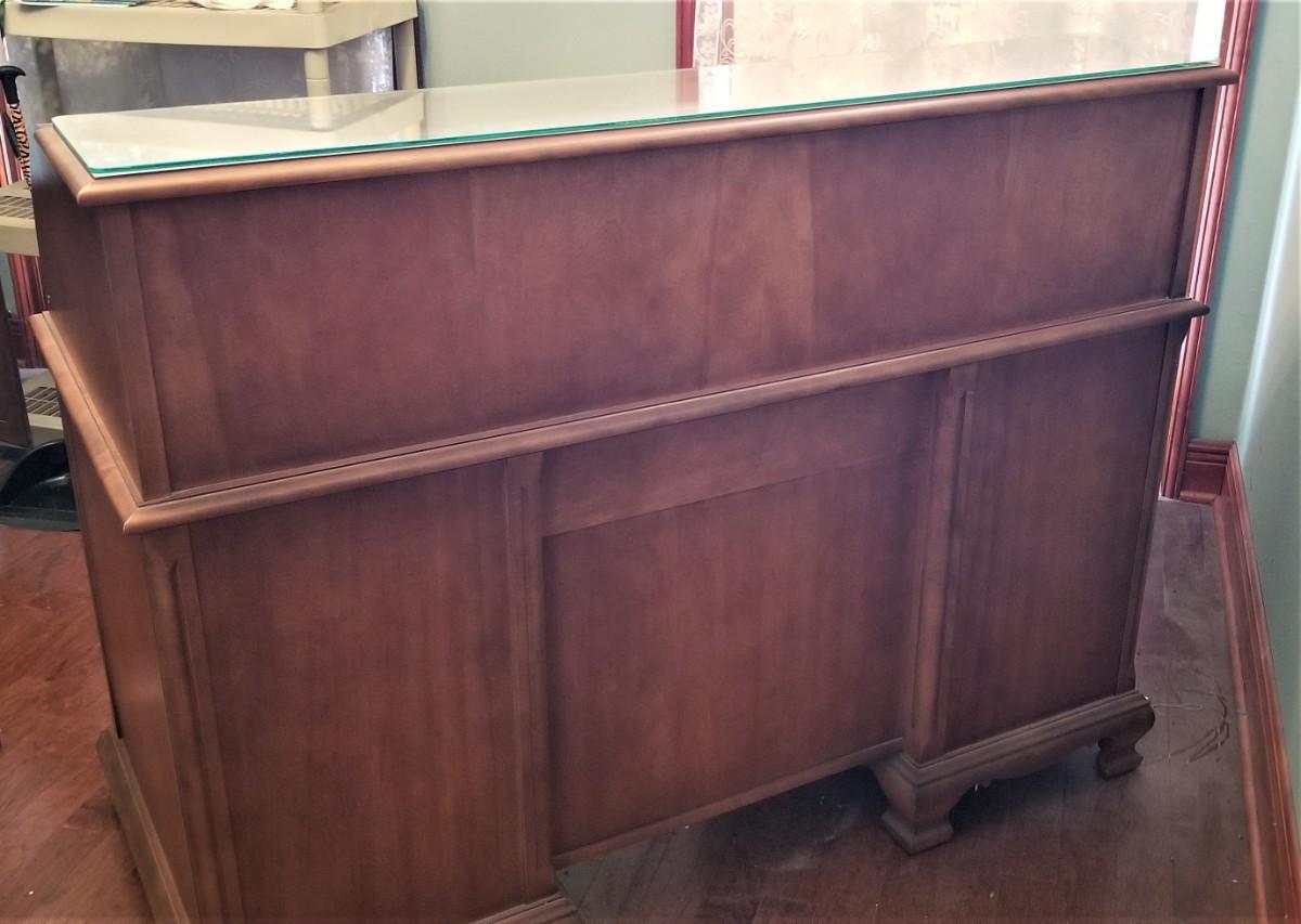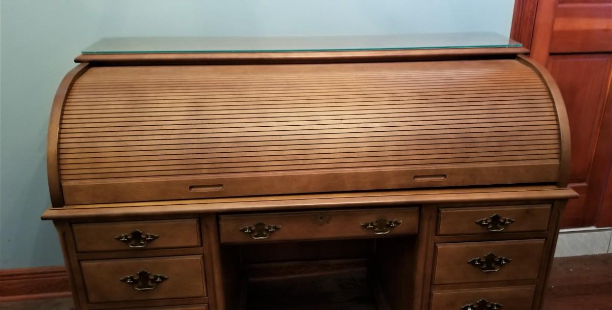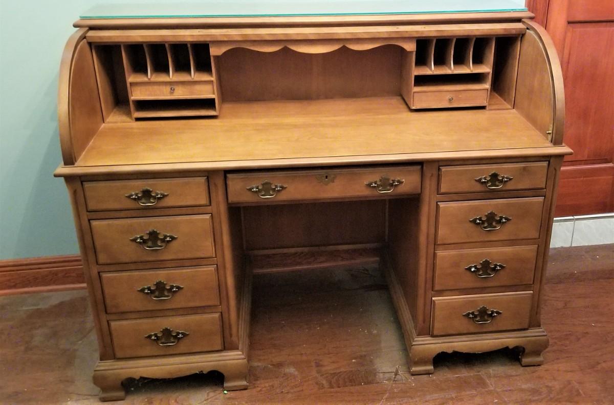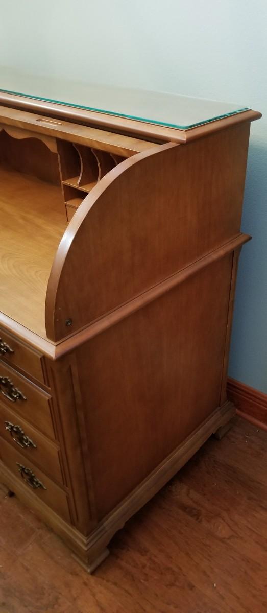 This contemporary roll top desk has no maker's mark - tempered glass cut to fit the top. Doesn't lock. 54" across, 26" deep, 41.5" tall. Lots of storage - gently used.
