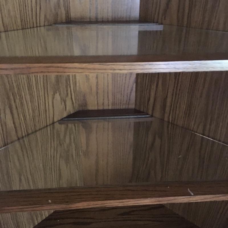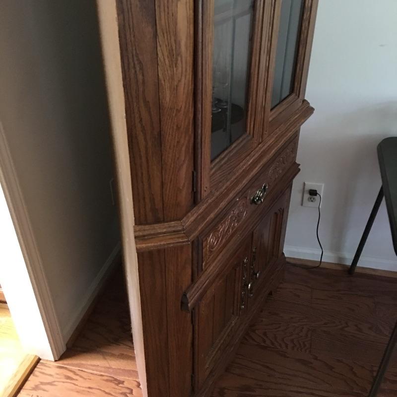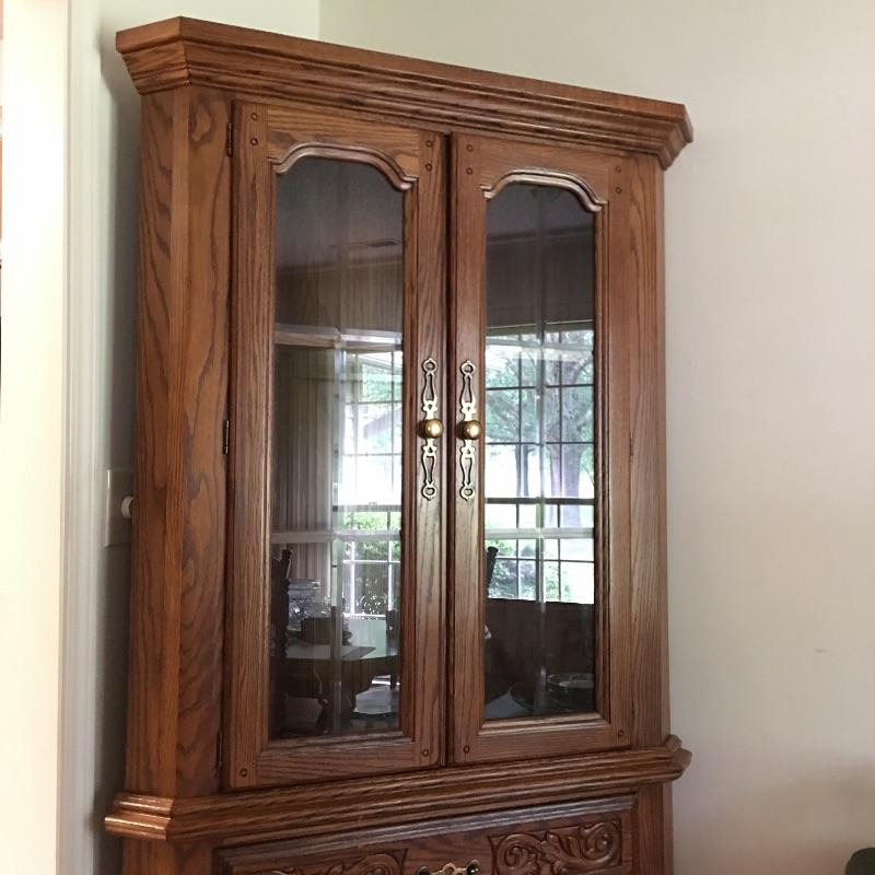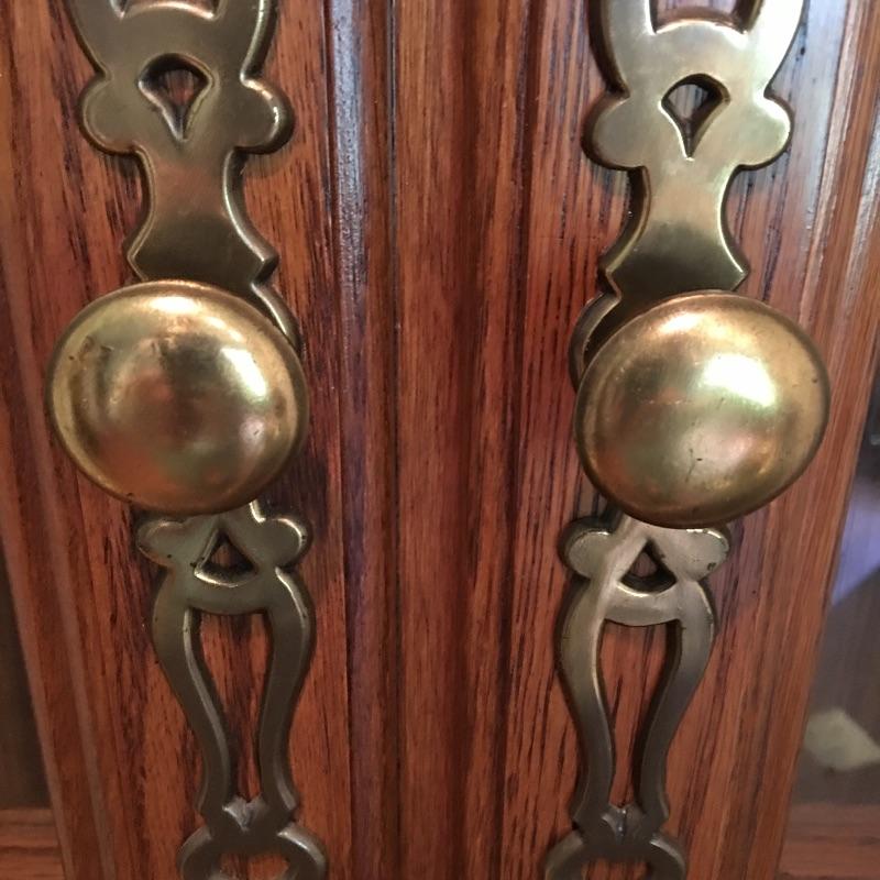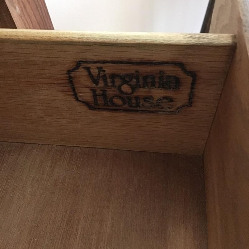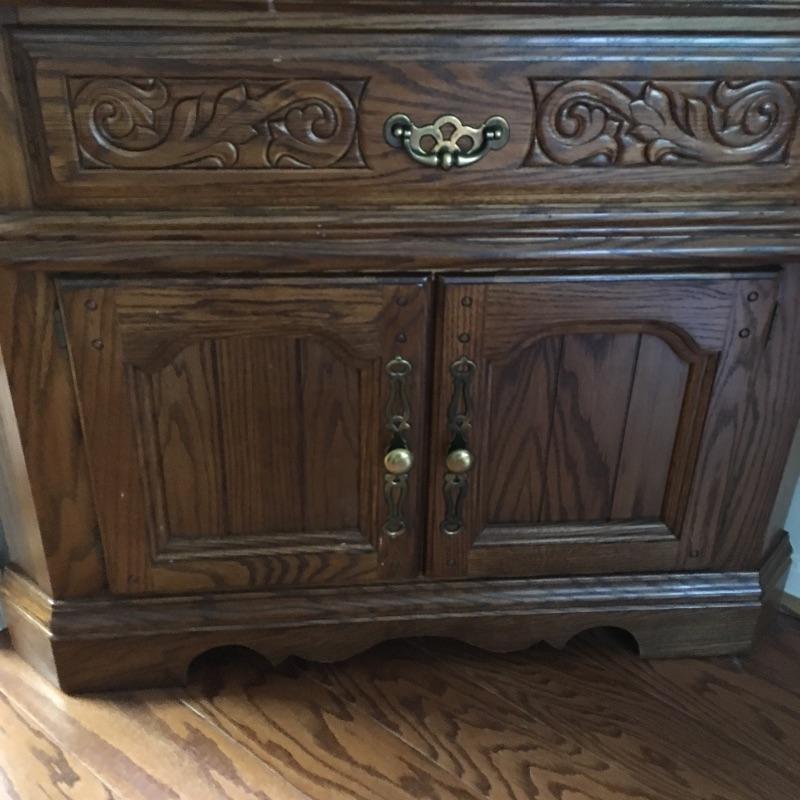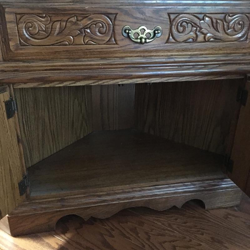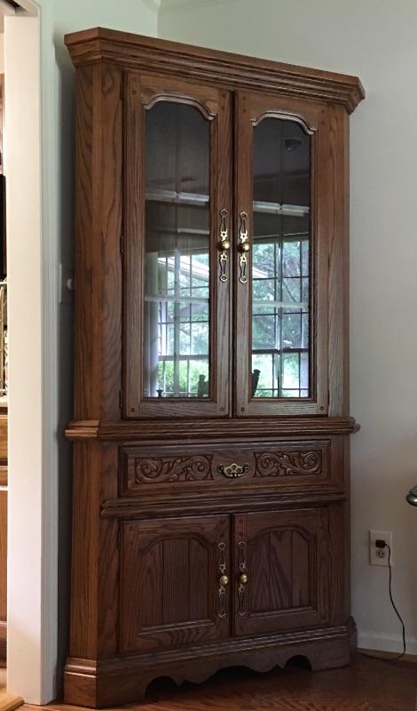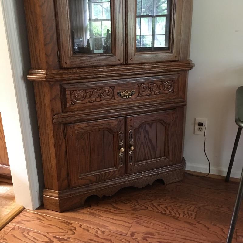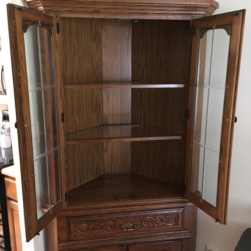 This charming beveled glass front corner cabinet comes with a drawer and a shelf on bottom. This solid piece is made by Virginia house and is a great way to display your treasures without taking up too much room.