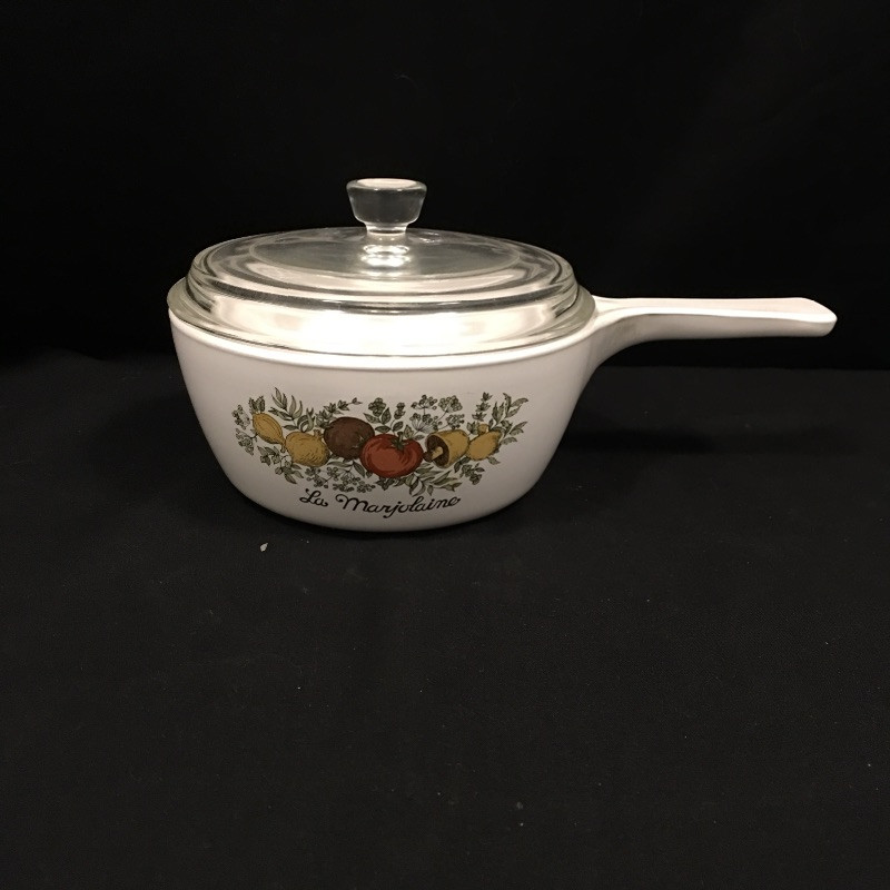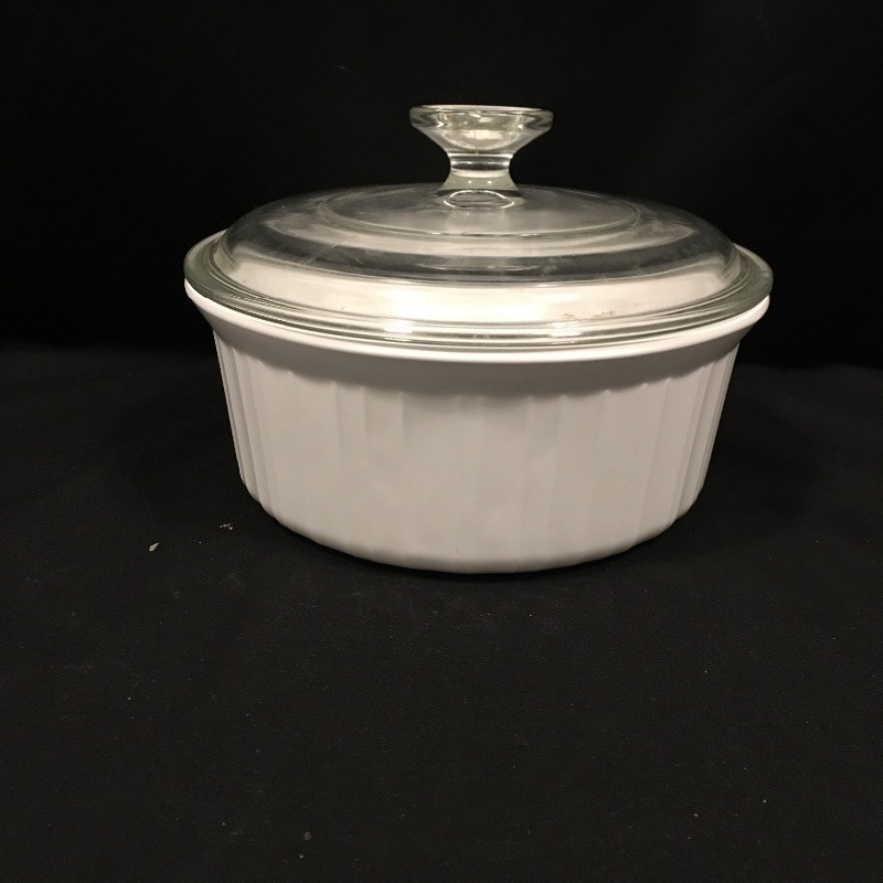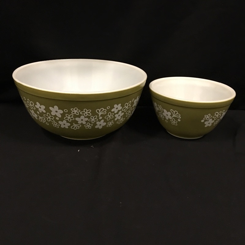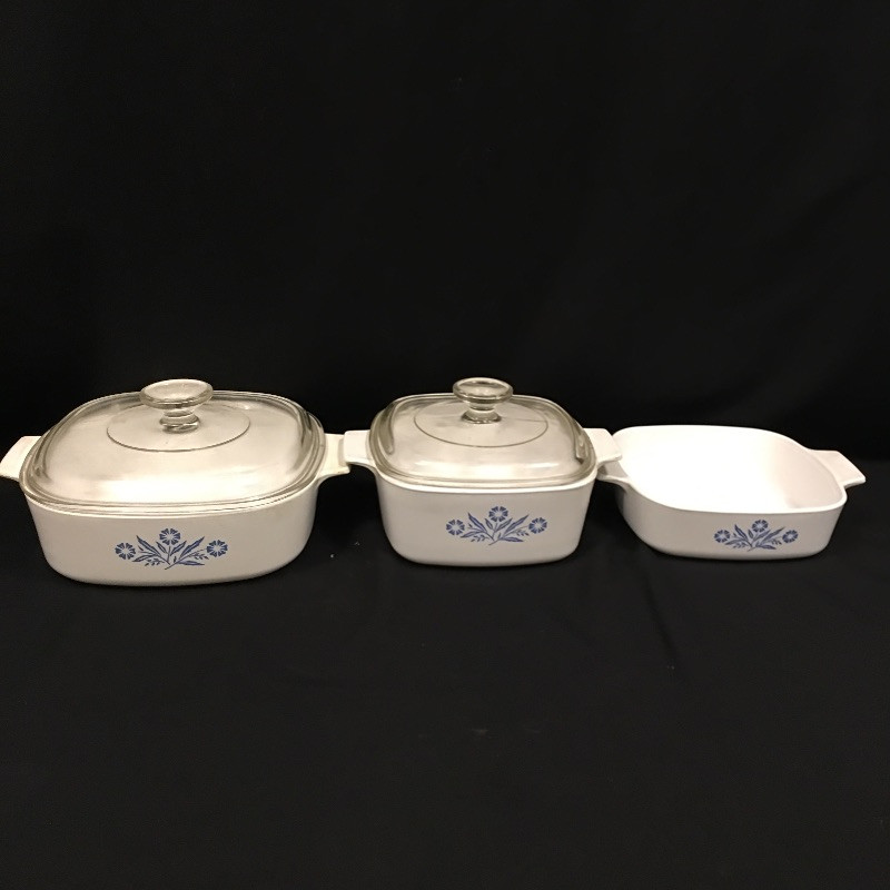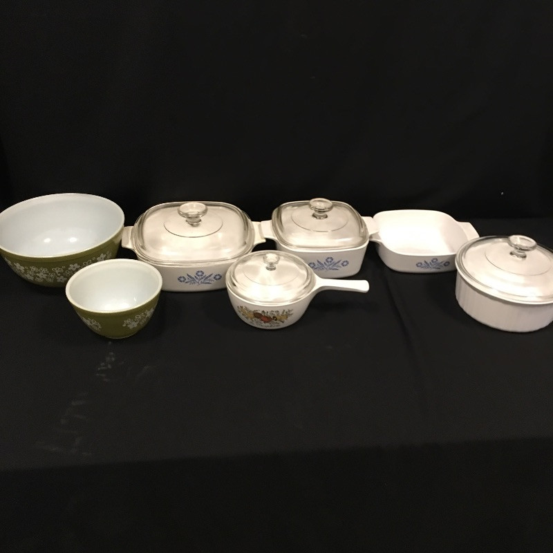 This useful collection of crockery has a total of nine pieces of Corning Ware that includes two round dishes with lids and three square dishes with two lids and two vintage Pyrex bowls. Largest bowl measures 8.5”D x 4” tall.