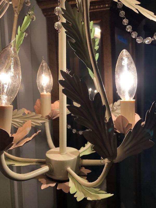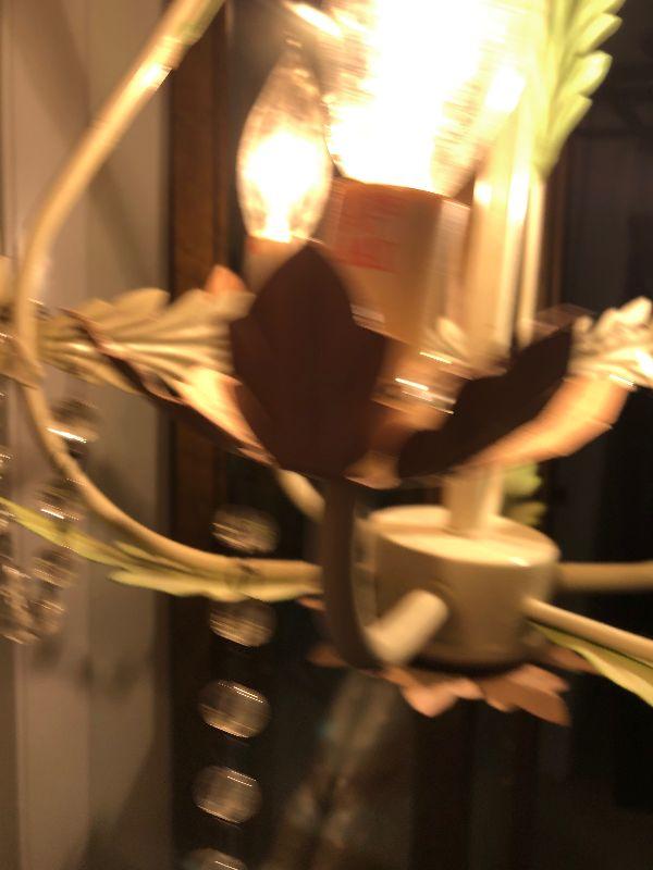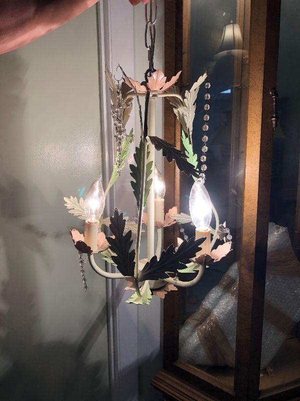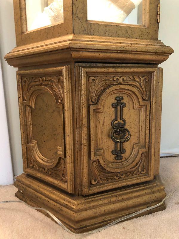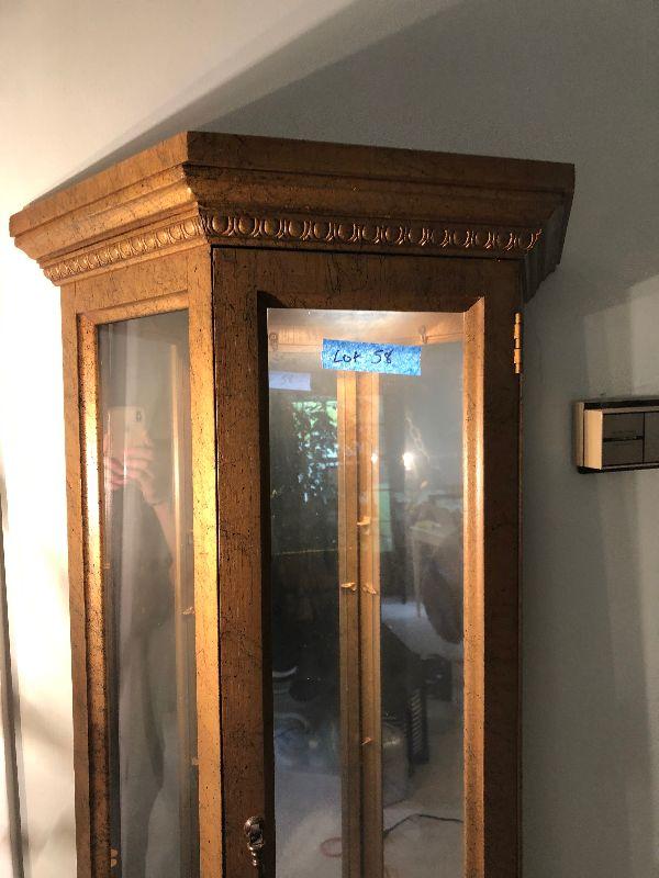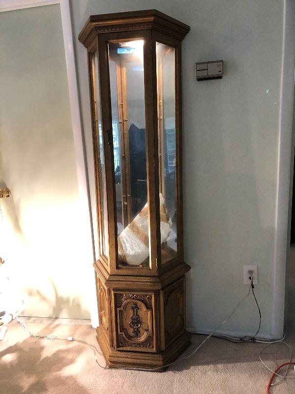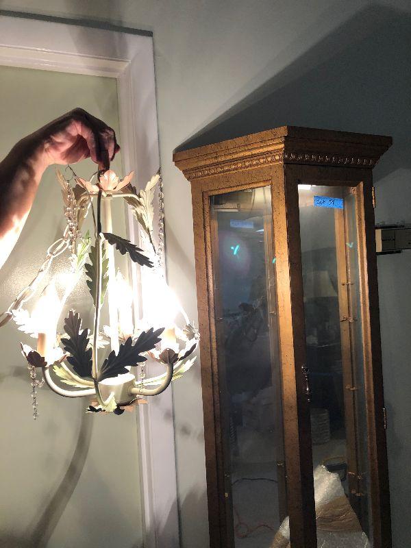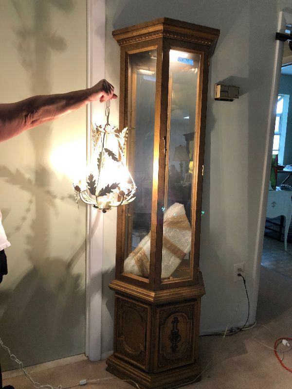 Wood lighted curio cabinet (24" x 77") and a small white chandelier.