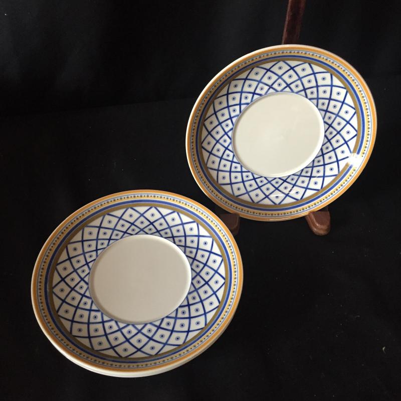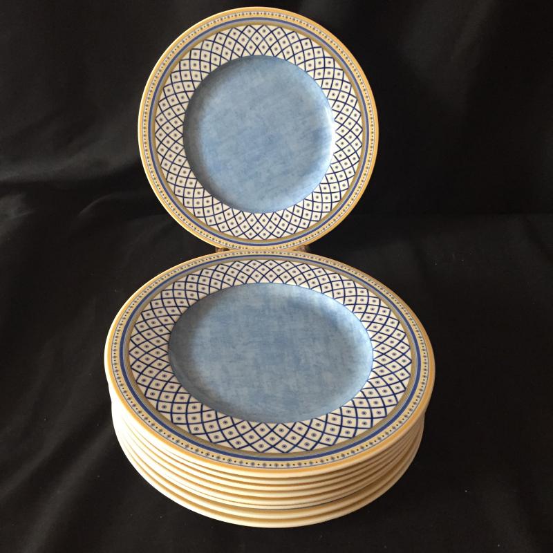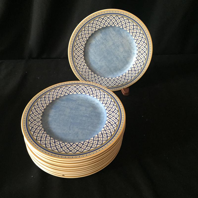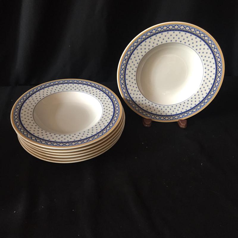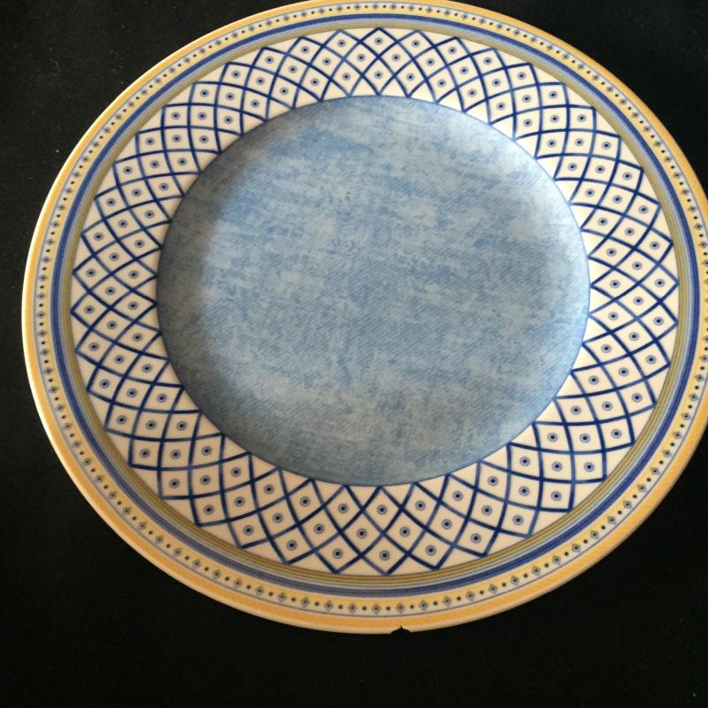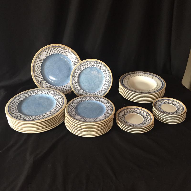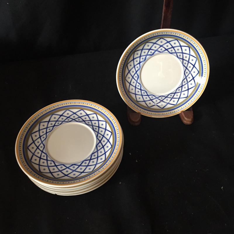 Captivating Dish set made by Villeroy & Boch Group. Nine large plates,eleven small plates one with chip,seven bowls and ten saucers six small and four large and one bowl that measures 8”D. Large plates measure 10.5”D.