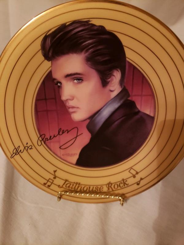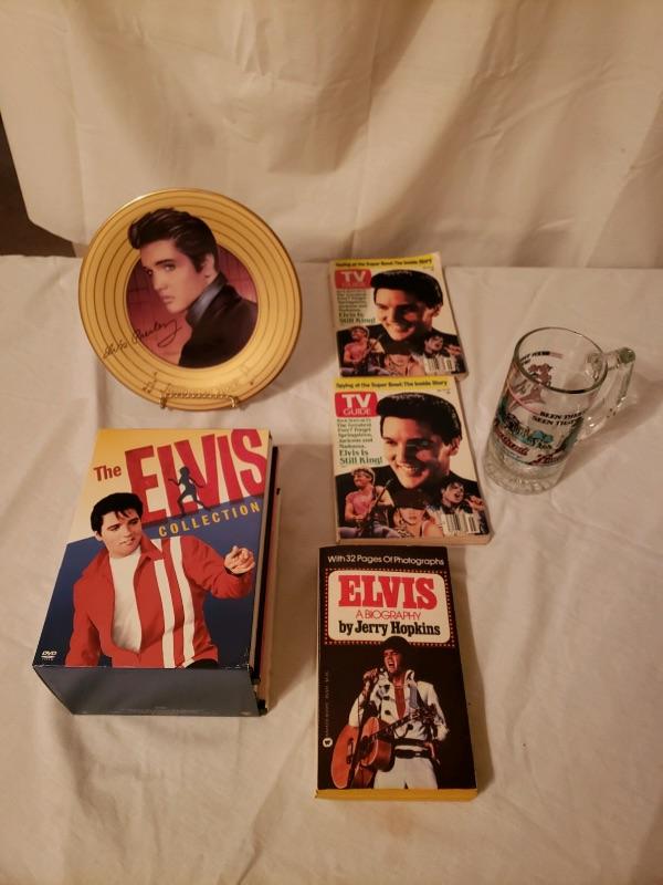 LOT #58. Elvis Lot E: Jail House Rock Ltd. Ed. plate banded with 22 karat gold #2611-A, “The Elvis Collection” of 6 DVDs, A Biography paperback book, 2 TV Guides. 19-