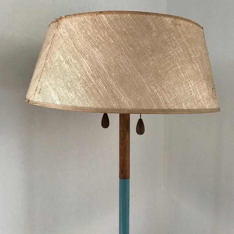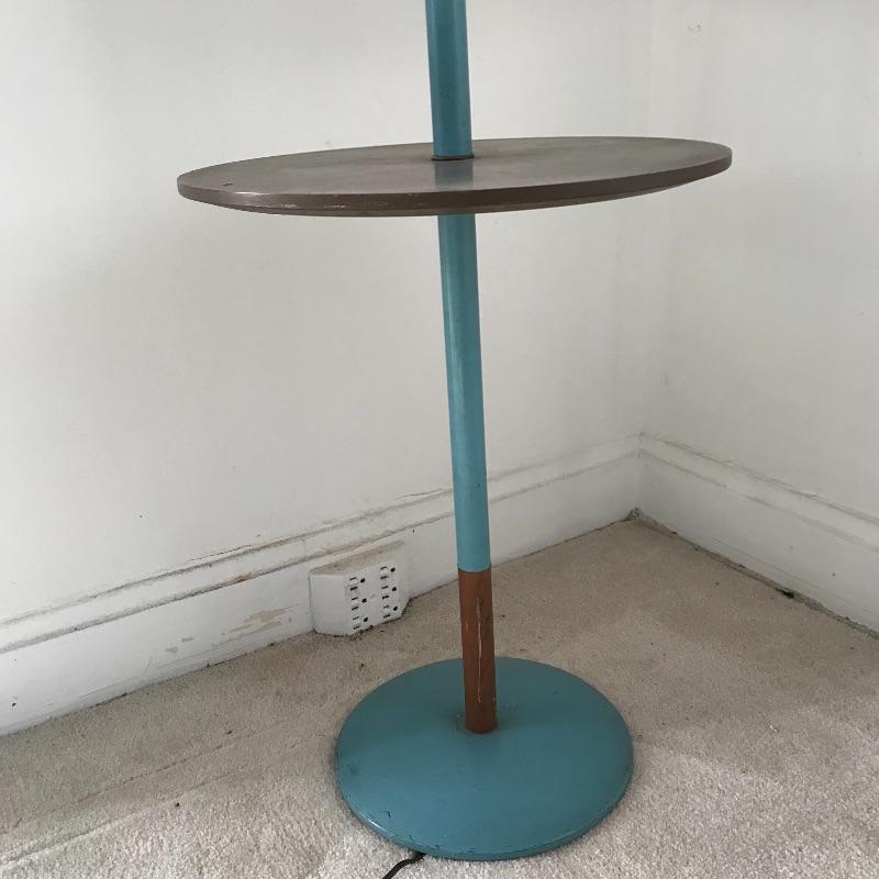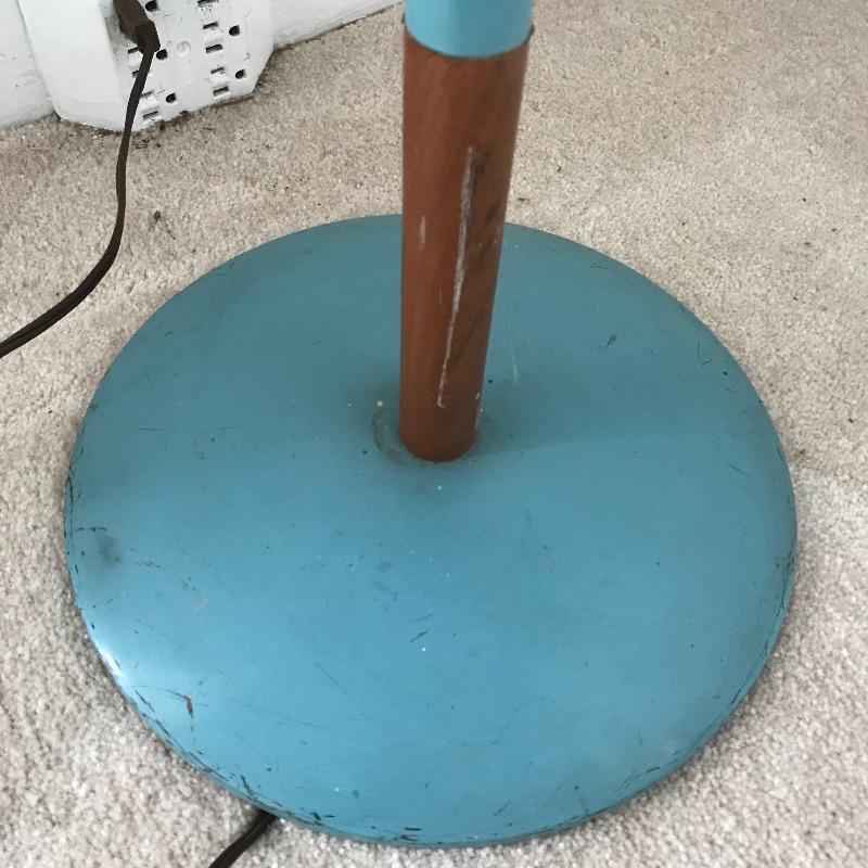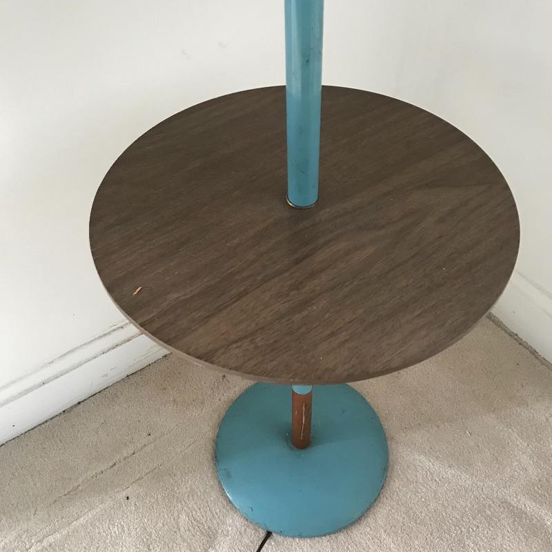 Beautiful! This turquoise floor lamp has a built in wood laminate table perfect for fun and function! Some wear is noted in photos, but its charm supersedes any flaws! Two wooden pulls on chains, one for each light just add to its character. One light works well, the other chain does not pull, working condition of that light is unknown. No shipping.