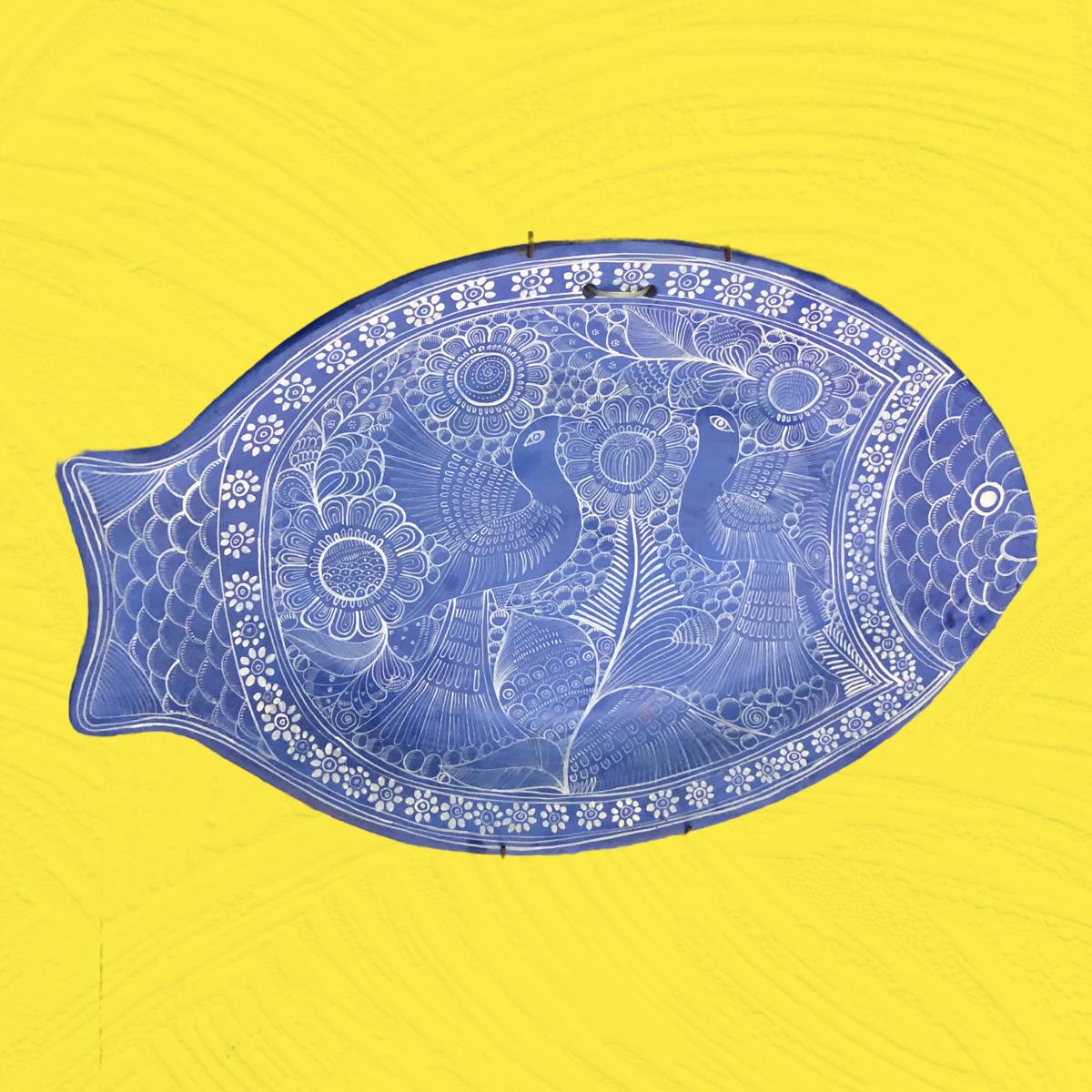El Pescador- a folkart platter made in the rich cultural historical tradition of arts & crafts in Mexico. A vibrant Periwinkle blue fish shaped platter is strung to hang vertically on a wall.