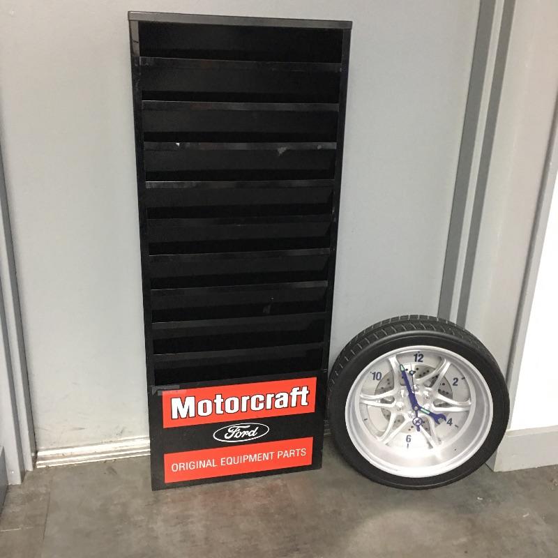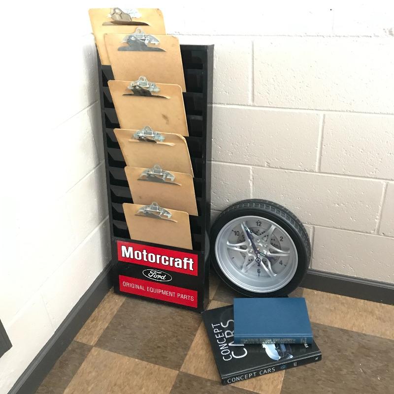 For your office and lobby needs! Ford Motorcraft file holder with a tire clock. All of you Ford fans out there don’t miss this unique Motorcraft metal hanging file holder with a tire clock. Motorcraft file holder measures 14” x 34.5” x 2.25”, complete with six clip boards. Clock has crack in back and could not be tested as battery is dead, see pictures. Two books will be great additions to your waiting room. See photos.