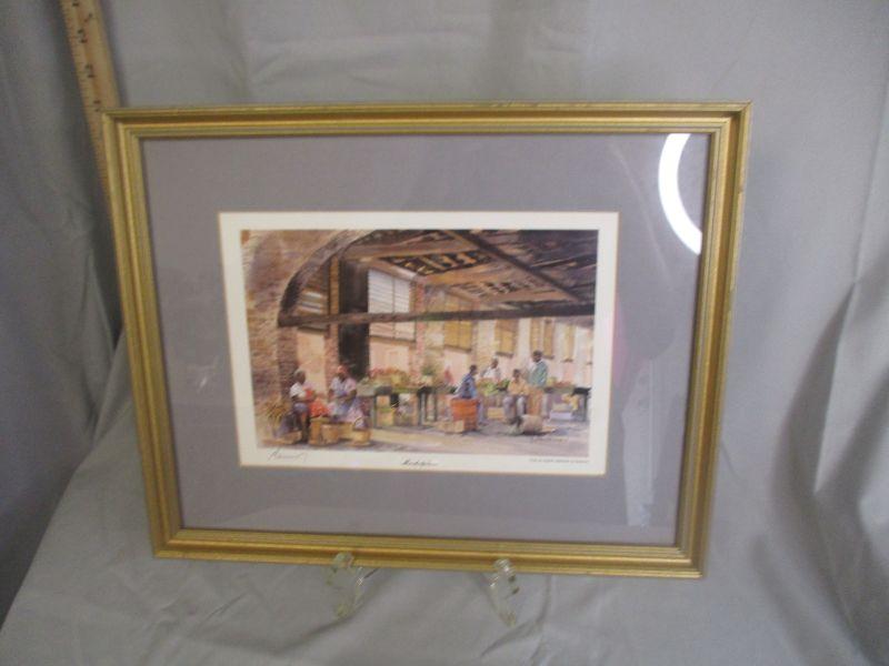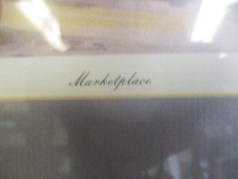 The frame is 15.25" x 12.25" and in very good condition. It is a marketplace scene, as explained by the title.