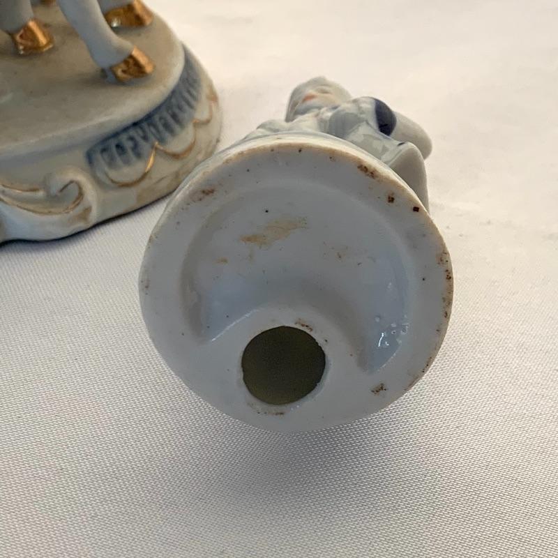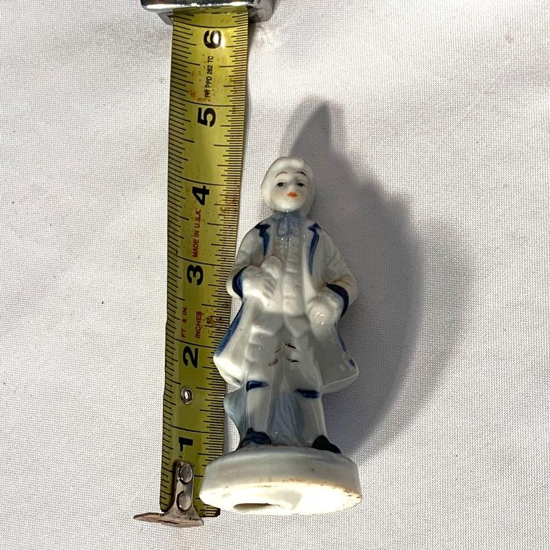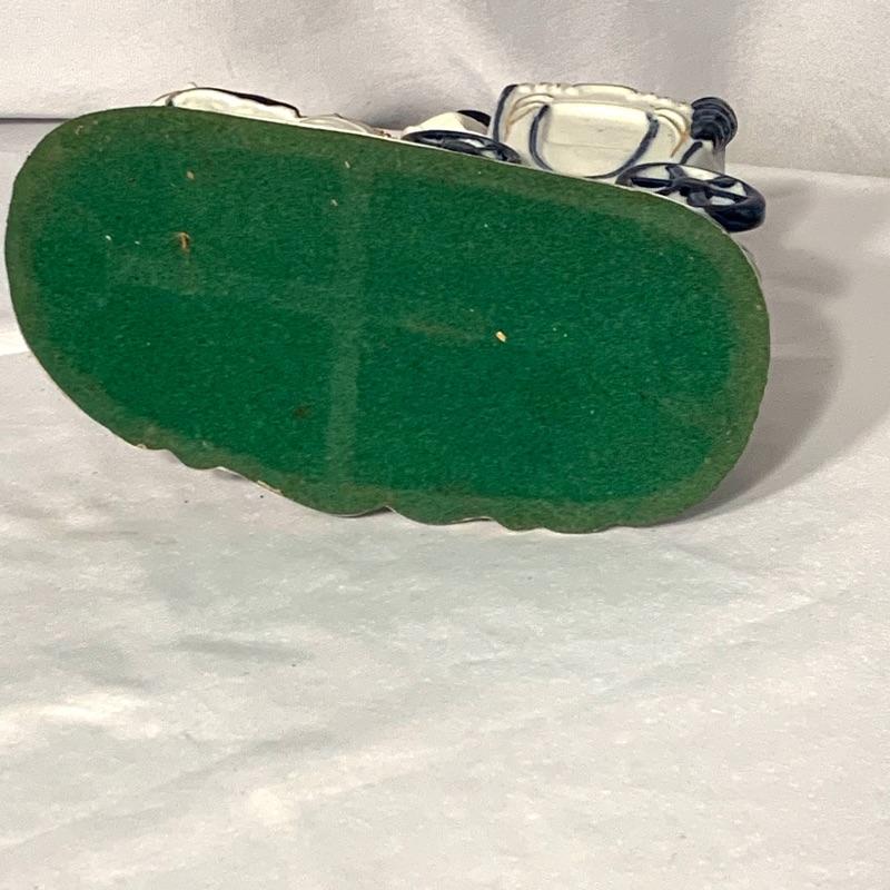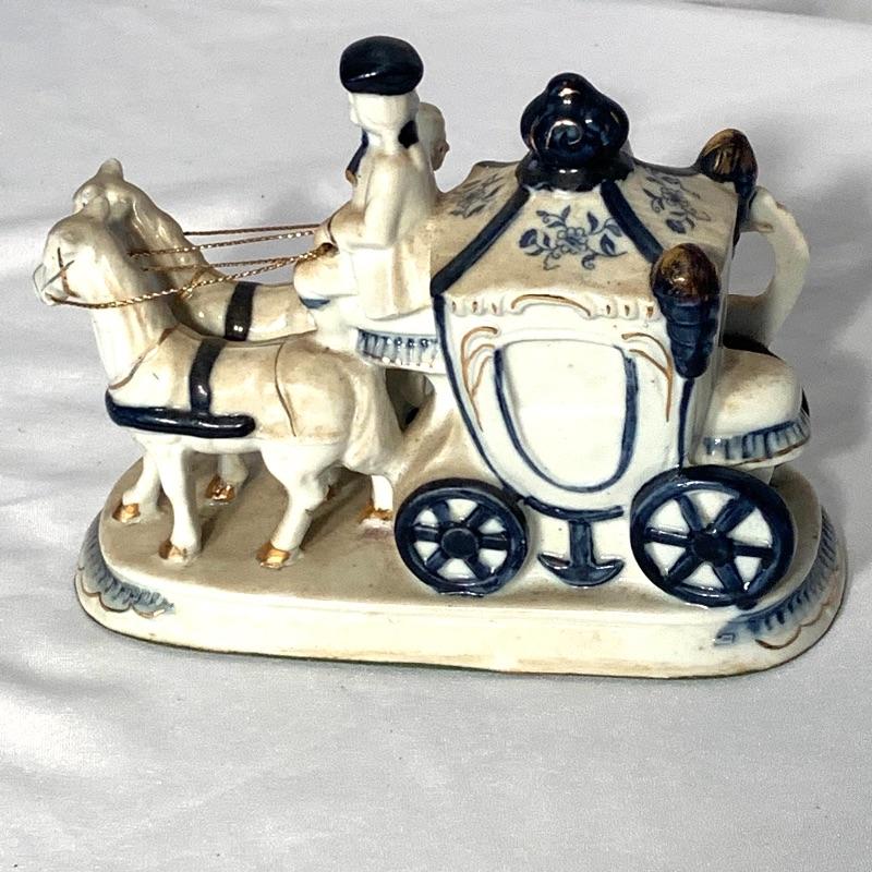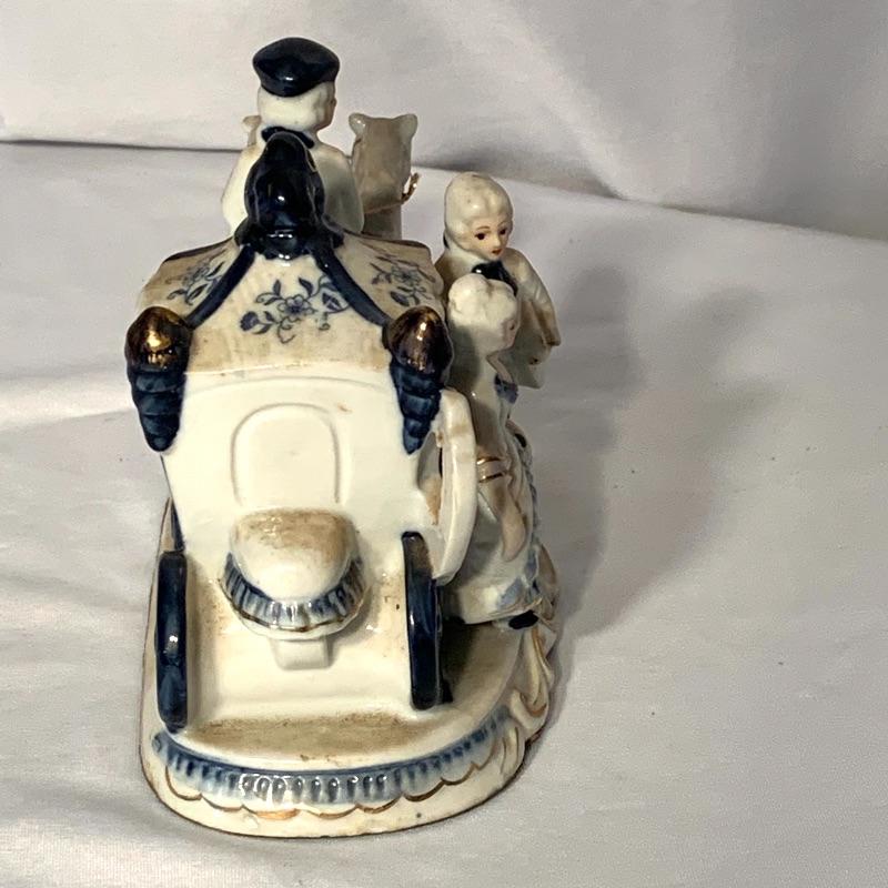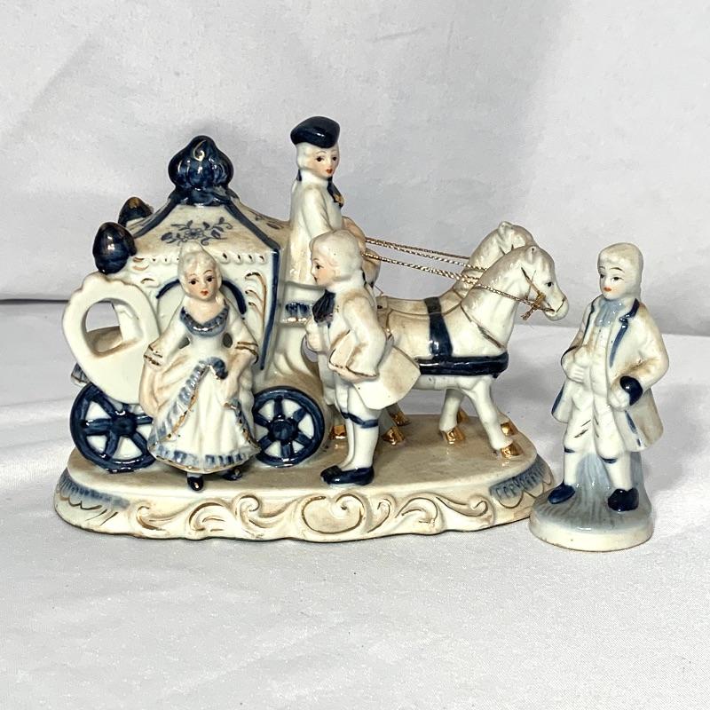 Also included is a quaint ceramic set of white and blue figurines with gold-colored accents. It features a horse drawn carriage with a driver holding reins made of gold-colored string, an attached man and woman, and another unattached man. The unattached man measures a little over 4” and the tallest point of the set is 6”. The bottom of the main figurine has a layer of green felt to protect whatever surface it goes on. Local pickup only.