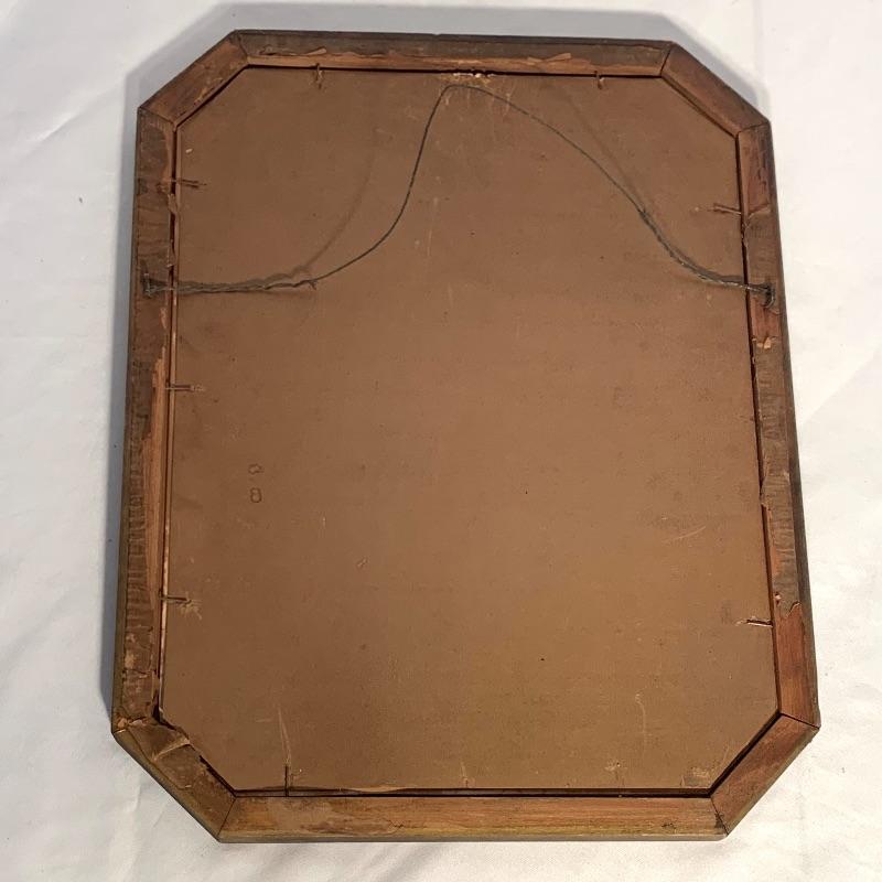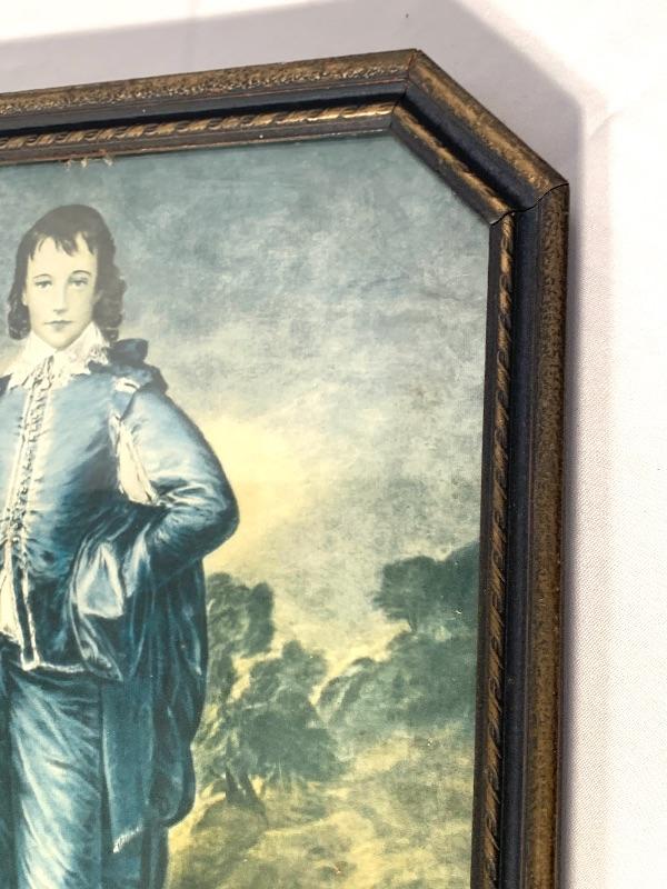 This lot includes a framed print of a young man wearing what is reminiscent of male fashion from the 1700s. The print has no signature. The frame is wood painted dark with metallic accents. The paint is a bit worn in some spots. It includes a wire for hanging. Measures 13.75” x 17.75”.