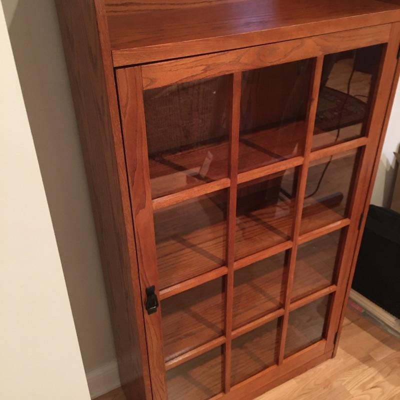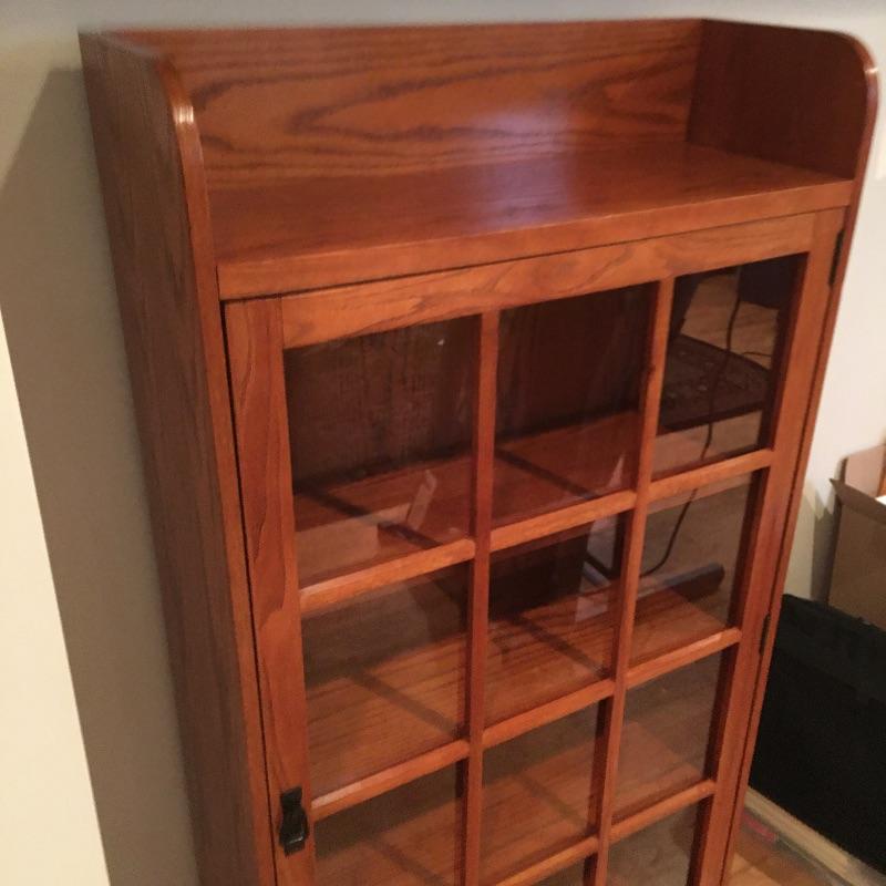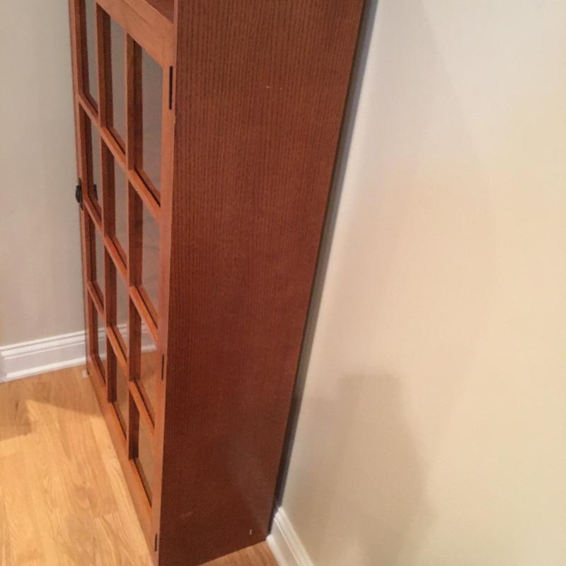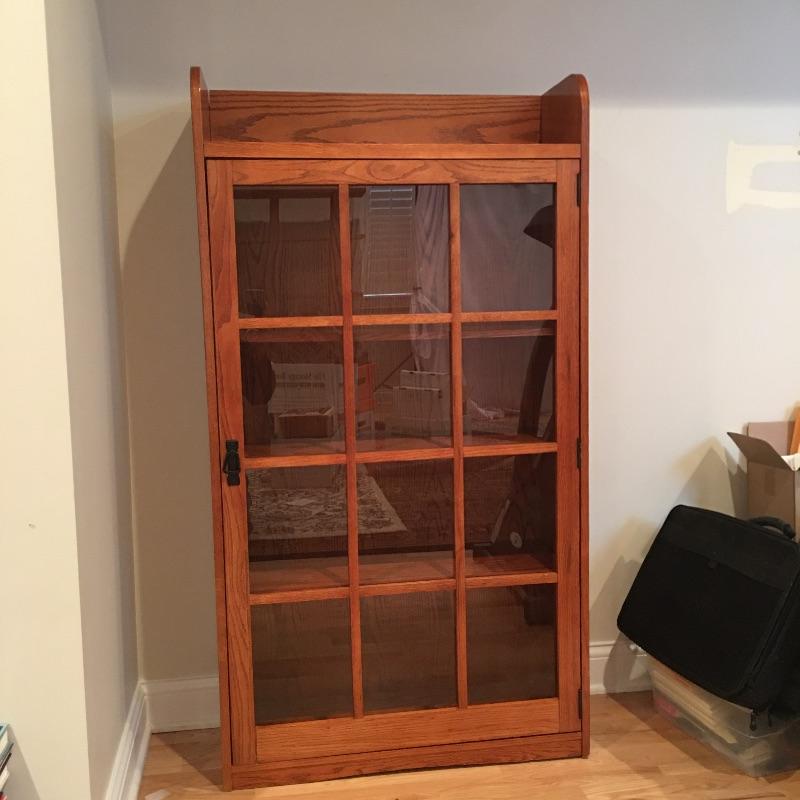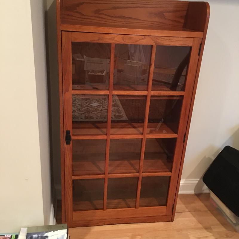 Glass front cabinet has four adjustable shelves inside glass and wood door. One extra shelf on top. Keep the dust away from your collectibles with this practical but gorgeous manufactured cabinet. Cabinet measures 12” x 32” x 60”.