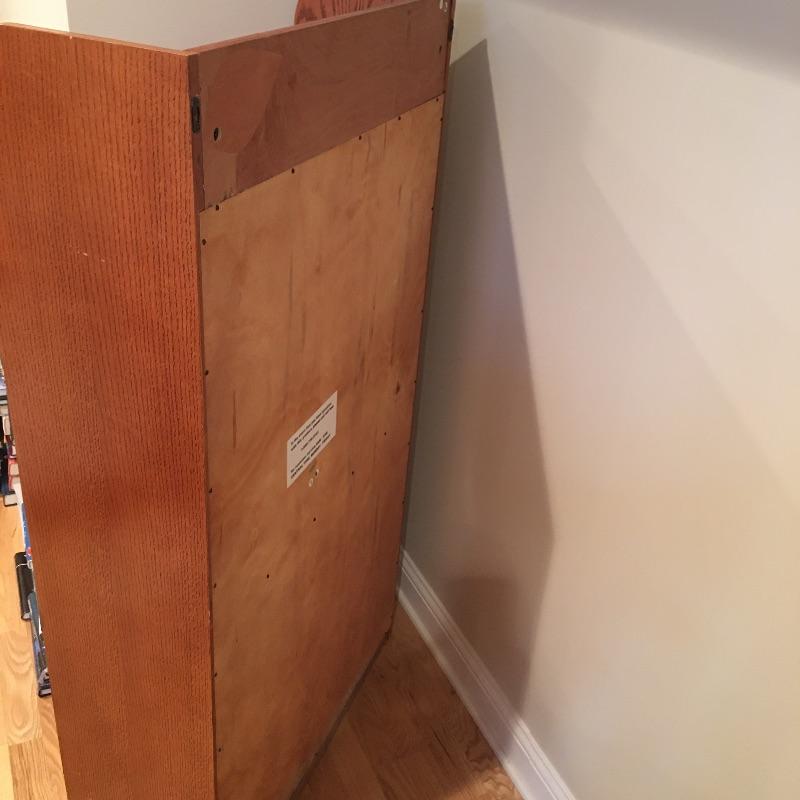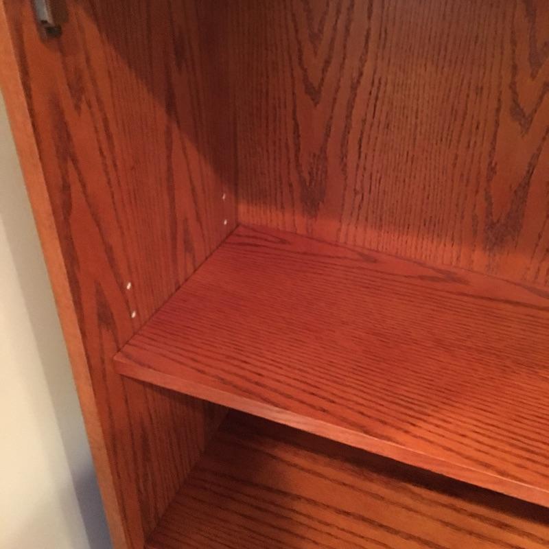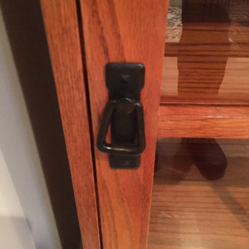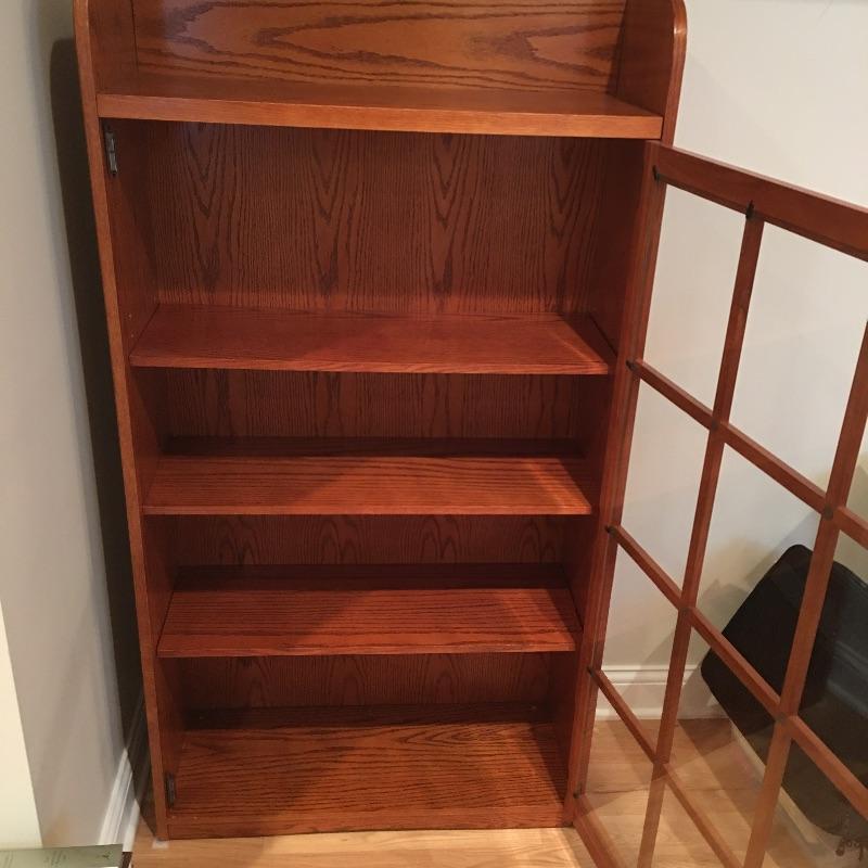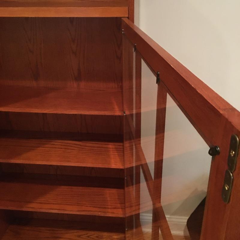 Glass front cabinet has four adjustable shelves inside glass and wood door. One extra shelf on top. Keep the dust away from your collectibles with this practical but gorgeous manufactured cabinet. Cabinet measures 12” x 32” x 60”.