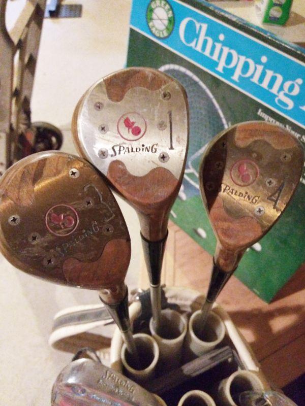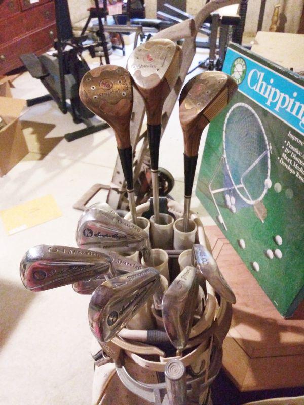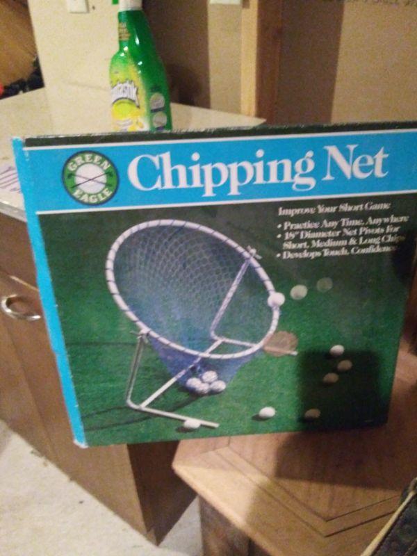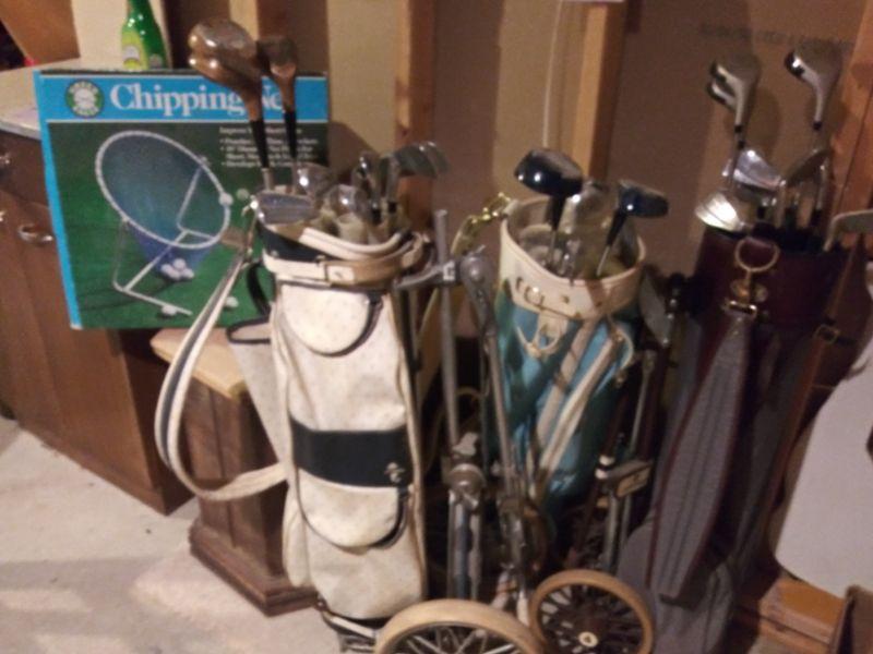 3 BAGS OF GOLF CLUBS AND A CHIPPING NET