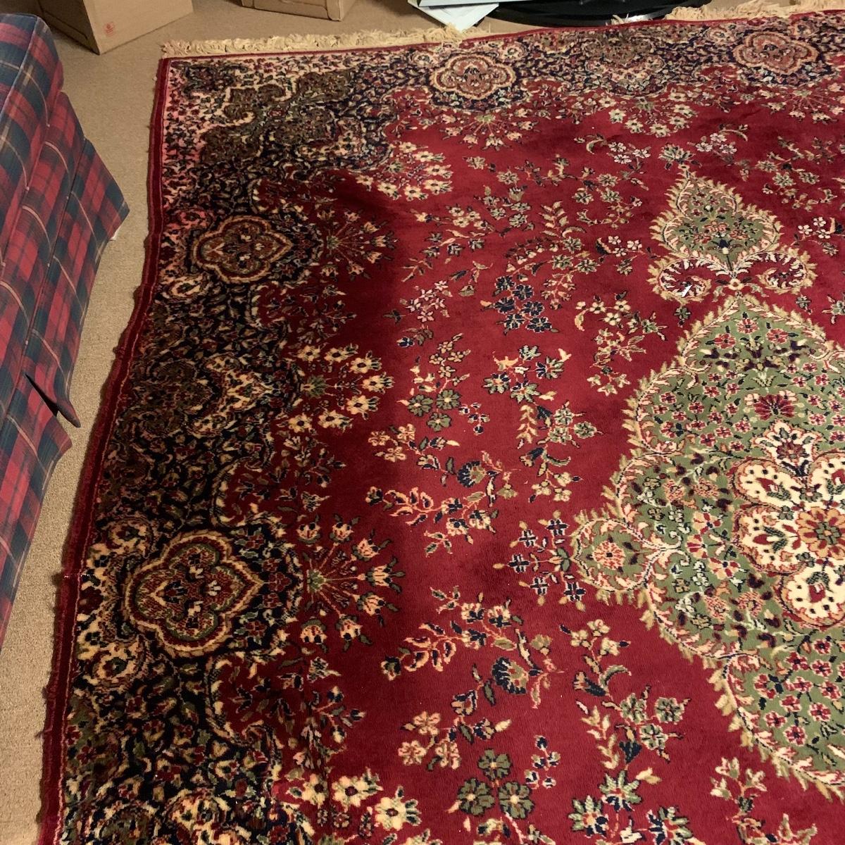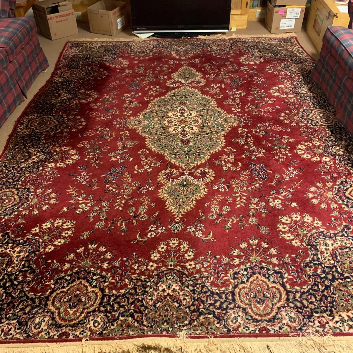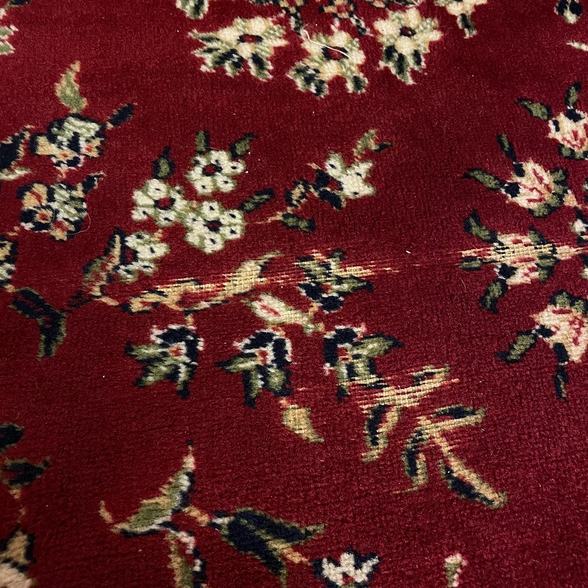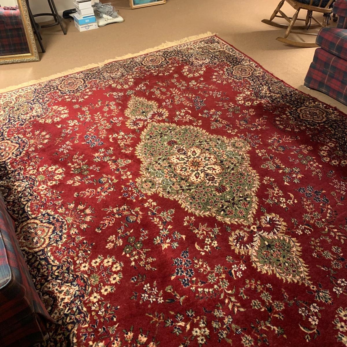This is truly a beautiful area rug. It features a red and olive oriental motif that really brings color to a room. Measuring 125” X 96”, it would be great for a living or dining room. However there is a little damage. There is discoloration where a couch sat as well as a wine stain (see pics). A couch could easily cover this damaged area. Local pickup only.