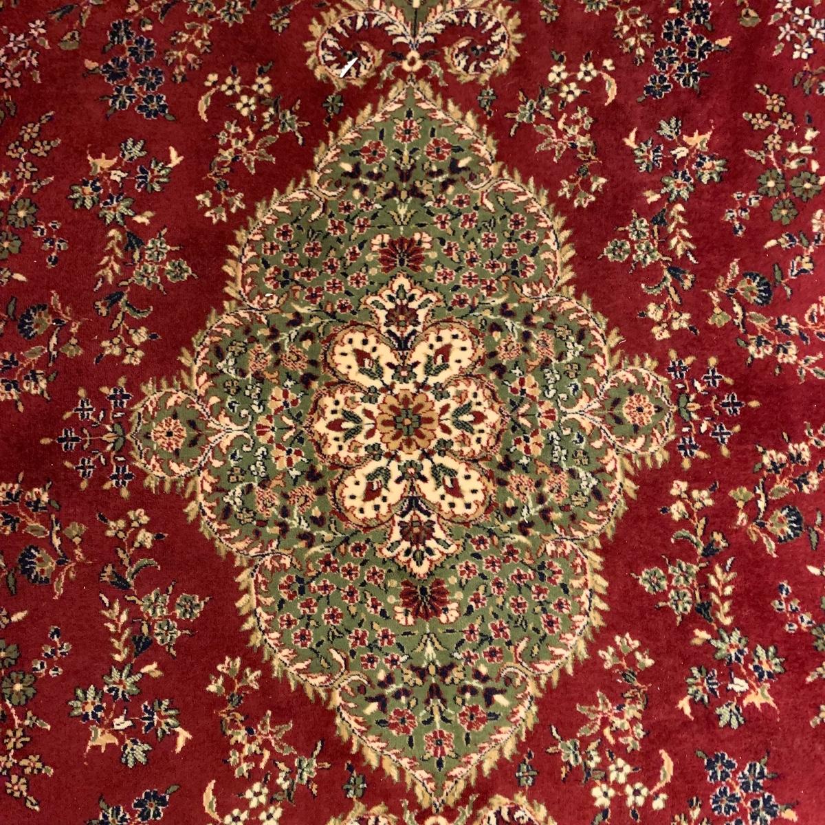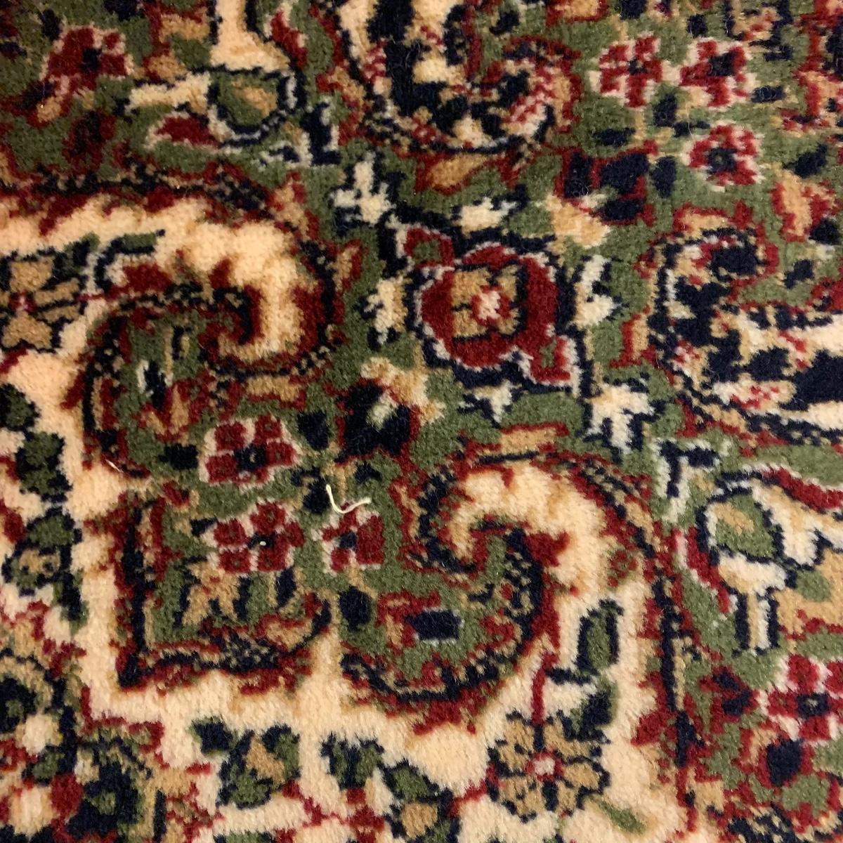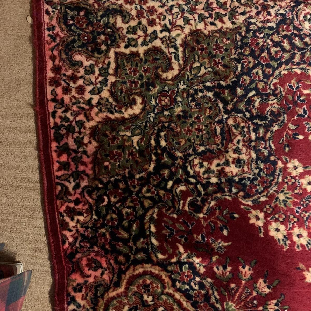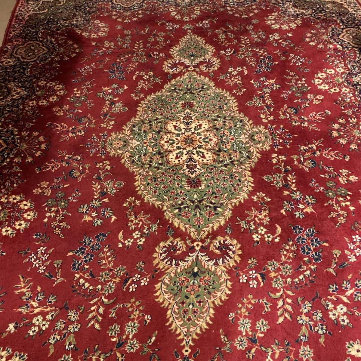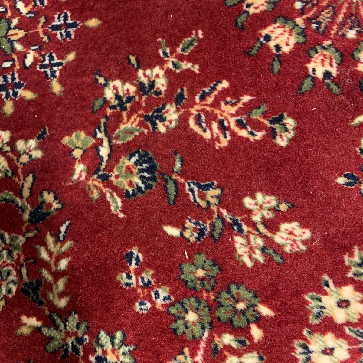 This is truly a beautiful area rug. It features a red and olive oriental motif that really brings color to a room. Measuring 125” X 96”, it would be great for a living or dining room. However there is a little damage. There is discoloration where a couch sat as well as a wine stain (see pics). A couch could easily cover this damaged area. Local pickup only.