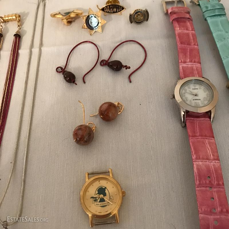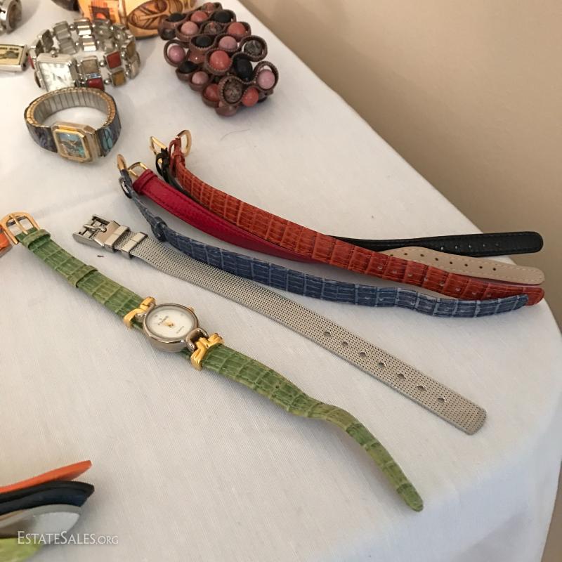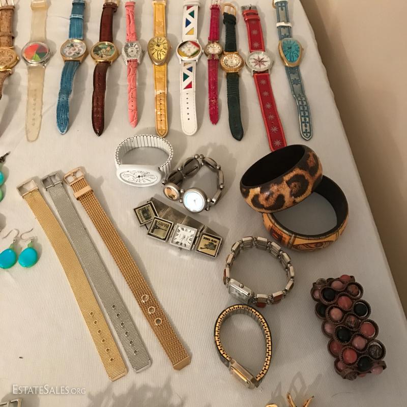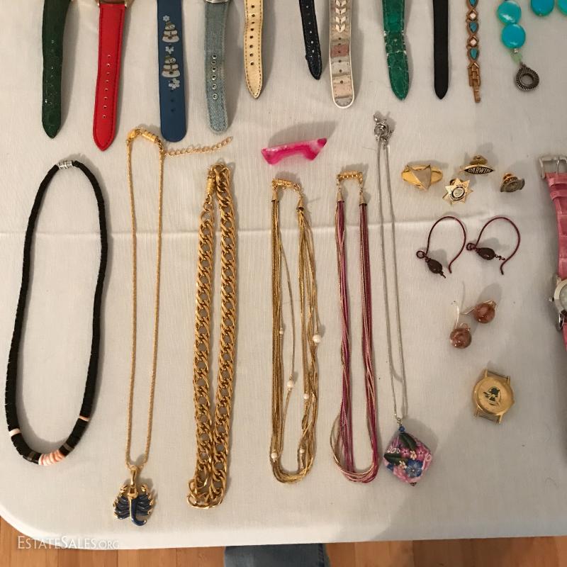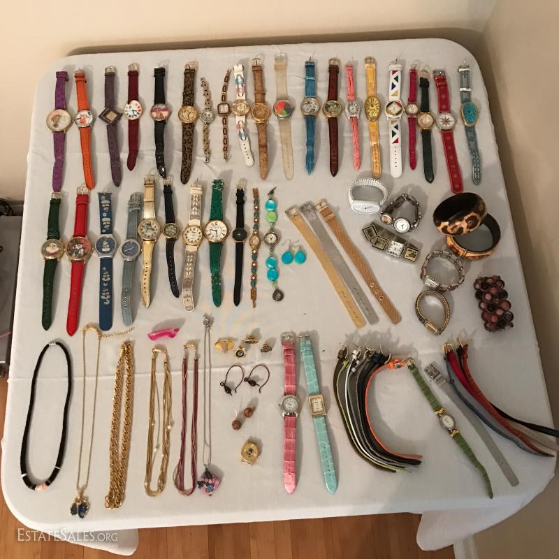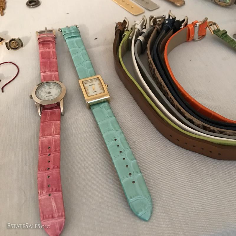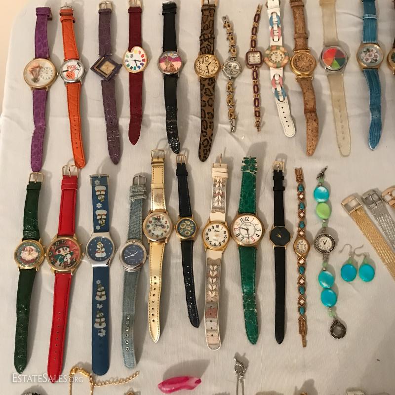 Huge collection of designer watches, mostly Quartz brand. Most need batteries but appear to still be in working condition. Some band replacements. A few necklaces, earrings and bracelets. This lot is available for shipping or local pick up in Mills River, NC.