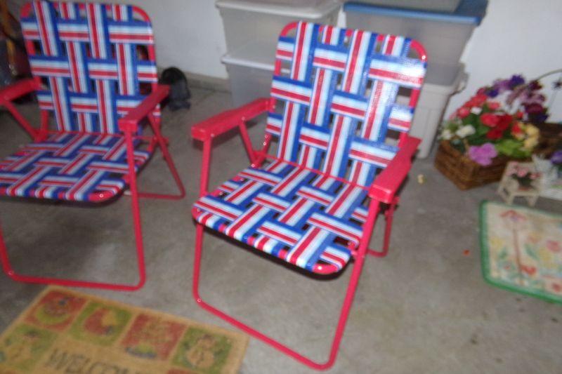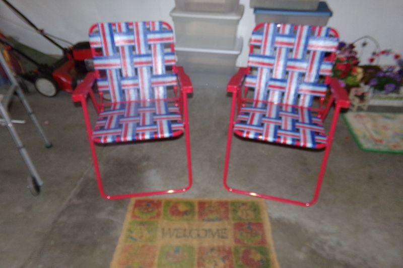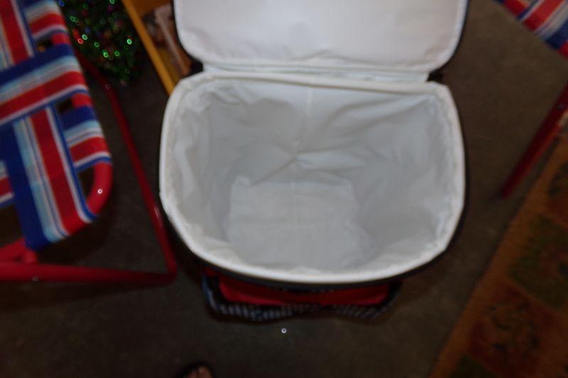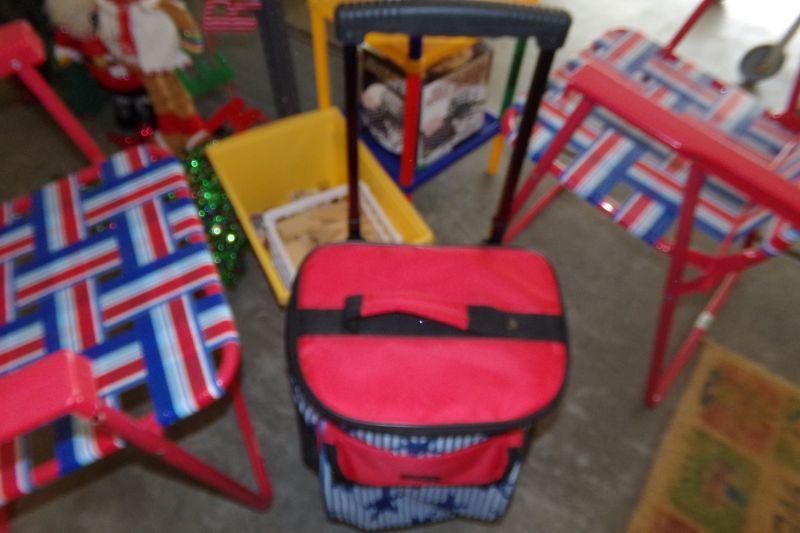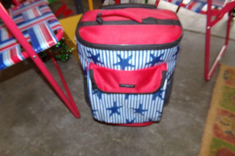 2 RED/WHITE/BLUE FOLDING LAWN CHAIRS, WELCOME DOORMAT AND SOFT SIDED COOLER ON WHEELS WITH HANDLE