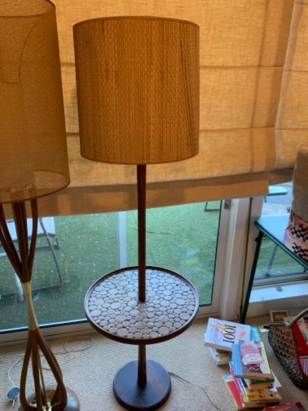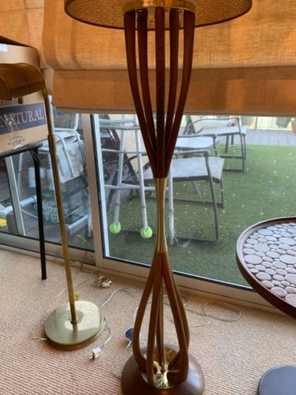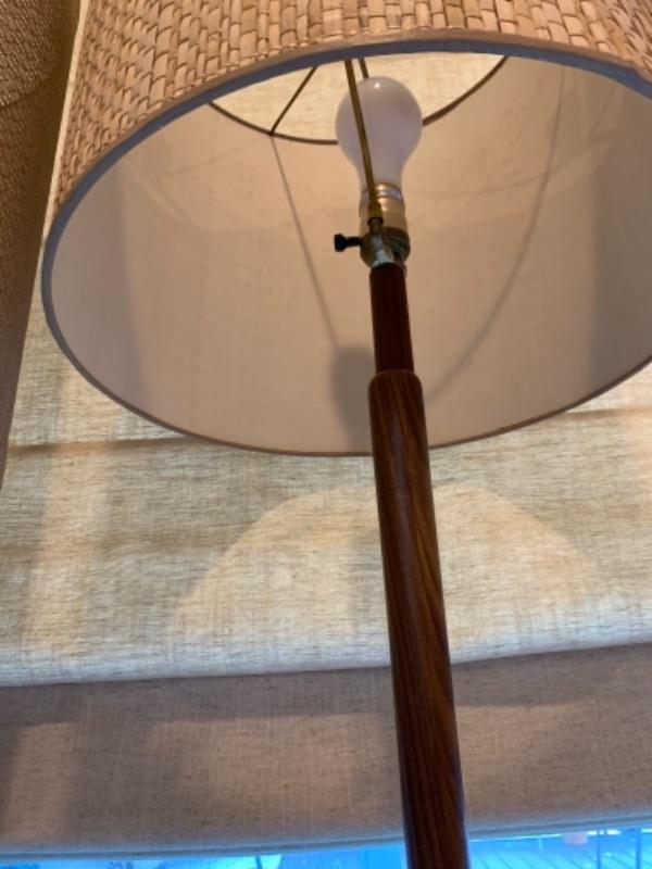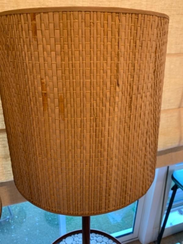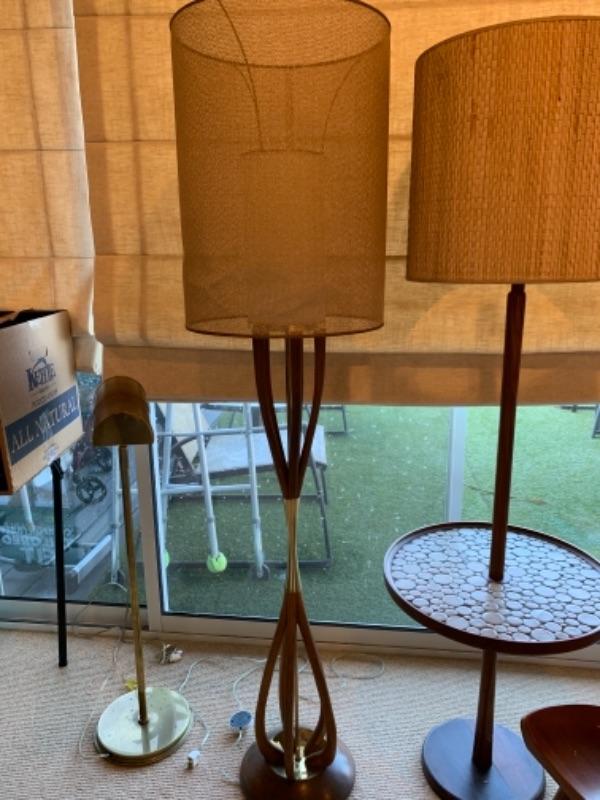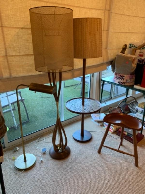 Lot 58. Lot of 3 lamps--one reading, and two wood mid-century, one with sea grass shade, one Mid-Century stool--$195
