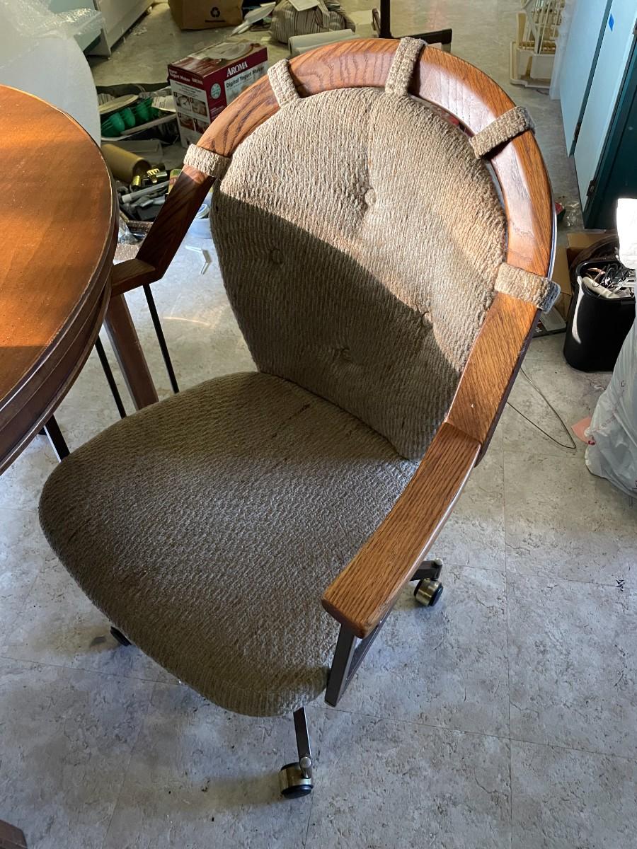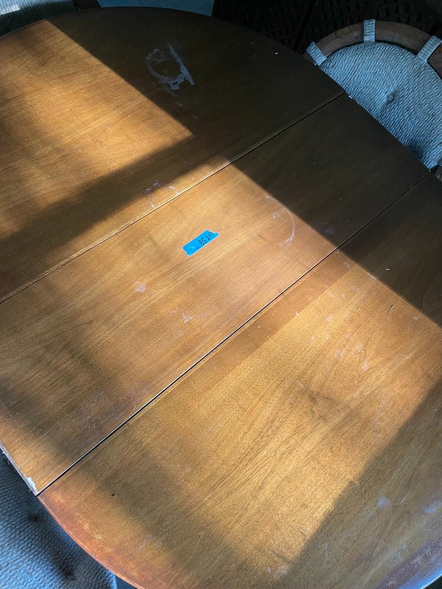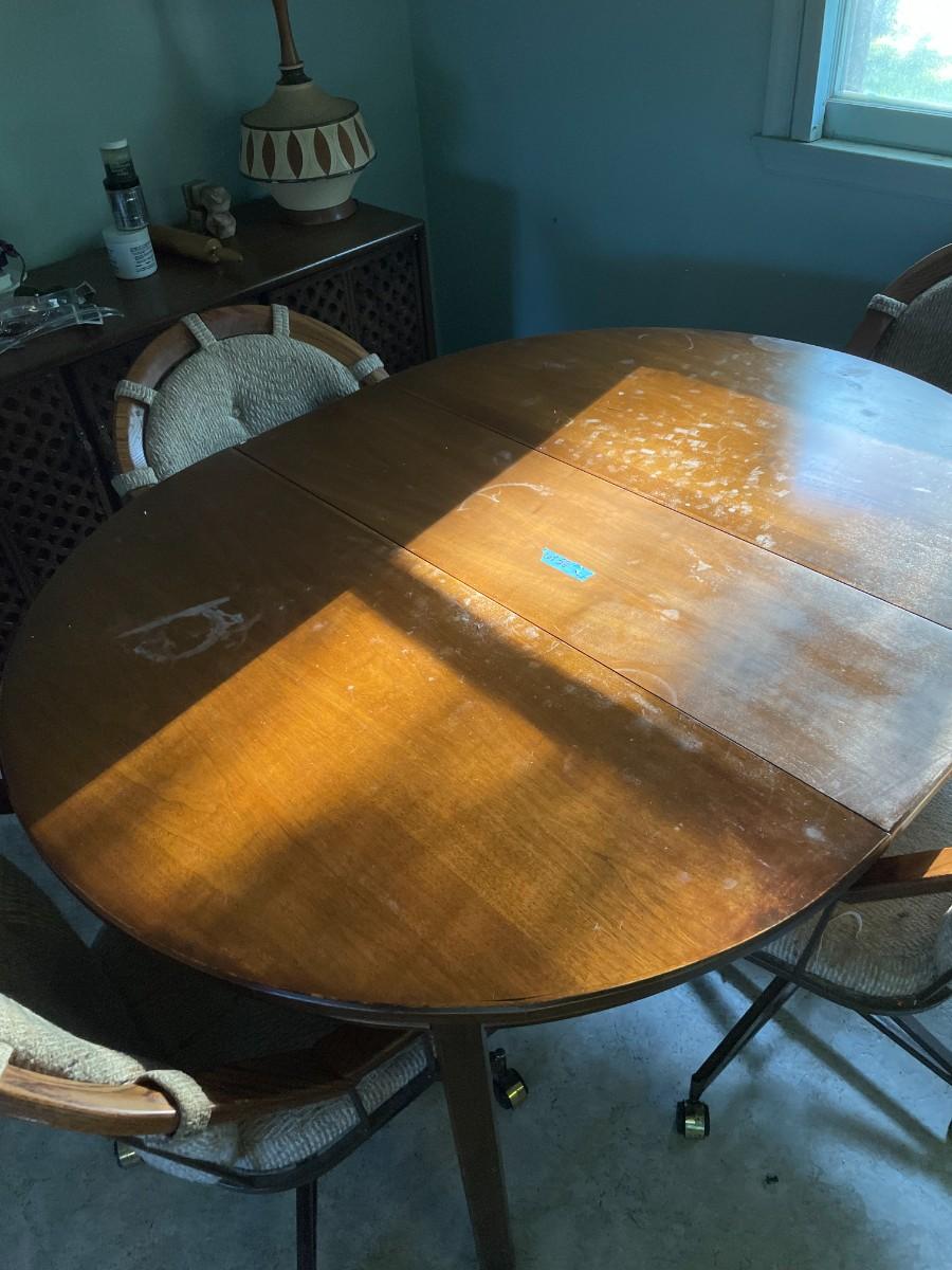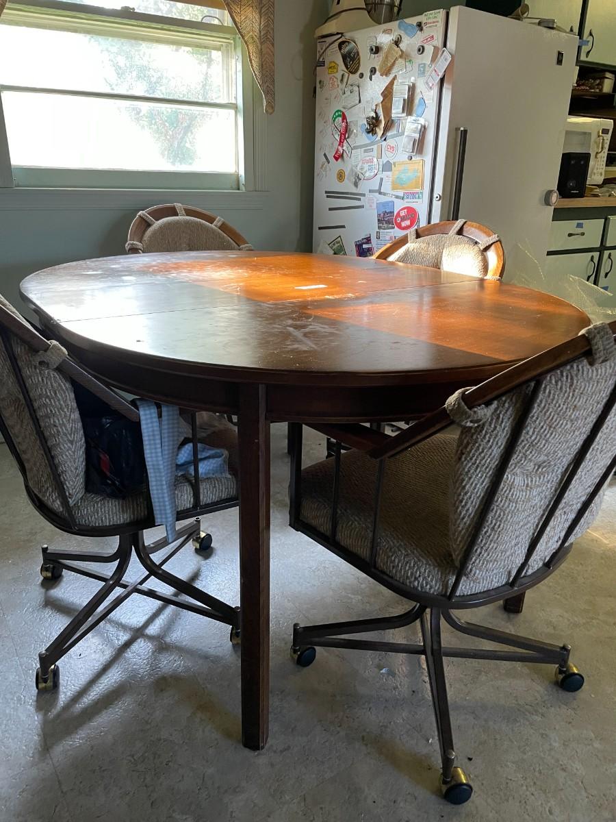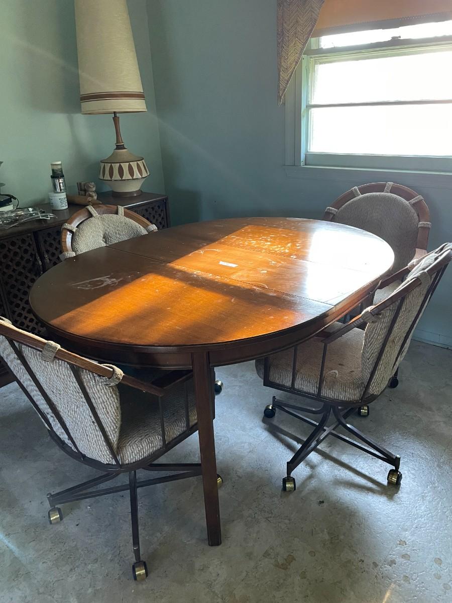 Lot 58- Mid century modern table (57 in. long, 30 in. tall, 45 in. wide) with leaf in it and includes two additional leaves, four chairs