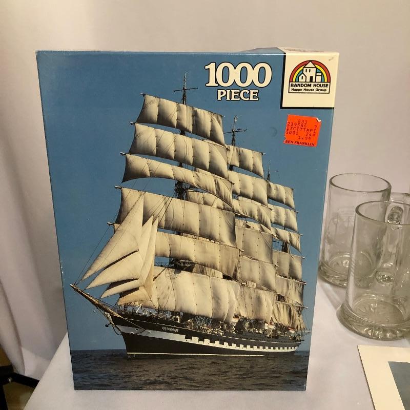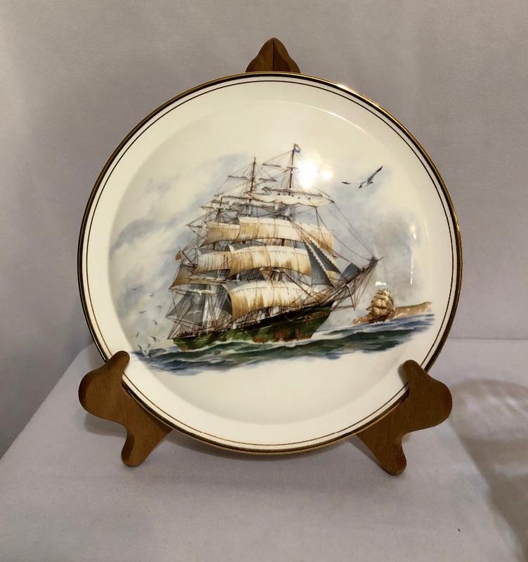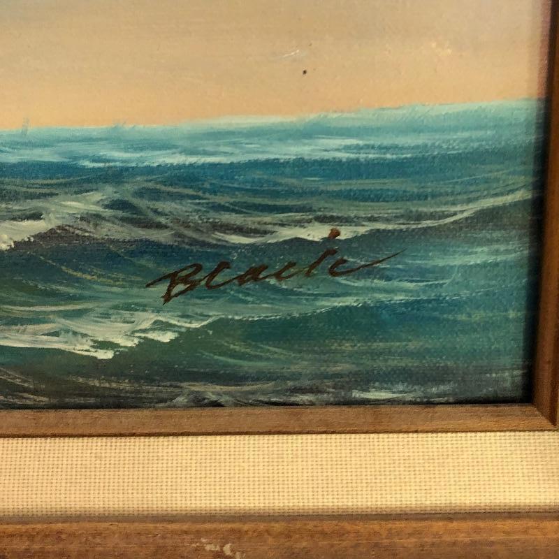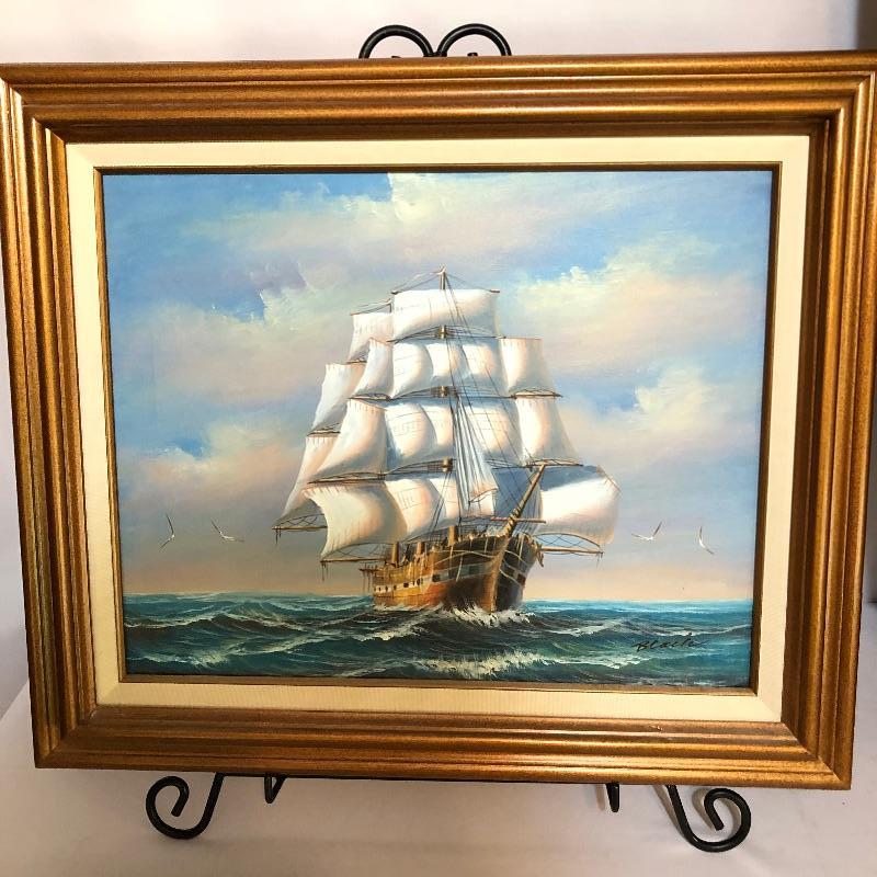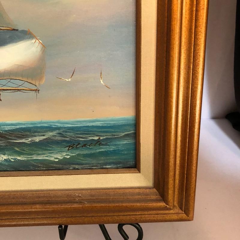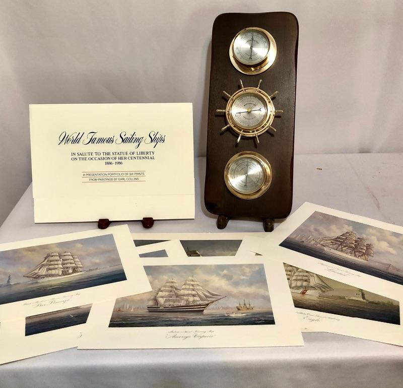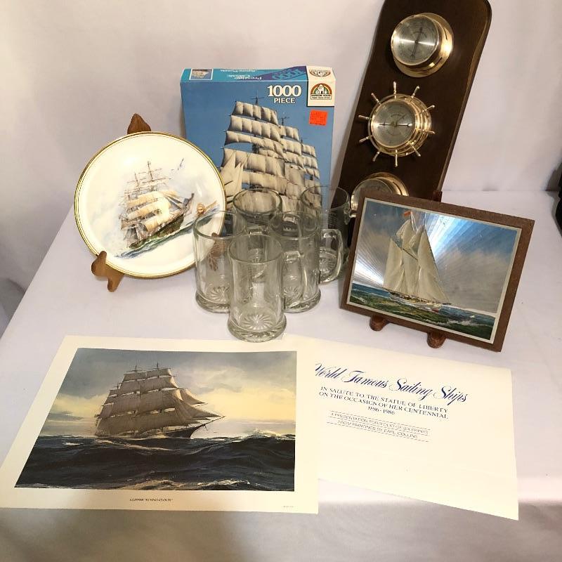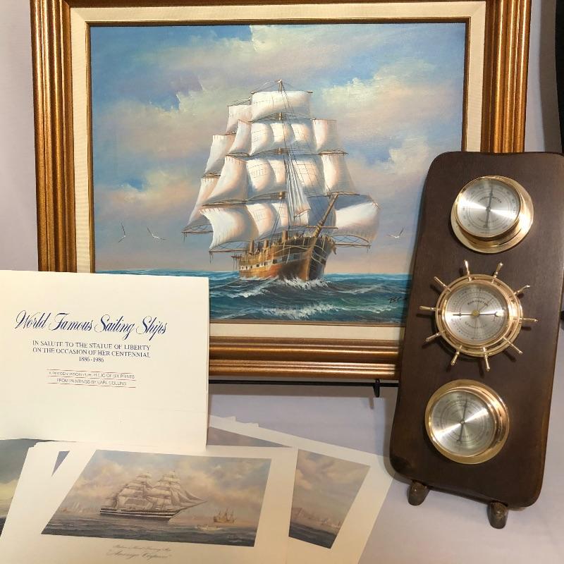 A vibrant oil painting of a ship that is matted and framed and signed; signature name appears to say Blacic. A total of seven prints from United States Coast Guard Academy of paintings by Earl Collins, 6 come together in a portfolio, last image shows more details. Also included is a barometer, a metallic ship painting, a Royal Kent decorative plate with stand, a 1000 piece unopened puzzle and 5 glass tumblers with ships etched on them.