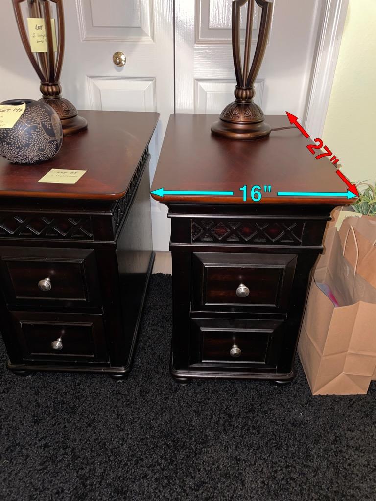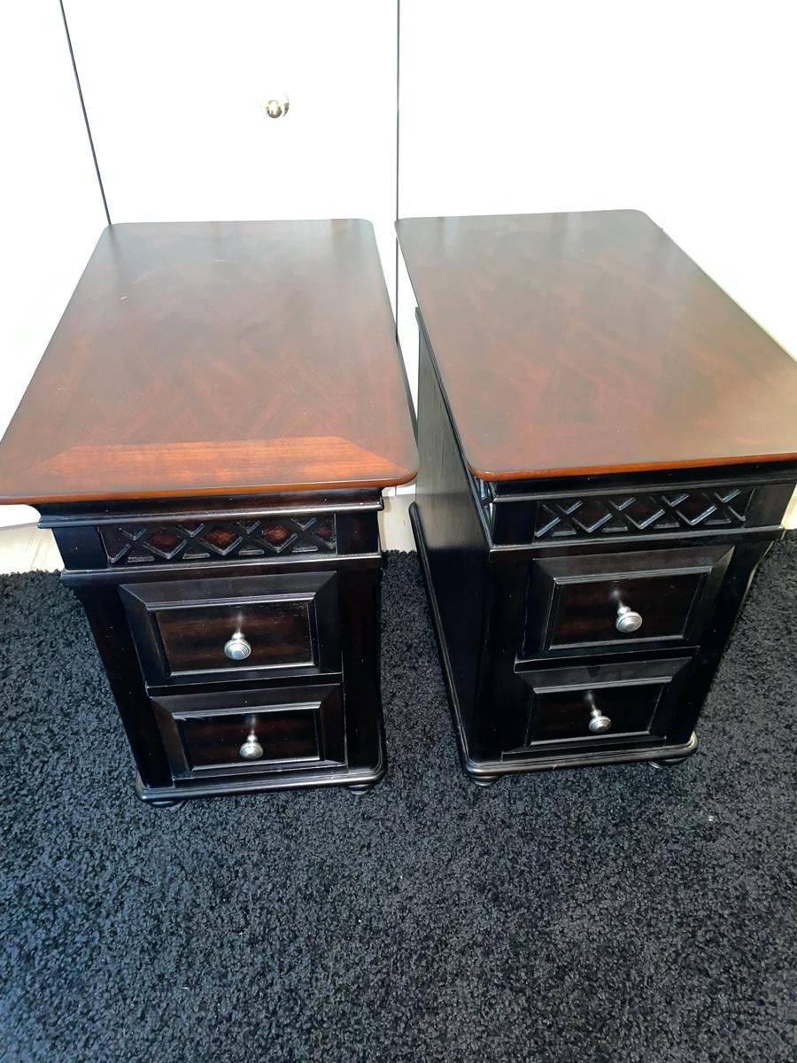 Pair of traditional style slim night stands. Dark stained finish on the top with painted black base. Excellent condition