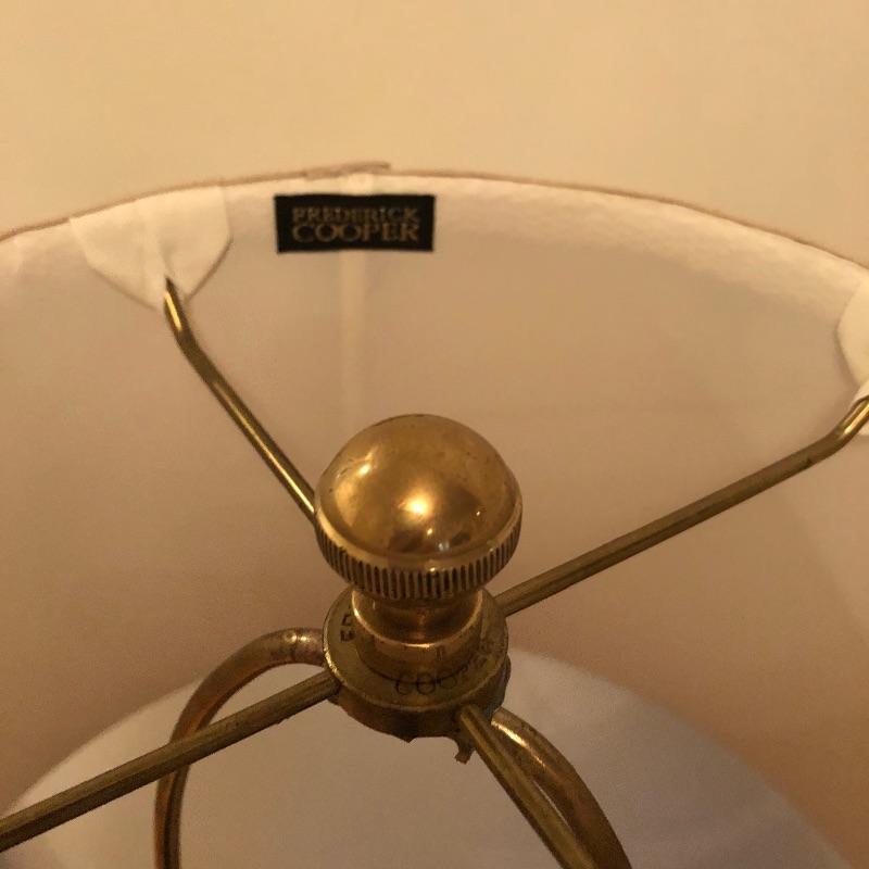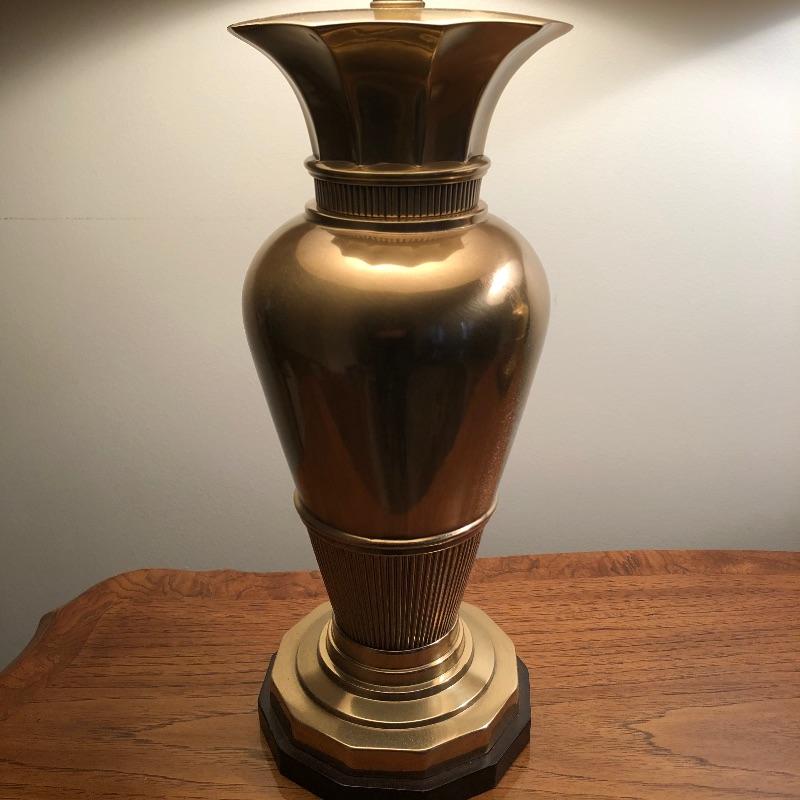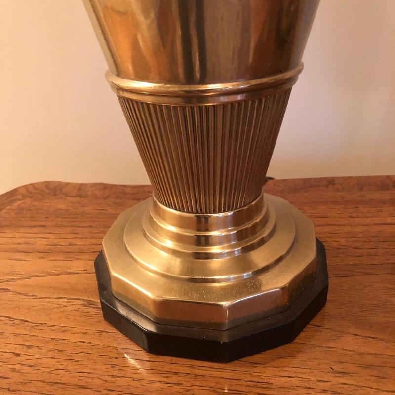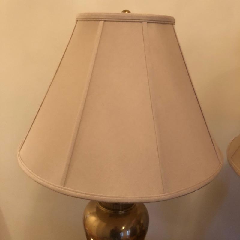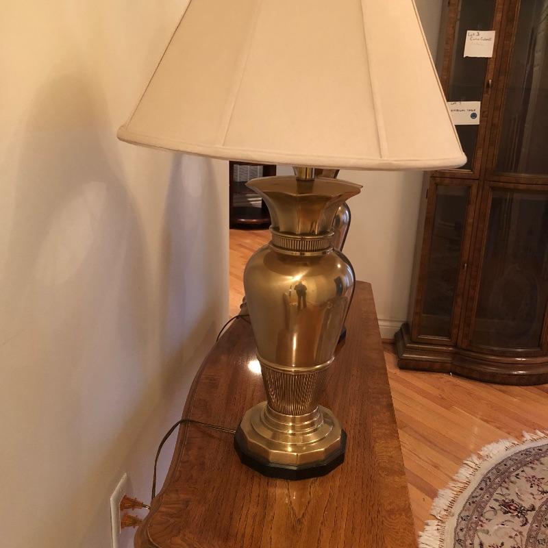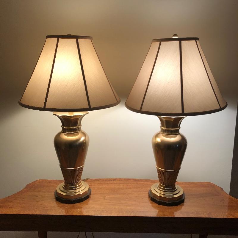 Handsome pair of matching brass lamps with matching dark cream shades that are in good shape. Timeless elegance to light up your space, these two beauties measure 34” tall and are approximately 7” wide across the base and are heavier than they look.