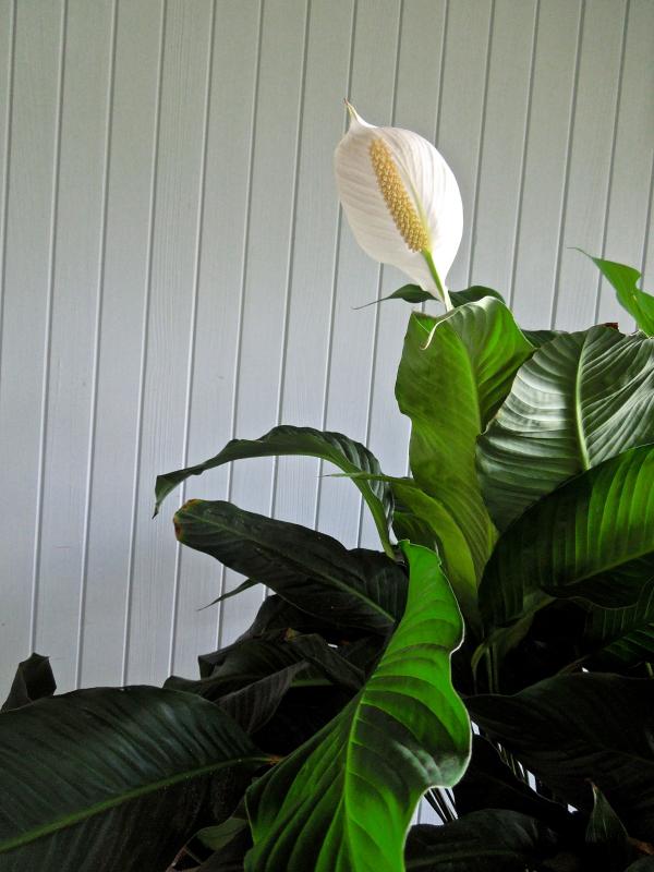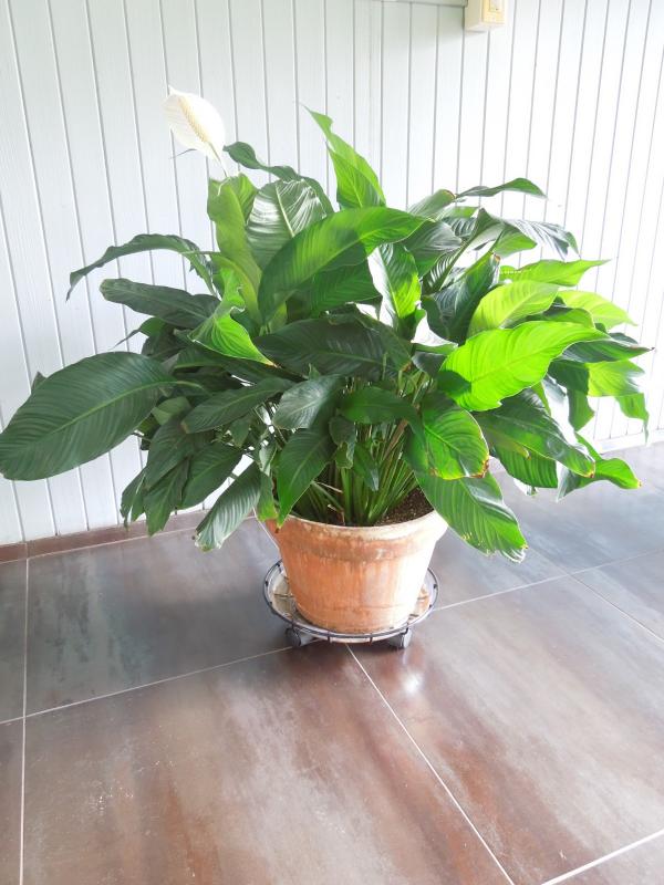 Larger Peace Lilly in 15" terra cotta planter on rolling stand. Has one bloom. Houseplant.