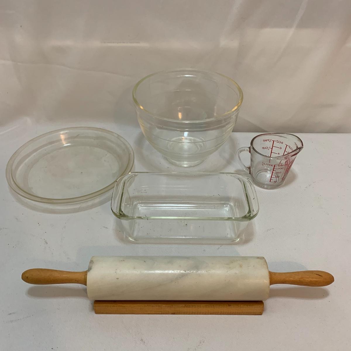 Any baker would love this lot! Included are four pieces of pyrex: a mixing bowl, a bread bowl, a shallow dish, and a mixing cup. Also included is this beautiful 10” Marble rolling pin that includes its own wooden cradle. Don’t pass on this lot!