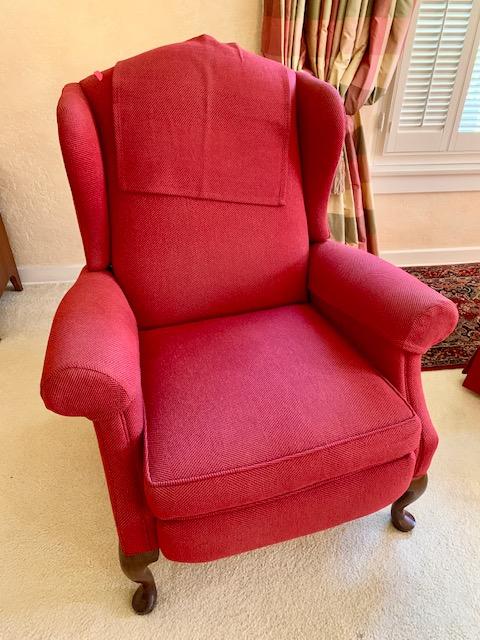 Recliner wing back chair, Queen Anne legs, leg rest pops up.