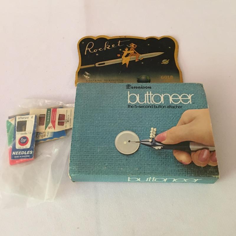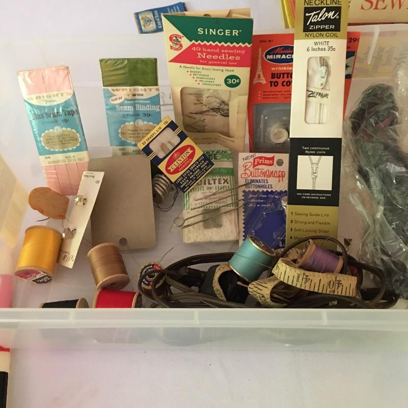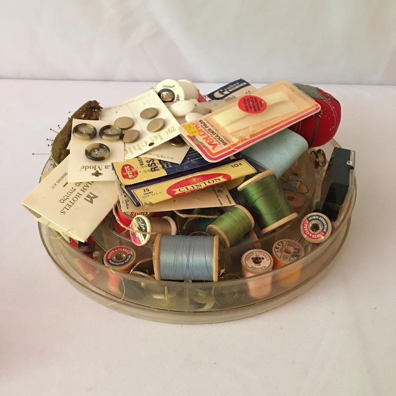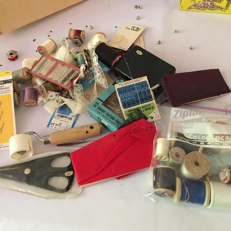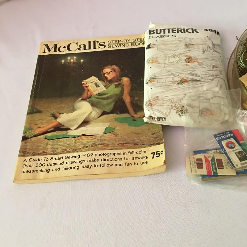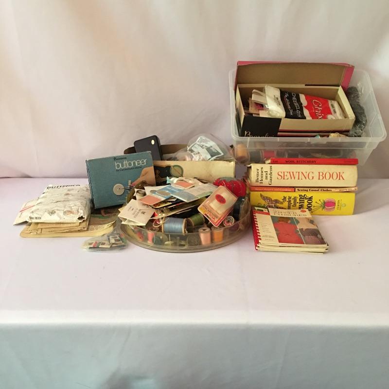 Sewing essentials. Lot includes books by Better Homes and Gardens, The Complete Family Sewing Book, a plethora of thread, buttons, needles, pin cushion, tape measure and more. For all you sewers out there yet his is a great array of sewing essentials.