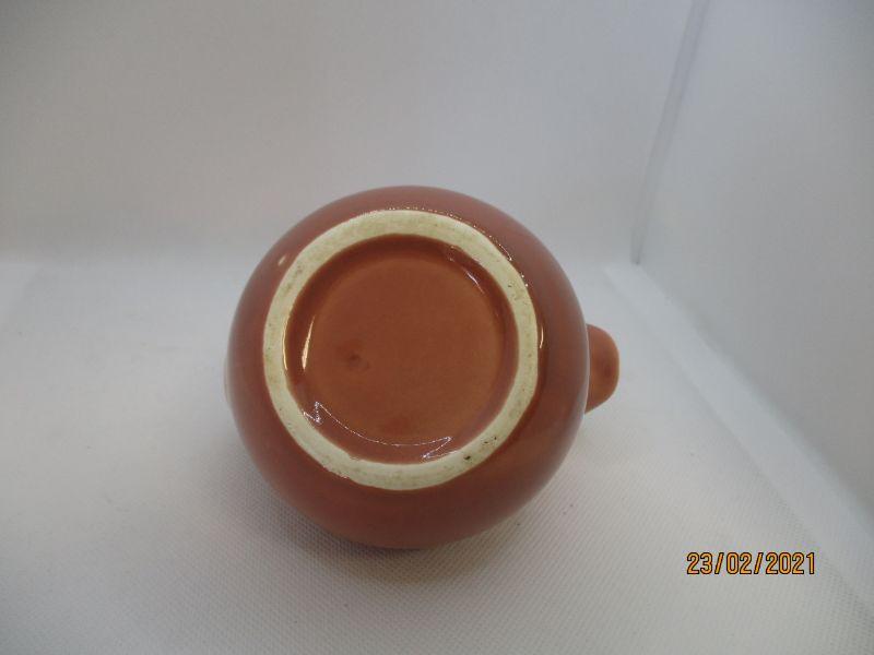 This isn't marked Fiesta, but it is in the same style. There is a spot on the lip that didn't get much color and the color is thin under the lip which makes me think that maybe this didn't pass inspection and that's why it isn't marked. If it is Fiesta, I think that this is the color "Paprika" which was made 2010-2016. It is about 4" tall and doesn't have any damage.