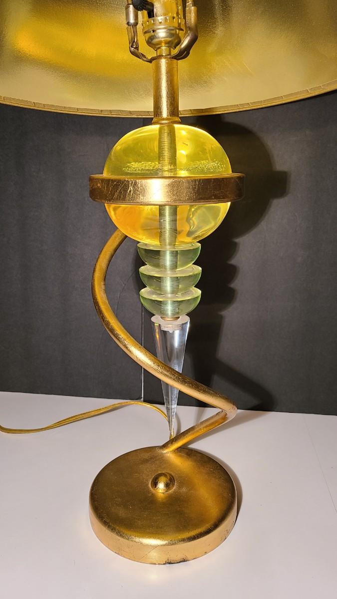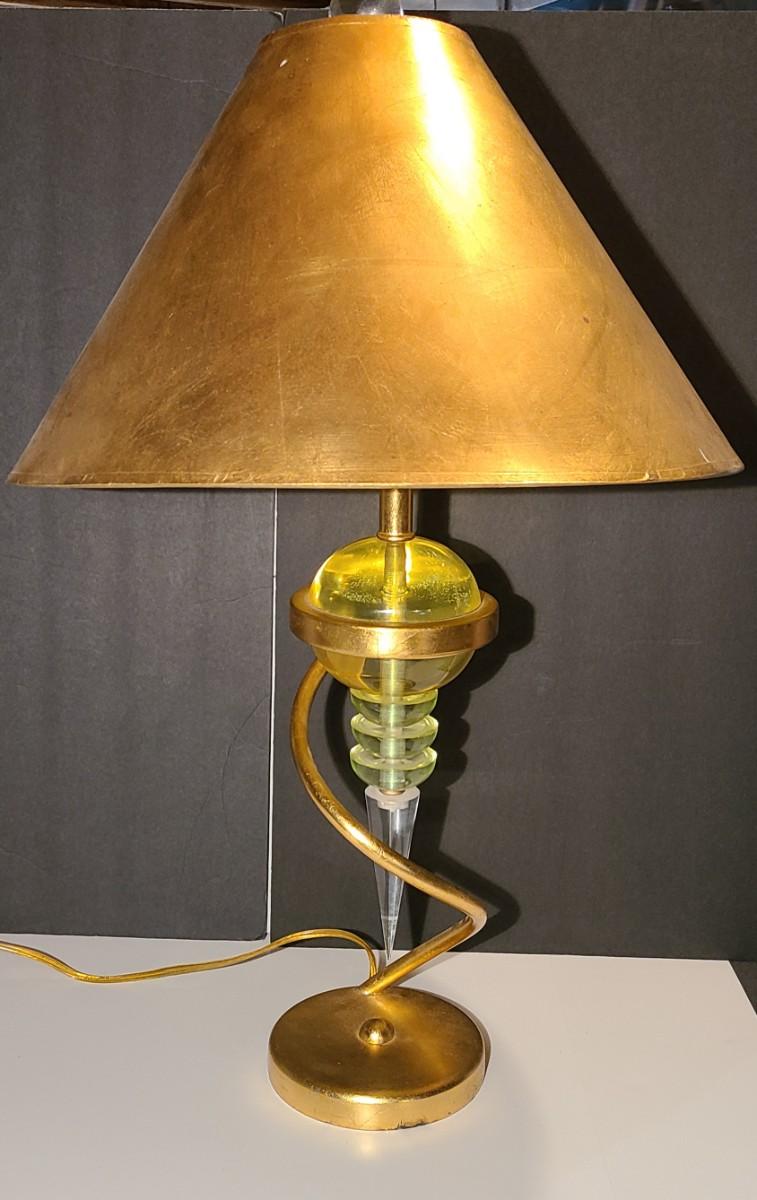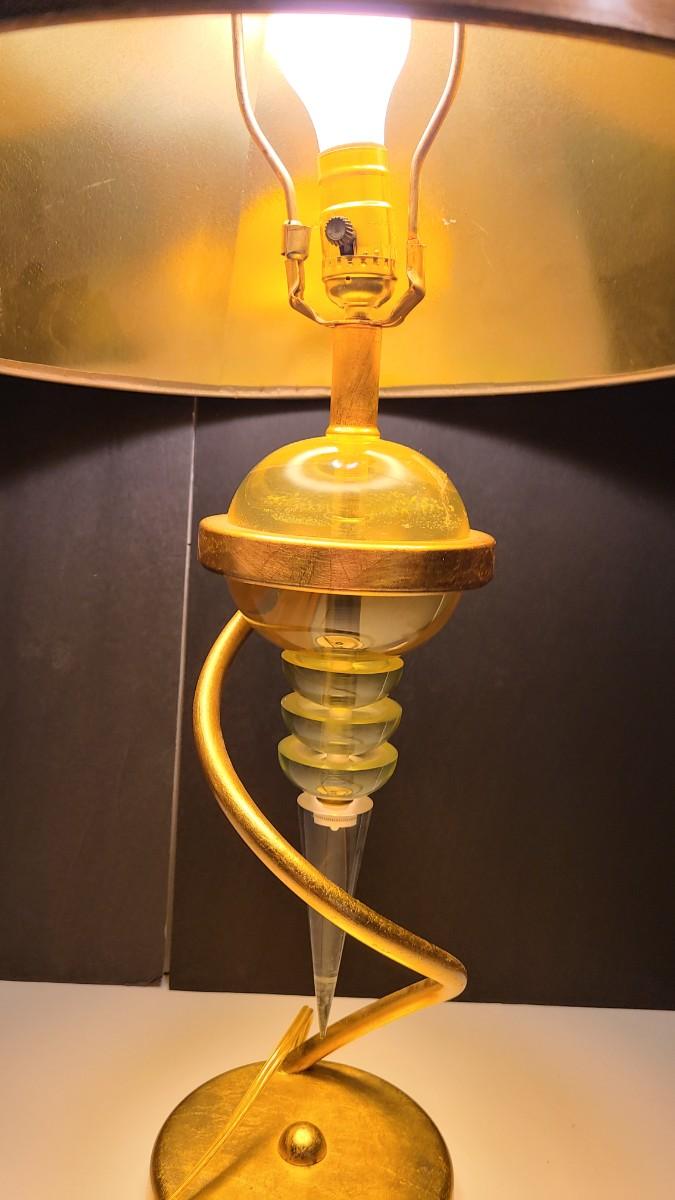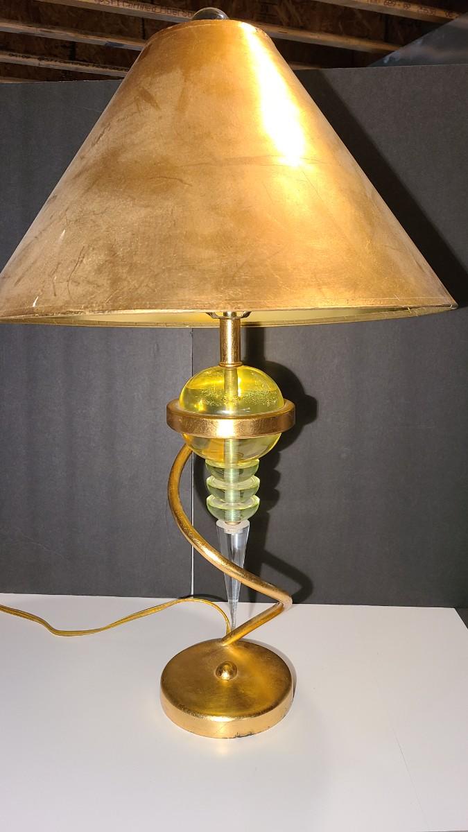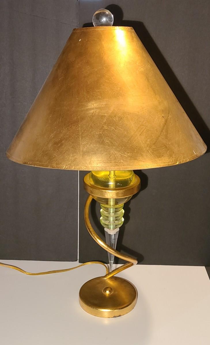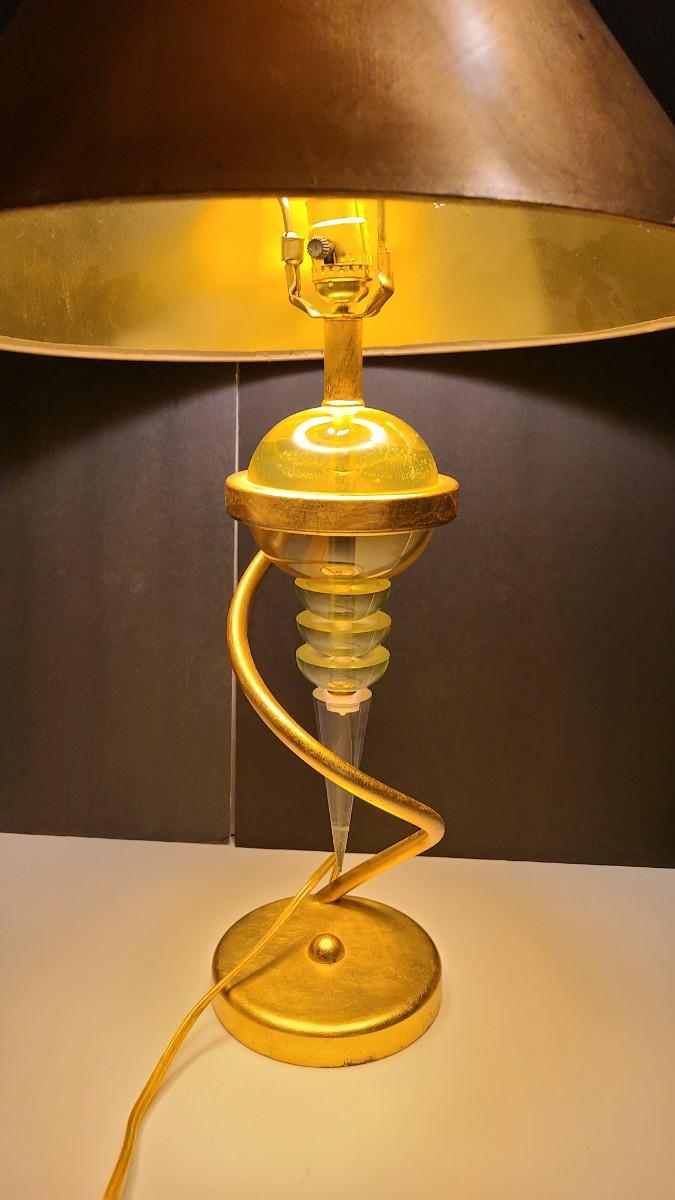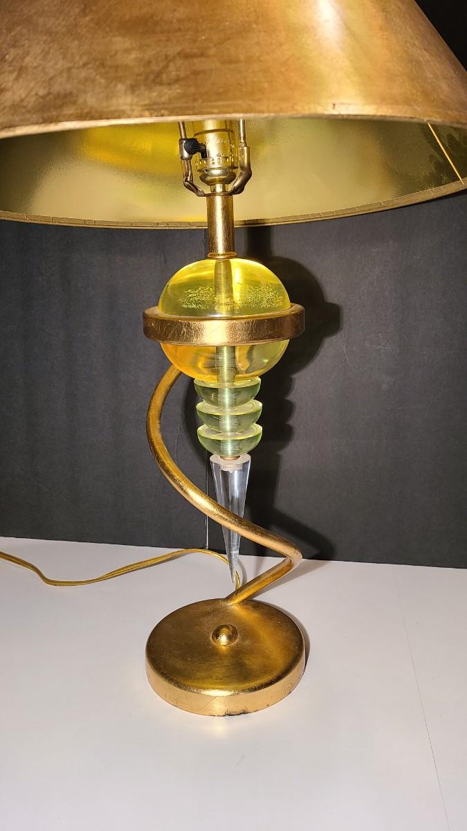 This is the coolest lamp. Looks to be made of acrylic or lucite. The base is metal and swirls up to hold lucite center. Ombre if yellows and whites as it descends down. The shade is gold and interior is gold also so lighted it gives a very unique yellow gold glow. Underwriters laboratories stamp. It does work, but brass light bulb holder/ fixture is loose in cradle and will need to be stabilized, or left alone if for personal use. Very unique with Retro, vintage space age feel!! This is solid and a little heavy, larger than appears in pics. Please see all pictures for content of the lot, condition of the lot, and measurements if taken. Pictures are the best representation of the items listed and items are untested unless indicated in description. Thank you for looking and have fun bidding!