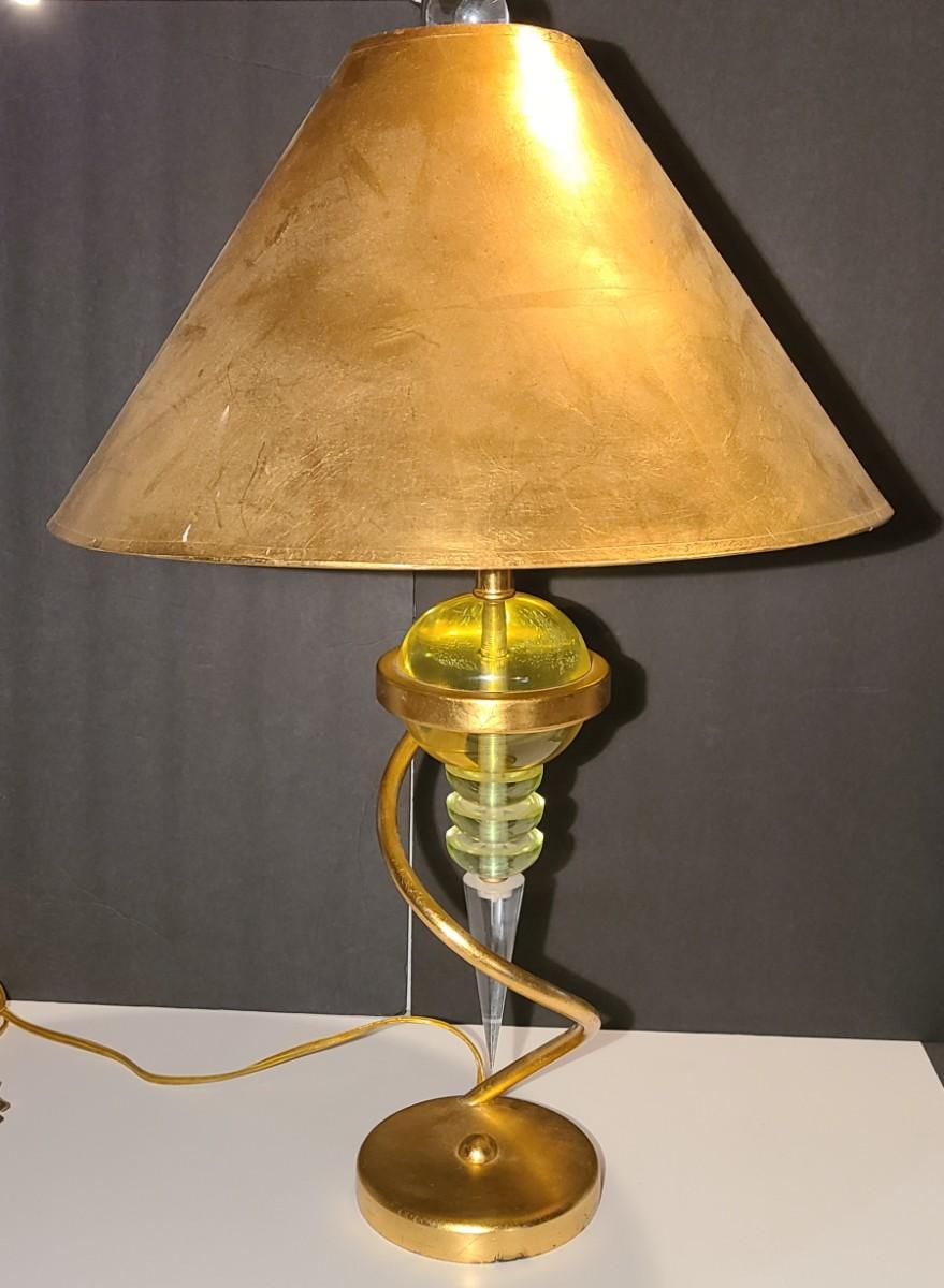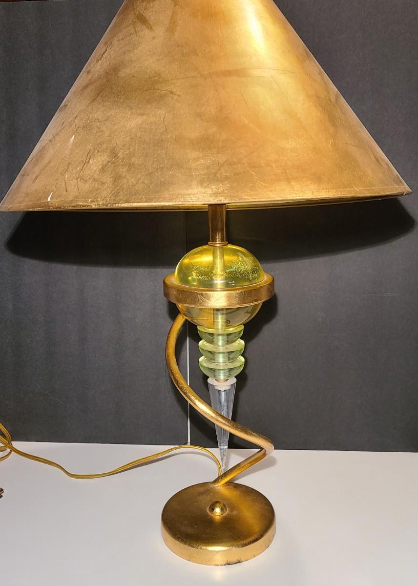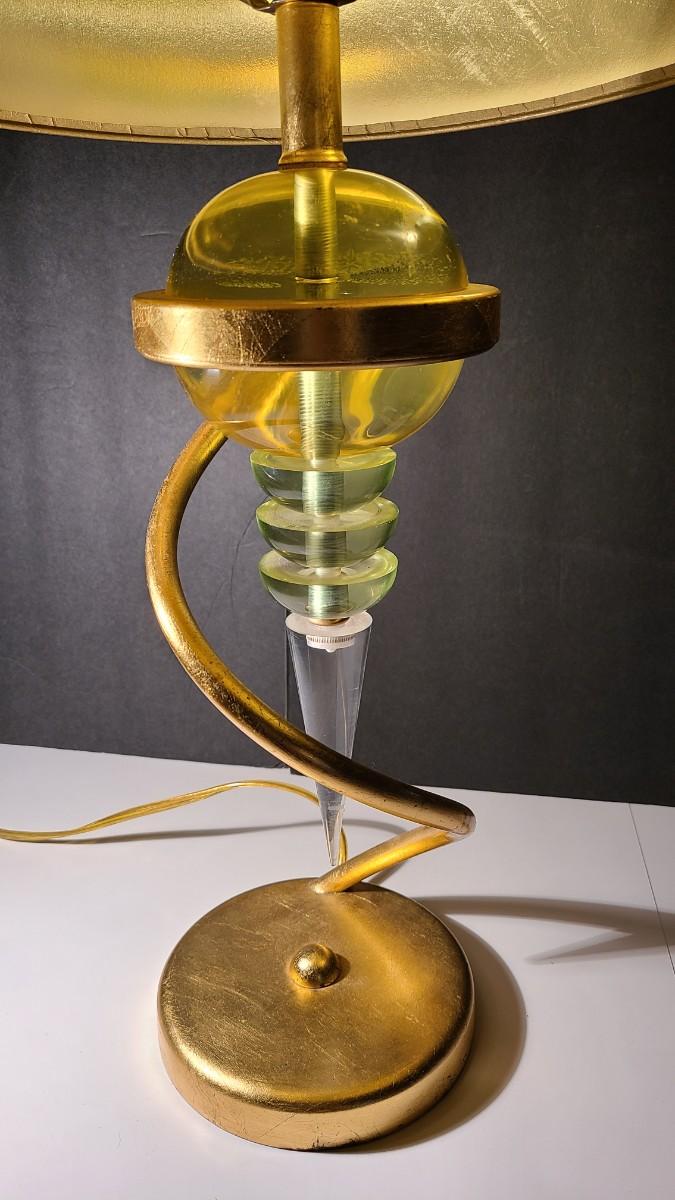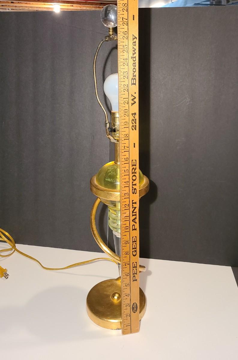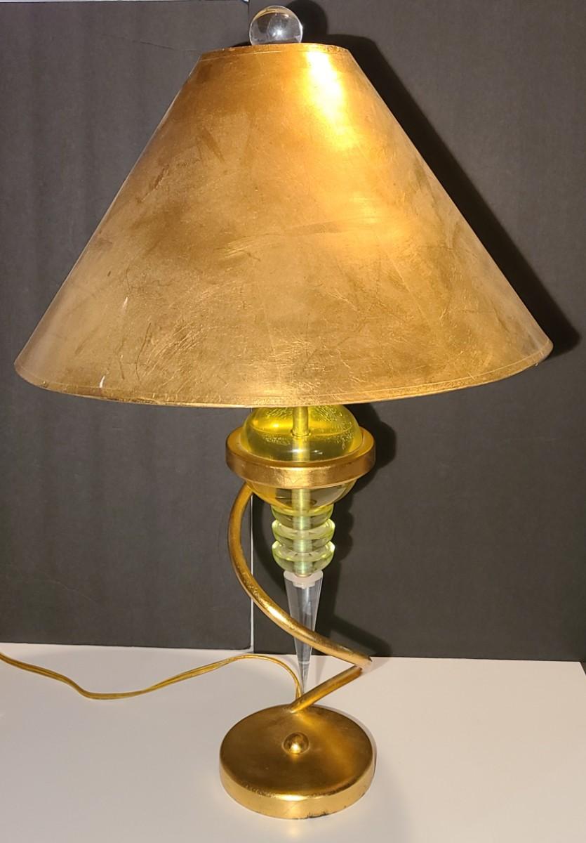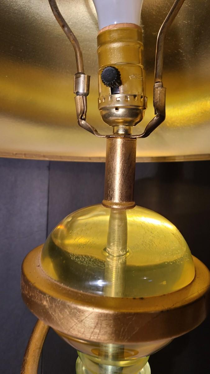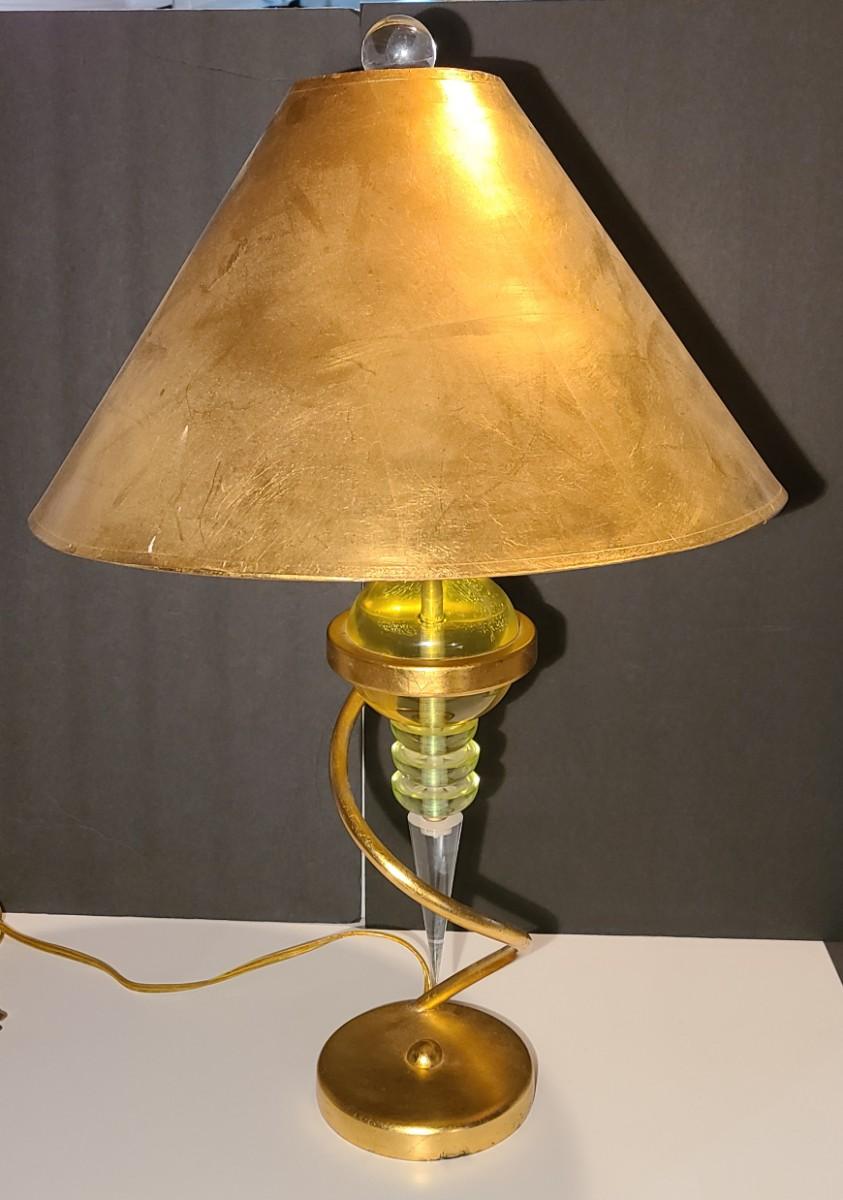 This is the coolest lamp. Looks to be made of acrylic or lucite. The base is metal and swirls up to hold lucite center. Ombre if yellows and whites as it descends down. The shade is gold and interior is gold also so lighted it gives a very unique yellow gold glow. Underwriters laboratories stamp. It does work, but brass light bulb holder/ fixture is loose in cradle and will need to be stabilized, or left alone if for personal use. Very unique with Retro, vintage space age feel!! This is solid and a little heavy, larger than appears in pics. Please see all pictures for content of the lot, condition of the lot, and measurements if taken. Pictures are the best representation of the items listed and items are untested unless indicated in description. Thank you for looking and have fun bidding!