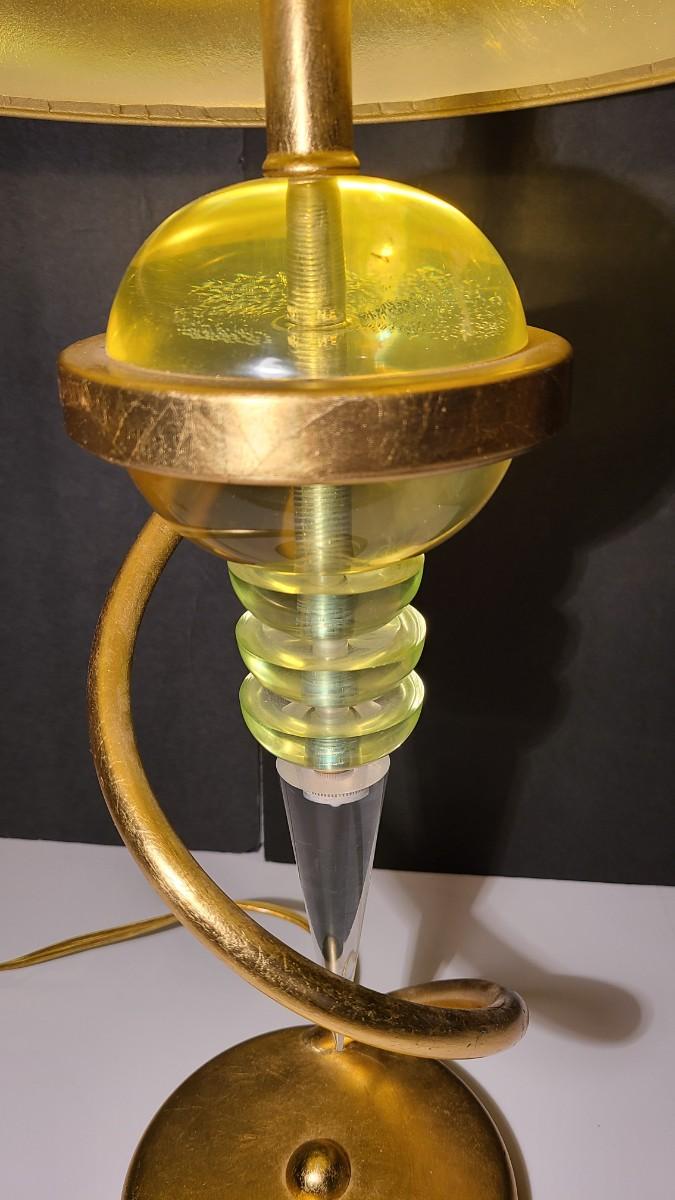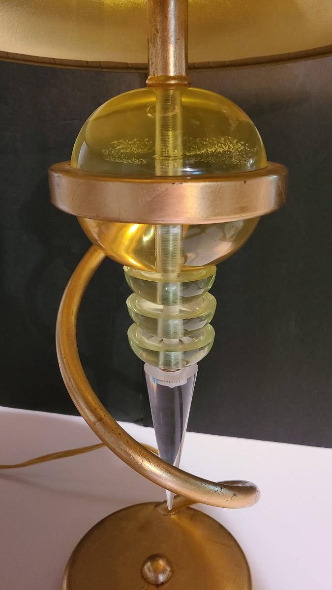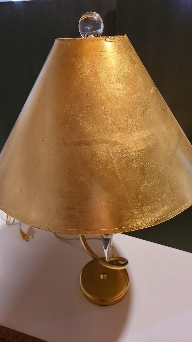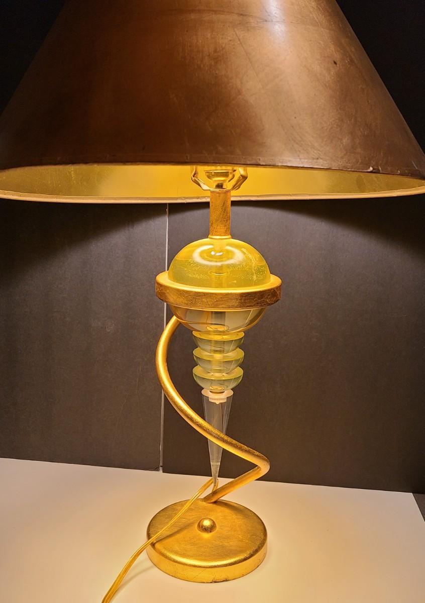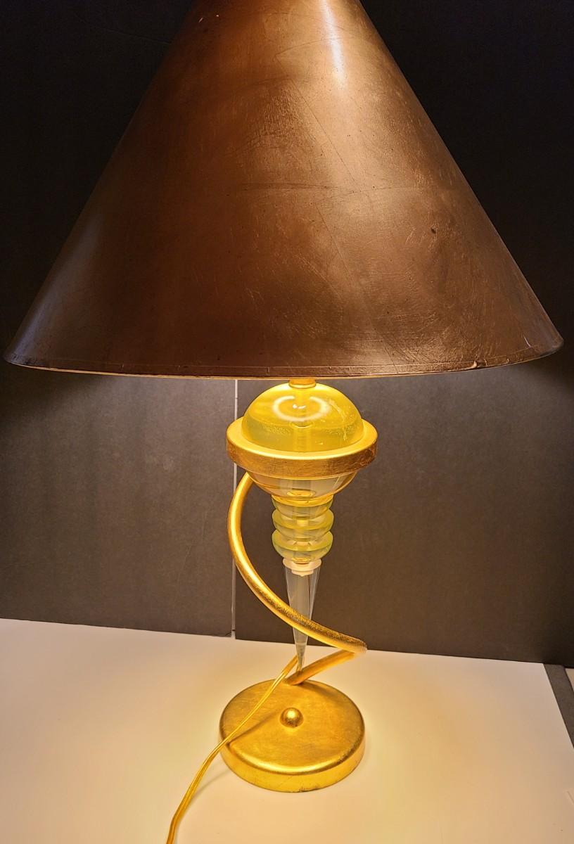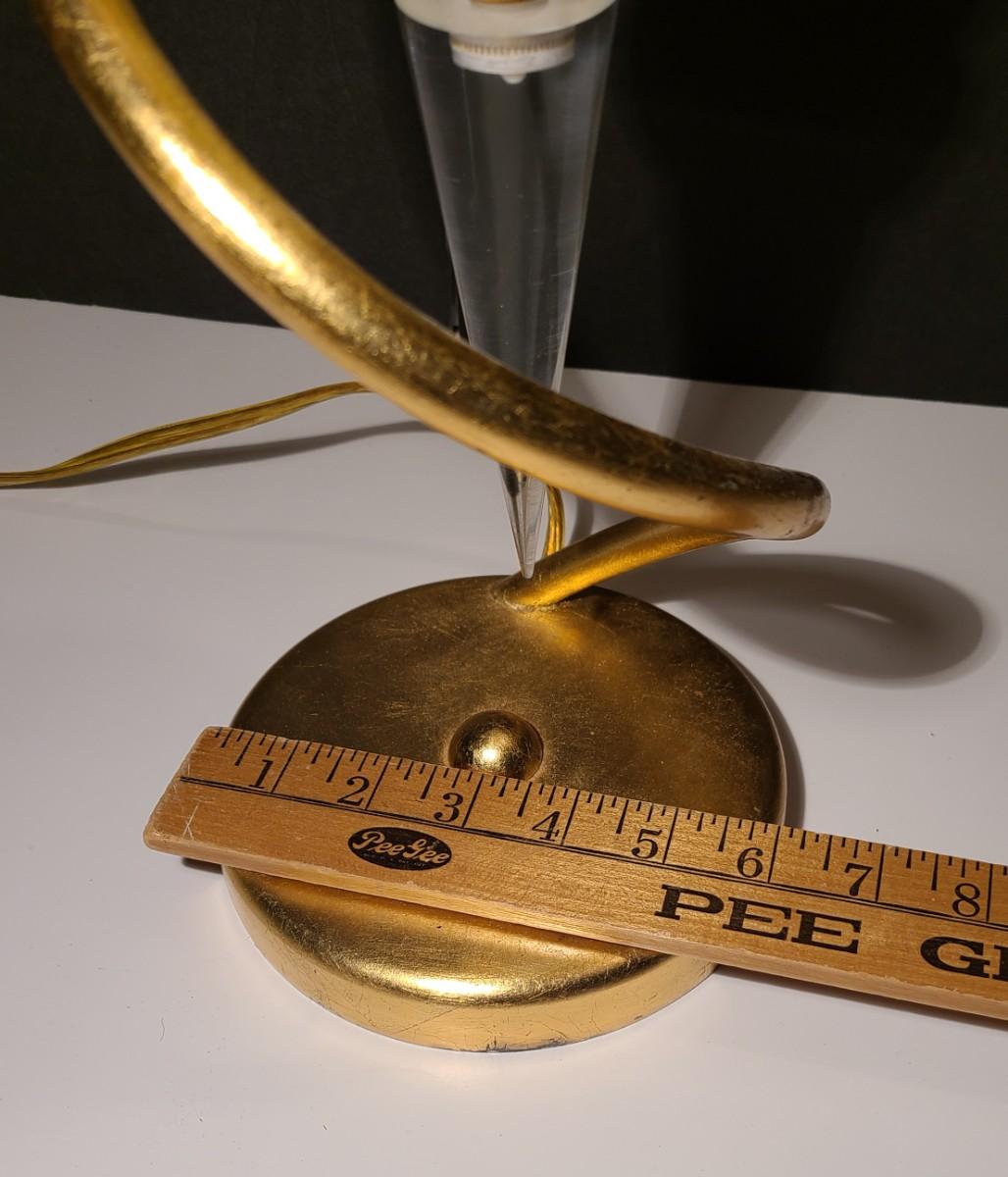 This is the coolest lamp. Looks to be made of acrylic or lucite. The base is metal and swirls up to hold lucite center. Ombre if yellows and whites as it descends down. The shade is gold and interior is gold also so lighted it gives a very unique yellow gold glow. Underwriters laboratories stamp. It does work, but brass light bulb holder/ fixture is loose in cradle and will need to be stabilized, or left alone if for personal use. Very unique with Retro, vintage space age feel!! This is solid and a little heavy, larger than appears in pics. Please see all pictures for content of the lot, condition of the lot, and measurements if taken. Pictures are the best representation of the items listed and items are untested unless indicated in description. Thank you for looking and have fun bidding!