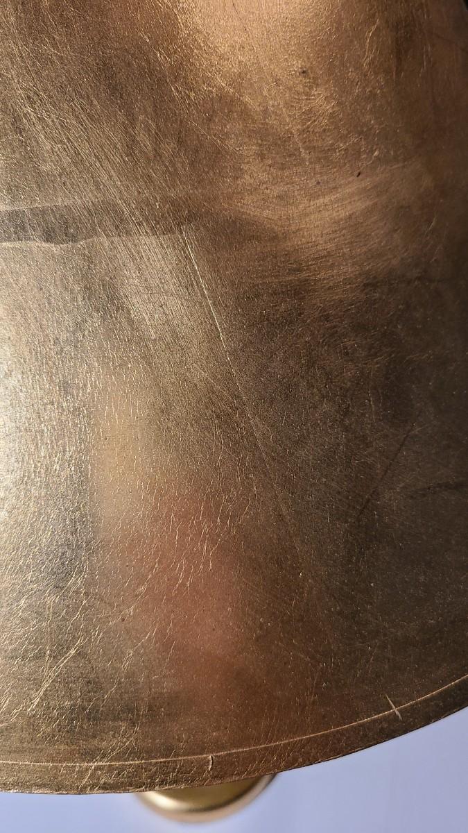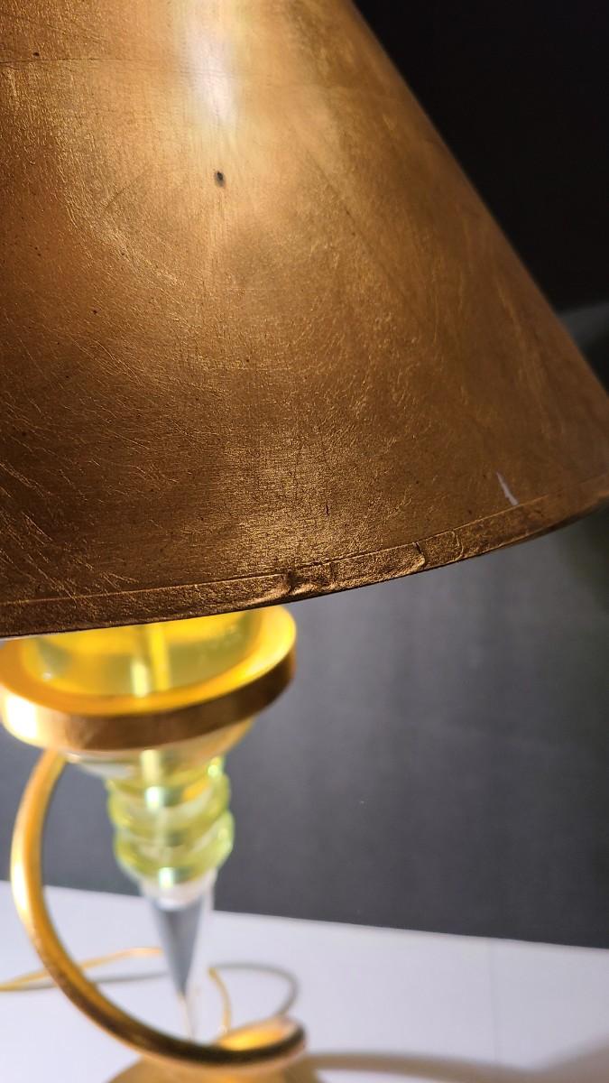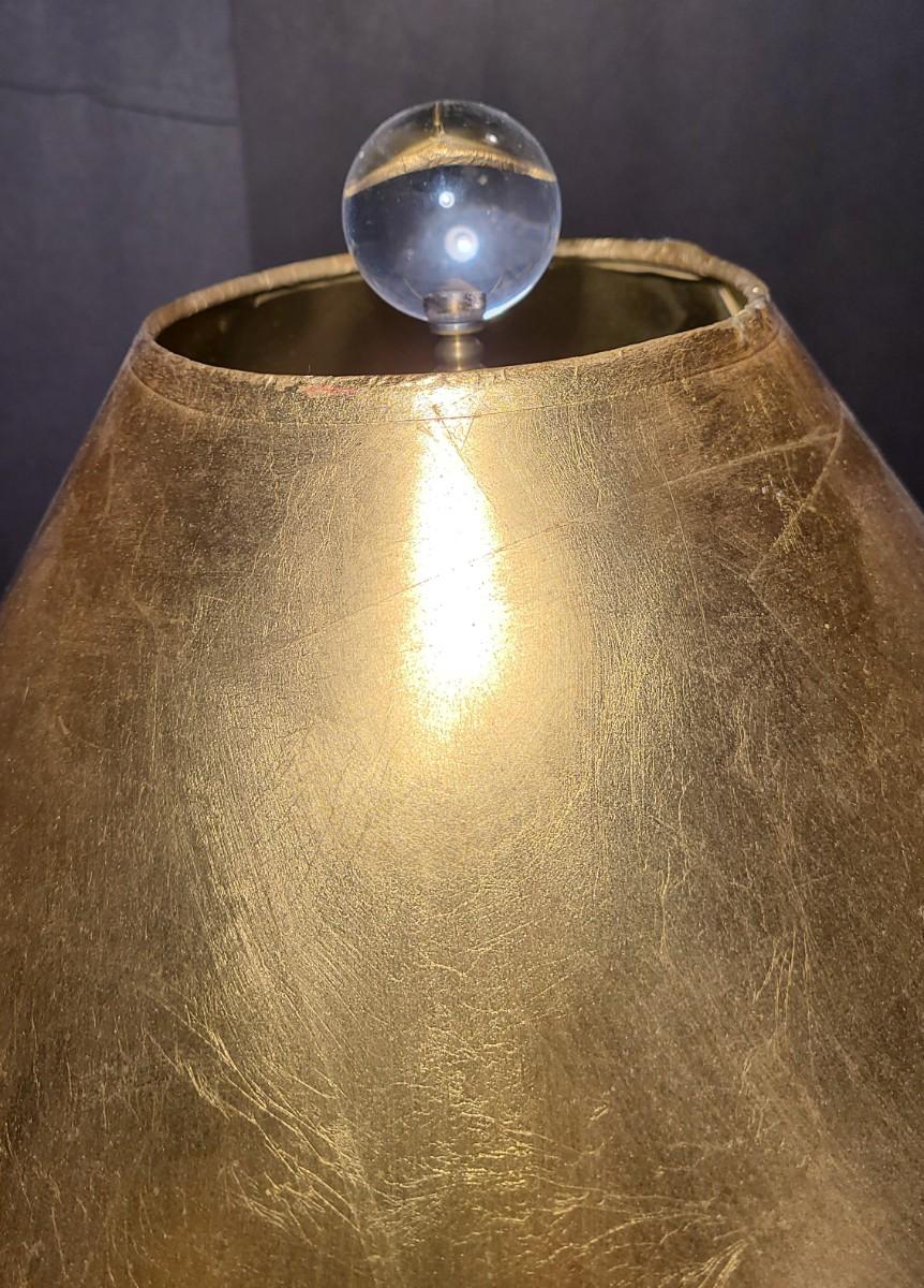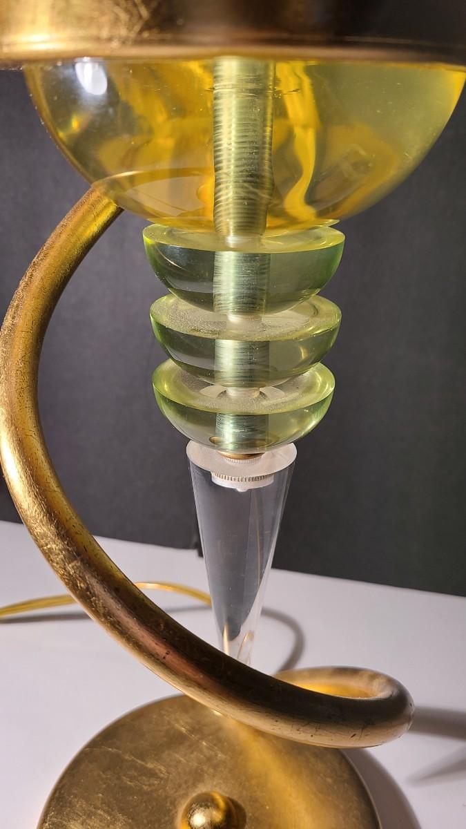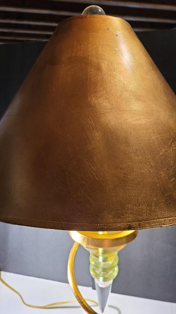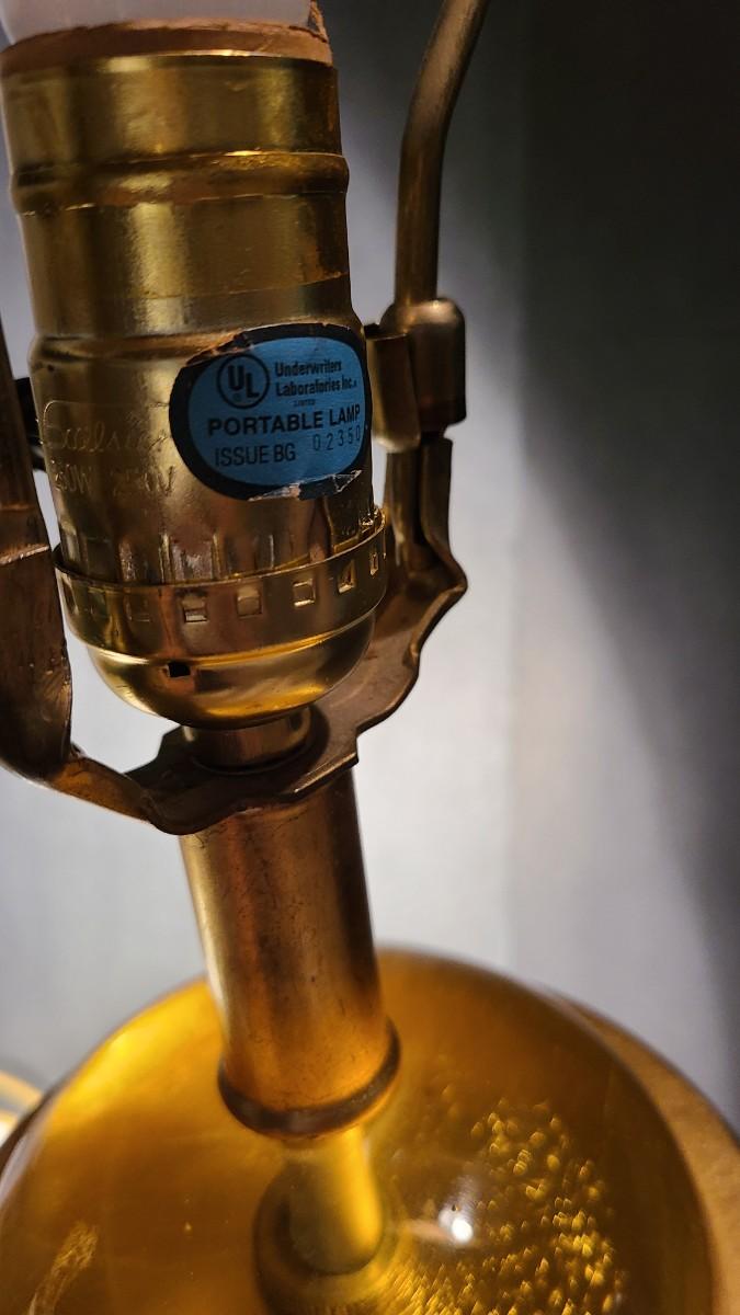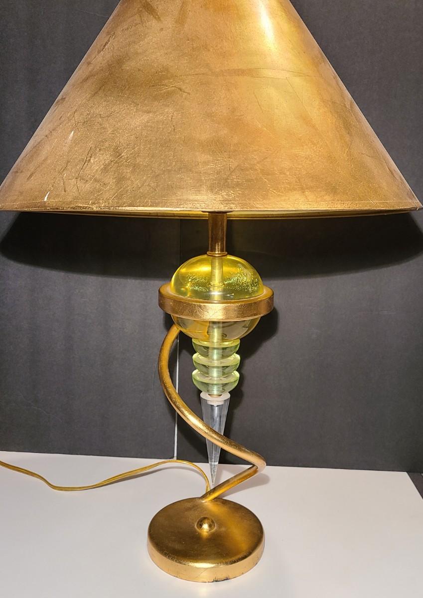This is the coolest lamp. Looks to be made of acrylic or lucite. The base is metal and swirls up to hold lucite center. Ombre if yellows and whites as it descends down. The shade is gold and interior is gold also so lighted it gives a very unique yellow gold glow. Underwriters laboratories stamp. It does work, but brass light bulb holder/ fixture is loose in cradle and will need to be stabilized, or left alone if for personal use. Very unique with Retro, vintage space age feel!! This is solid and a little heavy, larger than appears in pics. Please see all pictures for content of the lot, condition of the lot, and measurements if taken. Pictures are the best representation of the items listed and items are untested unless indicated in description. Thank you for looking and have fun bidding!