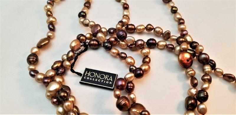 Beautiful strand of natural Honora Pearls in muted, rich fall colors. Measures about 58 inches long, sterling clasp. Easy to double. You'll love them. Has original tag attached. No box.