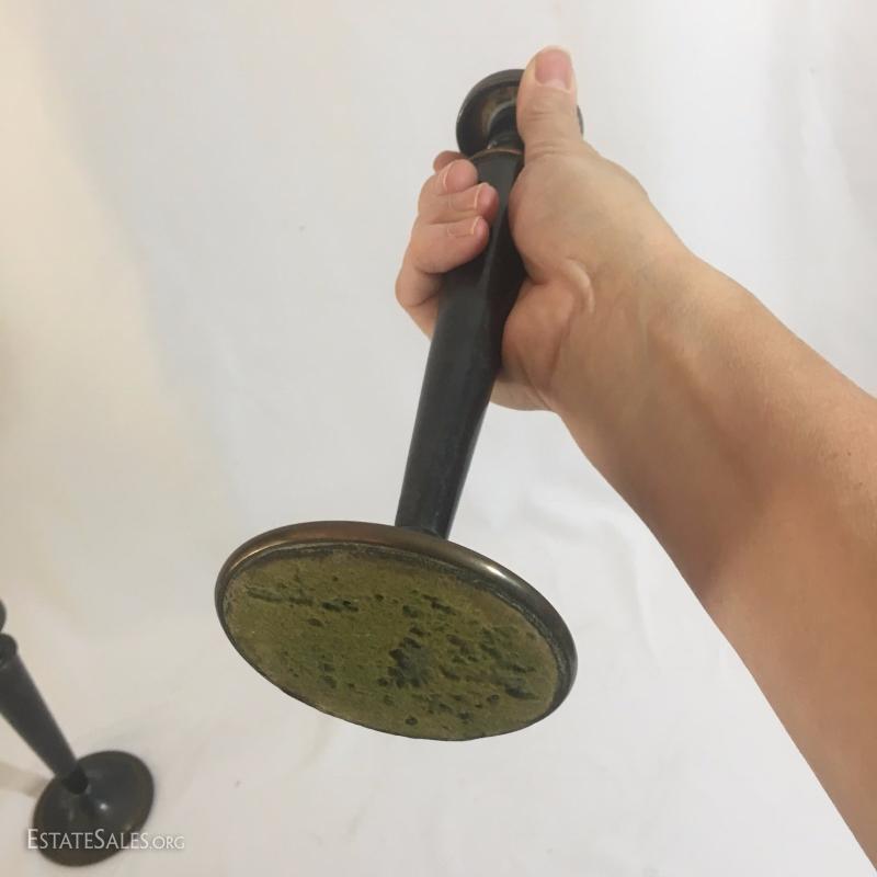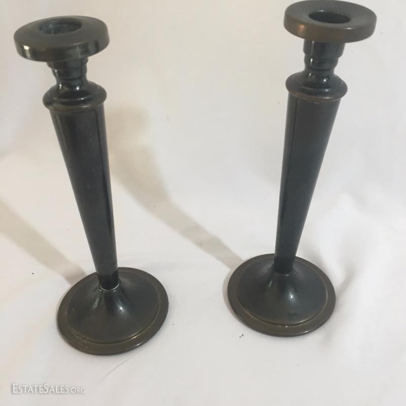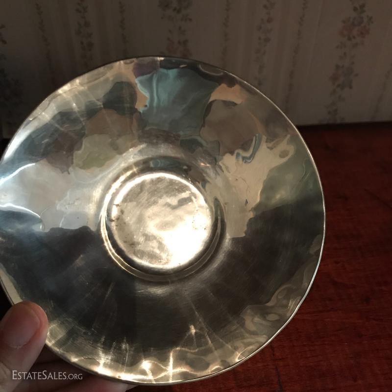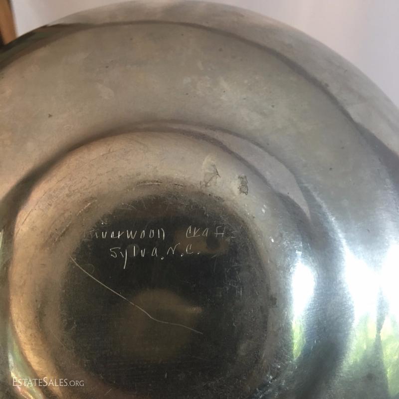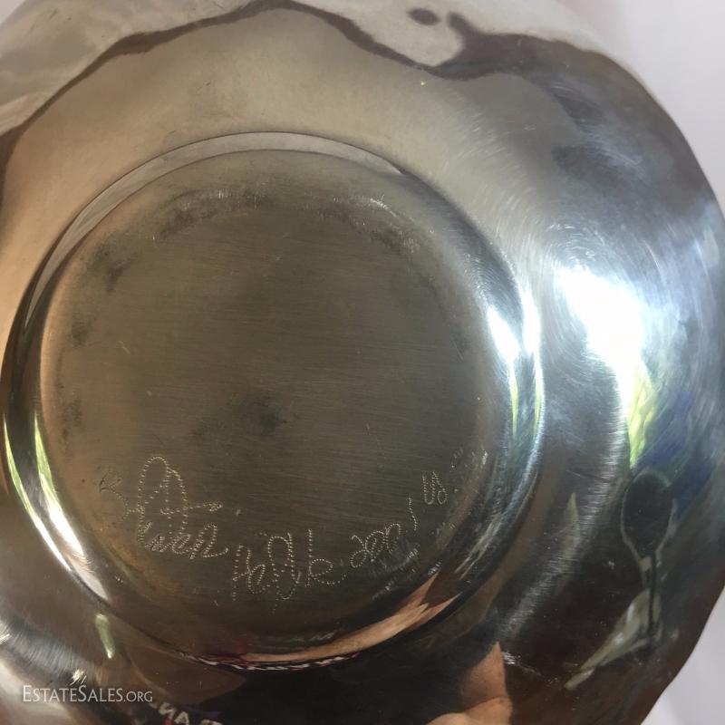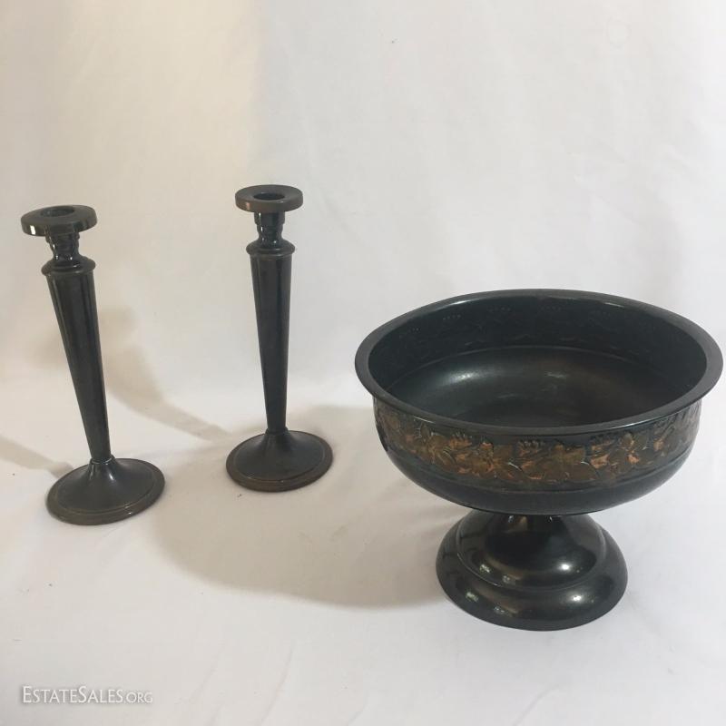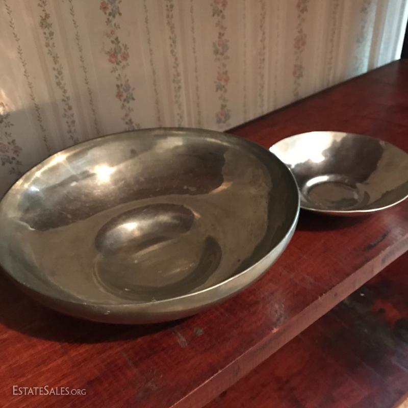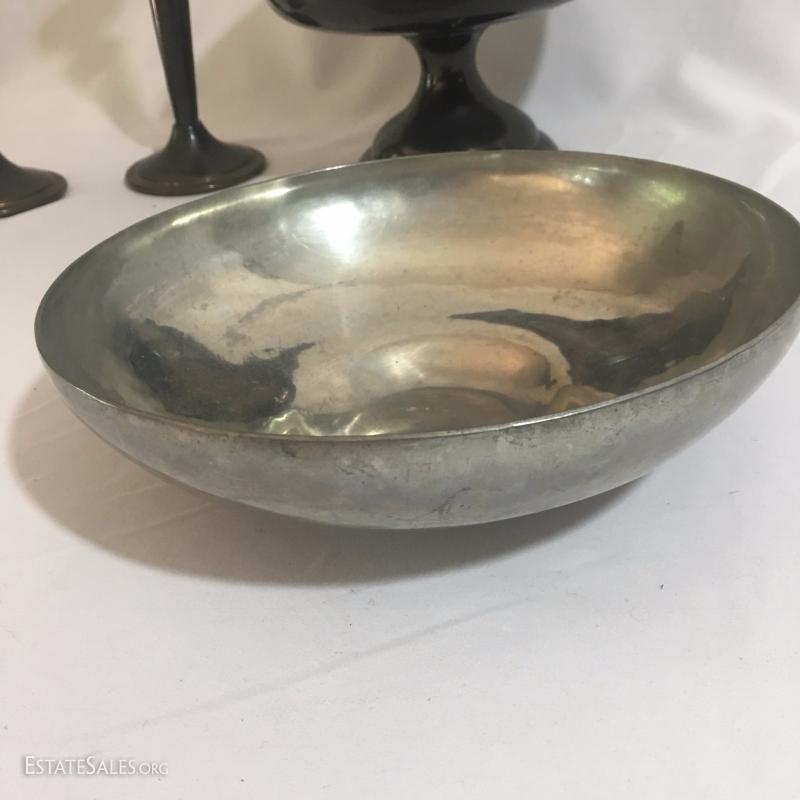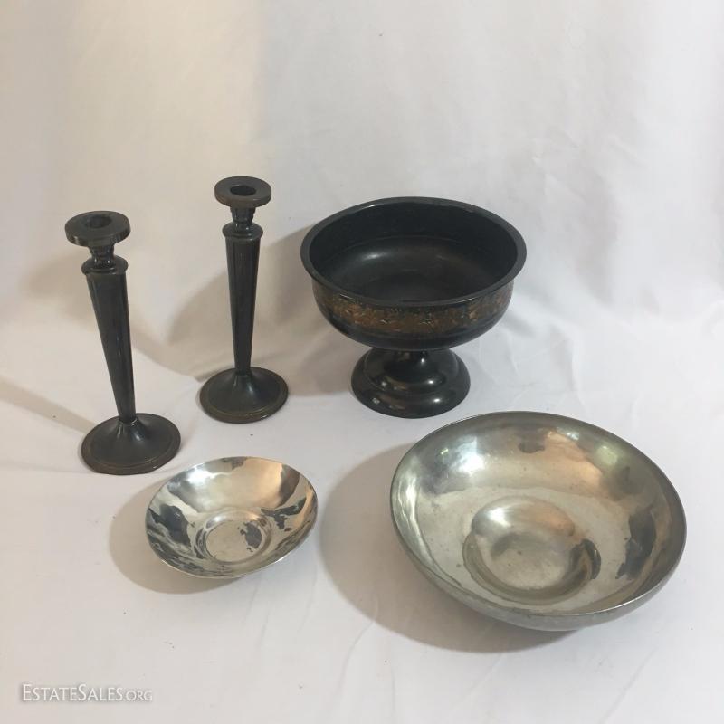 Two artist signed silver bowls. Biggest is 9"diameter by 3"tall. 2 metal candle sticks. 9"tall. One matching pedestal bowl. 8.5"diameter by 6.5" tall.