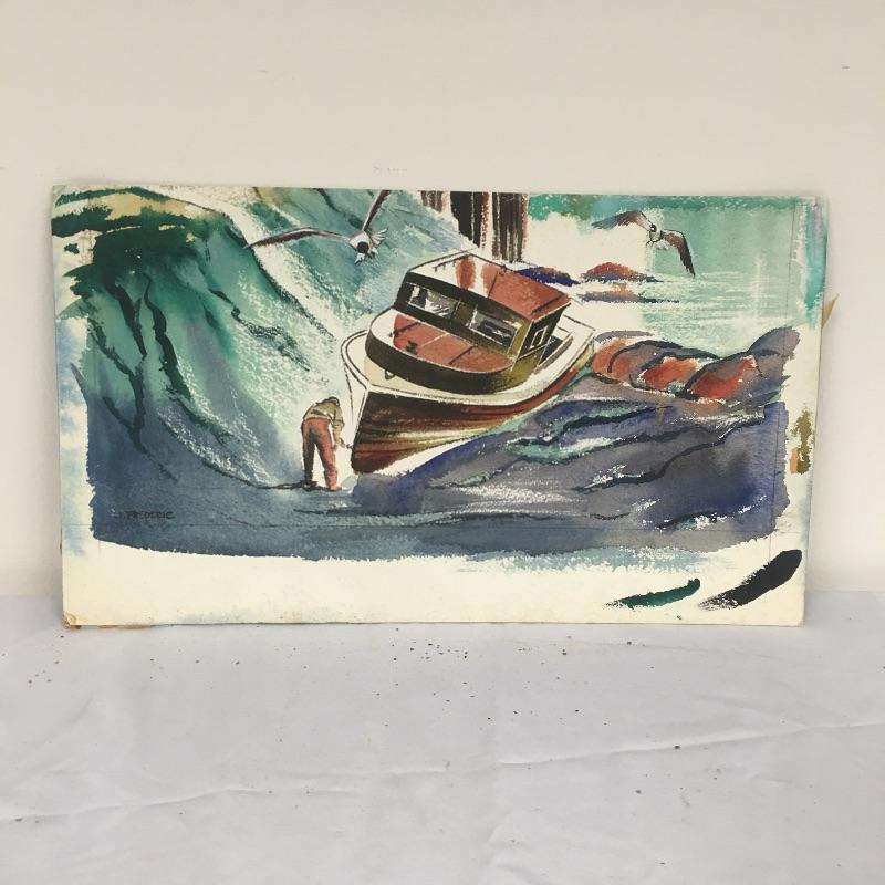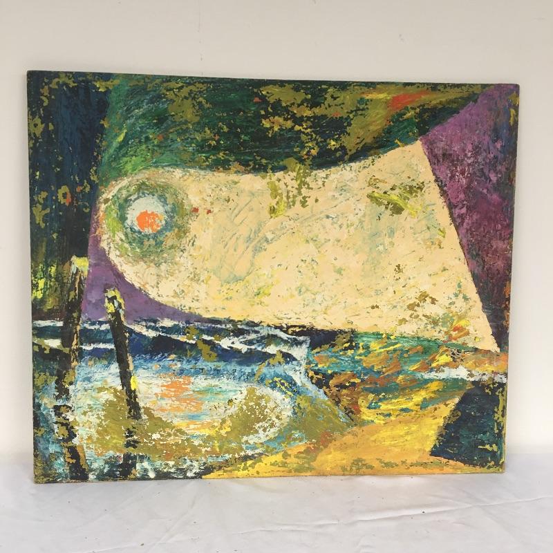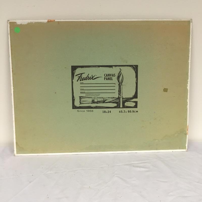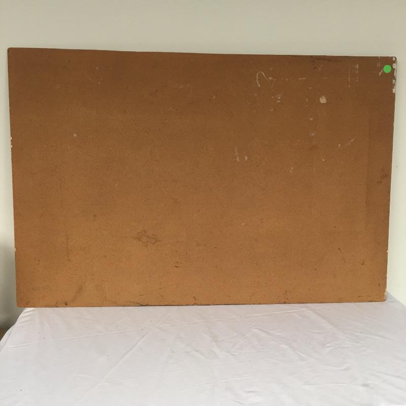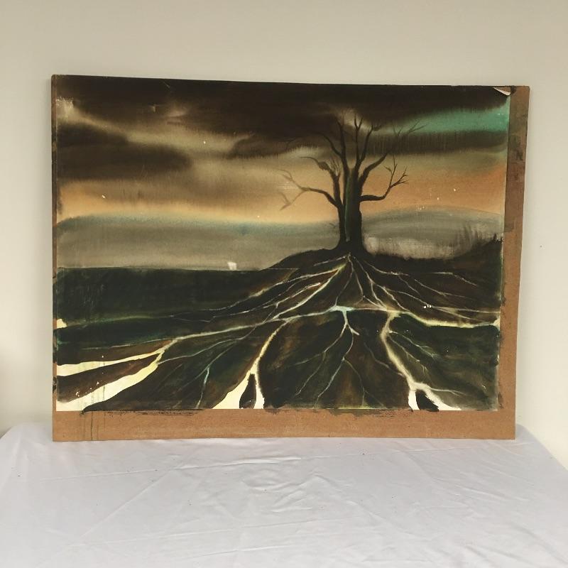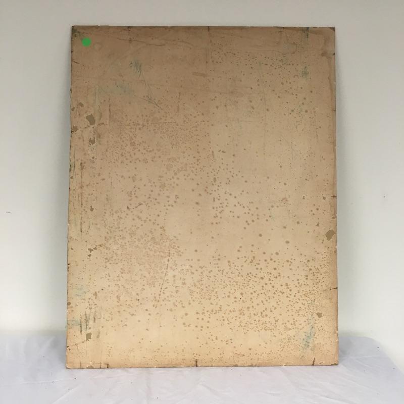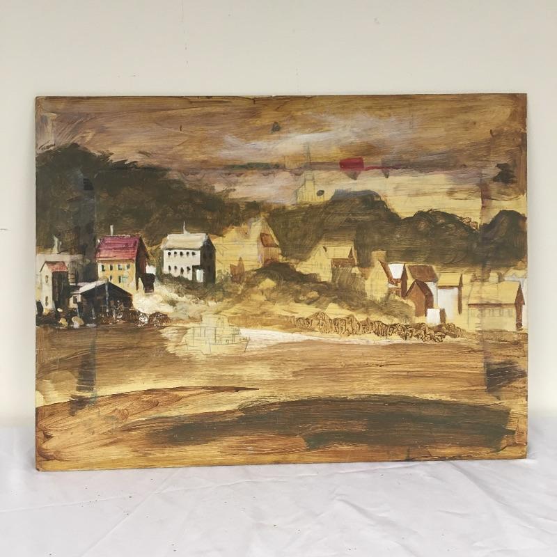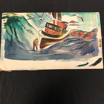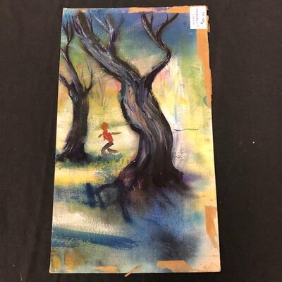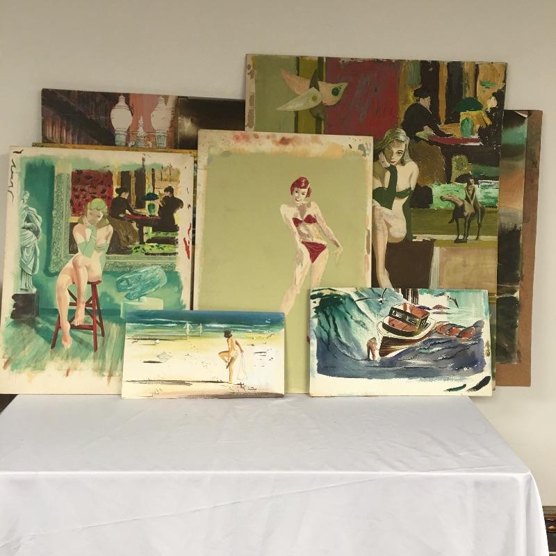 Largest piece measures 24” x 36. There is a (13” x 7”) double-sided painting that has a picture of a naked child on a beach on one side and a wooded scene on the other. And another double-sided, showing a ship on one side and a large tree on the other.