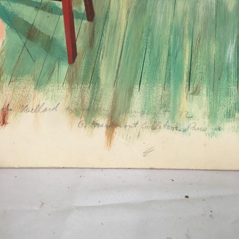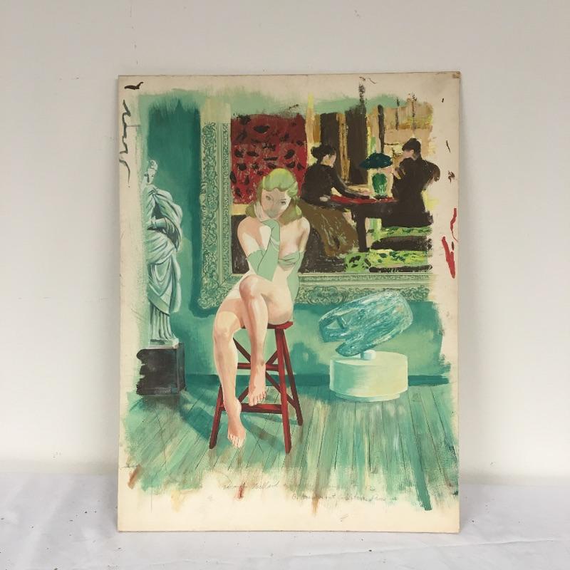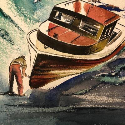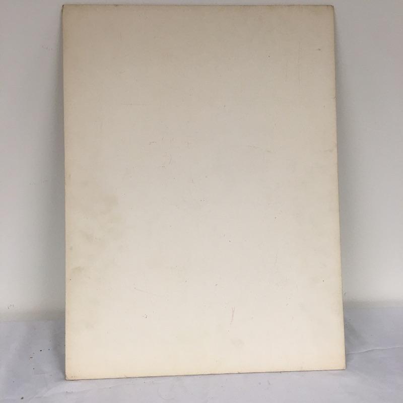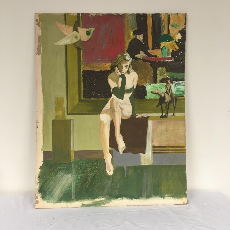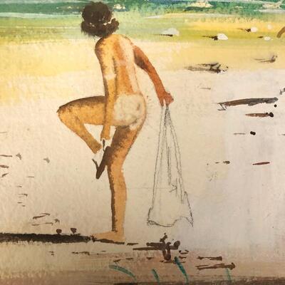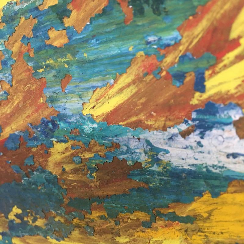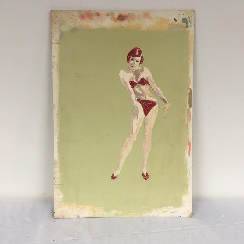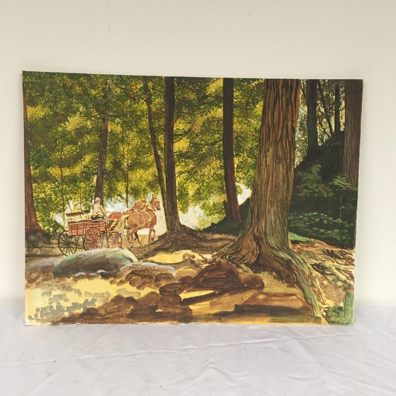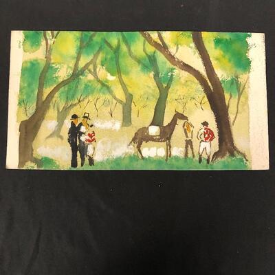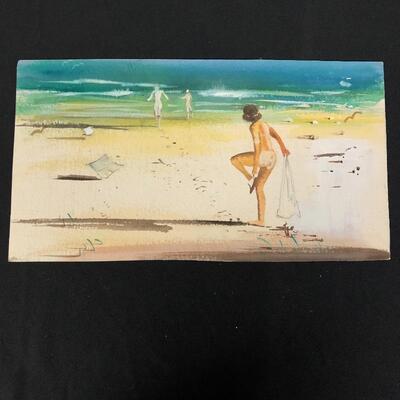 Largest piece measures 24” x 36. There is a (13” x 7”) double-sided painting that has a picture of a naked child on a beach on one side and a wooded scene on the other. And another double-sided, showing a ship on one side and a large tree on the other.