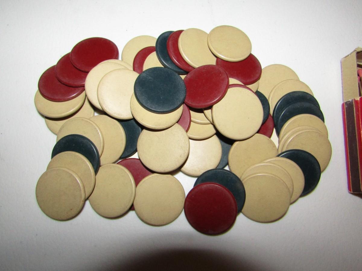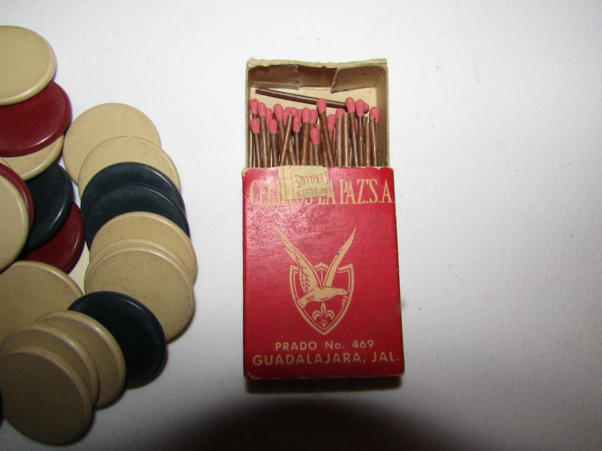 VINTAGE CLAY POKER CHIPS AND A BOX OF VERY OLD MATCHES